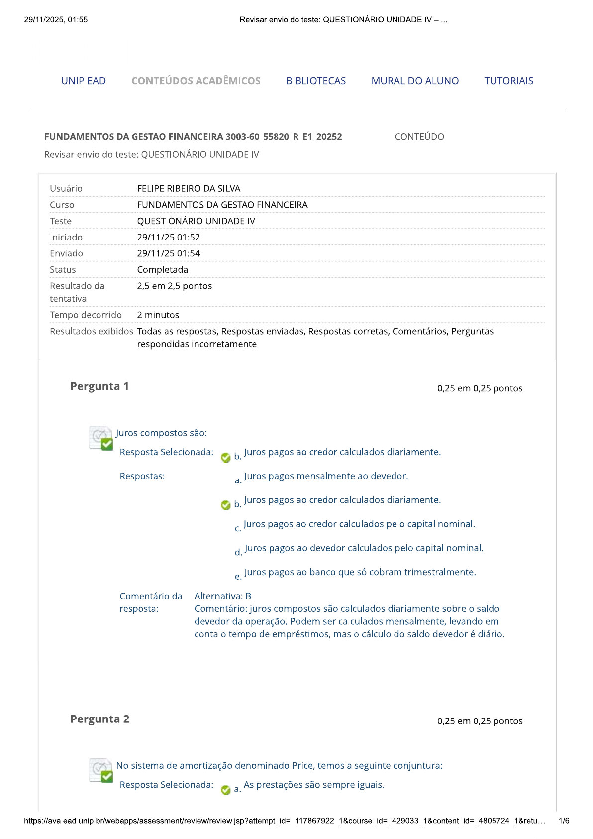 29/11/2025, 01:55 Revisar envio do teste: QUESTIONÁRIO UNIDADE IV UNIP EAD CONTEÚDOS ACADÊMICOS BIBLIOTECAS MURAL DO ALUNO TUTORIAIS FUNDAMENTOS DA GESTAO FINANCEIRA 3003-60_55820_R_E1_20252 CONTEÚDO Revisar envio do teste: QUESTIONÁRIO UNIDADE IV Usuário FELIPE RIBEIRO DA SILVA Curso FUNDAMENTOS DA GESTAO FINANCEIRA Teste QUESTIONÁRIO UNIDADE IV Iniciado 29/11/25 01:52 Enviado 29/11/25 01:54 Status Completada Resultado da 2,5 em 2,5 pontos tentativa Tempo decorrido 2 minutos Resultados exibidos Todas as respostas, Respostas enviadas, Respostas corretas, Comentários, Perguntas respondidas incorretamente Pergunta 1 0,25 em 0,25 pontos Juros compostos são: Resposta Selecionada: b. Juros pagos ao credor calculados diariamente. Respostas: a. Juros pagos mensalmente ao devedor. b. Juros pagos ao credor calculados diariamente. Juros pagos ao credor calculados pelo capital nominal. d. Juros pagos ao devedor calculados pelo capital nominal. Juros pagos ao banco que só cobram trimestralmente. e. Comentário da Alternativa: resposta: Comentário: juros compostos são calculados diariamente sobre saldo devedor da operação. Podem ser calculados mensalmente, levando em conta tempo de empréstimos, mas cálculo do saldo devedor é diário. Pergunta 2 0,25 em 0,25 pontos No sistema de amortização denominado Price, temos a seguinte conjuntura: Resposta Selecionada: a. As prestações são sempre iguais. 1/629/11/2025, 01:55 Revisar envio do teste: QUESTIONÁRIO UNIDADE IV Respostas: a. As prestações são sempre iguais. b. Paga-se primeiro os juros e depois capital. Paga-se juros e capital de forma concomitante. d. Paga-se primeiro capital e depois os juros. e. Paga-se apenas uma prestação no vencimento do contrato. Comentário da Alternativa: A resposta: Comentário: no sistema Price, todas as prestações pagas são iguais. Juros e capital passam por uma fórmula em que os juros são calculados precocemente e pagamento deles é de forma regressiva, enquanto o capital é pago de forma progressiva. Pergunta 3 0,25 em 0,25 pontos Nos computadores quando tratamos de periféricos como dispositivo de entrada (input), podemos citar: Resposta Selecionada: Teclado. a. Respostas: Teclado. a. b. Impressora. Monitor. d. Programa. e. Hardware. Comentário Alternativa: A da resposta: Comentário: os periféricos são os dispositivos que trabalham em conjunto com computador. Como dispositivos de entrada (input) podemos citar: teclado, mouse, multimídia, instrumentos musicais, dispositivos de reconhecimento de voz, para digitalização de imagens e leituras de códigos de barra, câmeras, filmadora, leitores óticos, microfones e outros. Pergunta 4 0,25 em 0,25 pontos computador tem a capacidade de processar os dados. seu trabalho fundamental é realizado pelos componentes da Unidade Central de Processamento, conhecida como UCP a qual é associada a três elementos: 2/629/11/2025, 01:55 Revisar envio do teste: QUESTIONÁRIO UNIDADE IV Resposta b. Selecionada: A Unidade de Aritmética e Lógica (UAL), a Unidade de Controle (UC) e as Áreas de Registro (Ars). Respostas: Área de feedback, área de Just in time e programa Orkut. a. b. A Unidade de Aritmética e Lógica (UAL), a Unidade de Controle (UC) e as Áreas de Registro (Ars). Unidade Matemática Financeira, a Unidade de Aritmética e Lógica (UAL) e a Unidade de Controle (UC). d. A Unidade de Aritmética e Lógica (UAL), a Unidade de Resgate Controle (UR) e as Áreas de Registro (Ars). e. A Unidade de Aritmética e Lógica (UAL), a Unidade de Controle (UC) e as Áreas de Resgate (Ars). Comentário Alternativa: da resposta: Comentário: computador tem a capacidade de processar os dados é um aspecto fundamental realizado pelos componentes da Unidade Central de Processamento, conhecida como UCP associados a três elementos: A Unidade de Aritmética e Lógica (UAL), a Unidade de Controle (UC) e as Áreas de Registro (Ars). Pergunta 5 0,25 em 0,25 pontos plano de negócios serve: Resposta b. Selecionada: Como uma direção na gestão do negócio e a busca por novos clientes. Respostas: a. Como um paradigma novo para as empresas e as pessoas físicas. b. Como uma direção na gestão do negócio e a busca por novos clientes. Como uma referência na busca de contrato de vendas. d. Como uma busca de clientes e melhores empréstimos. Como uma forma de mudar a empresa. e. Comentário da Alternativa: B resposta: Comentário: plano de negócios é um norte, mas colocá-lo em prática é uma atividade diária, assim como a gestão do negócio e a busca por novos clientes" (STORINO, 2010) 3/629/11/2025, 01:55 Revisar envio do teste: QUESTIONÁRIO UNIDADE IV Pergunta 6 0,25 em 0,25 pontos sistema de amortização SAC apresenta a seguinte característica: Resposta Selecionada: Paga-se os juros e capital de forma concomitante. Respostas: a. As prestações são sempre iguais. b. Paga-se primeiro os juros e depois capital. Paga-se os juros e capital de forma concomitante. d. Paga-se primeiro capital e depois os juros. e. Paga-se apenas uma prestação no vencimento do contrato. Comentário da Alternativa: resposta: Comentário: no sistema SAC, pagamos de forma concomitante juros e parcelas do capital. Os juros são calculados pelo saldo devedor, divididos no volume de prestações. Idem ao capital que sempre é nominal. Pergunta 7 0,25 em 0,25 pontos uso de software utilitário tem como função principal a complementação do software de automação de escritórios e dos aplicativos. São eles: Resposta Selecionada: Antivírus e backup. C. Respostas: Antivírus e Spyder. a. b. Software e hardware. Antivírus e backup. C. d. Spyder e hardware. e. Software e backup. Comentário Alternativa: da resposta: Comentário: uso de software utilitário tem como função principal a complementação do software de automação de escritórios e dos aplicativos. backup ou software de cópias têm como função básica de salvar os dados e as informações em dispositivos ext