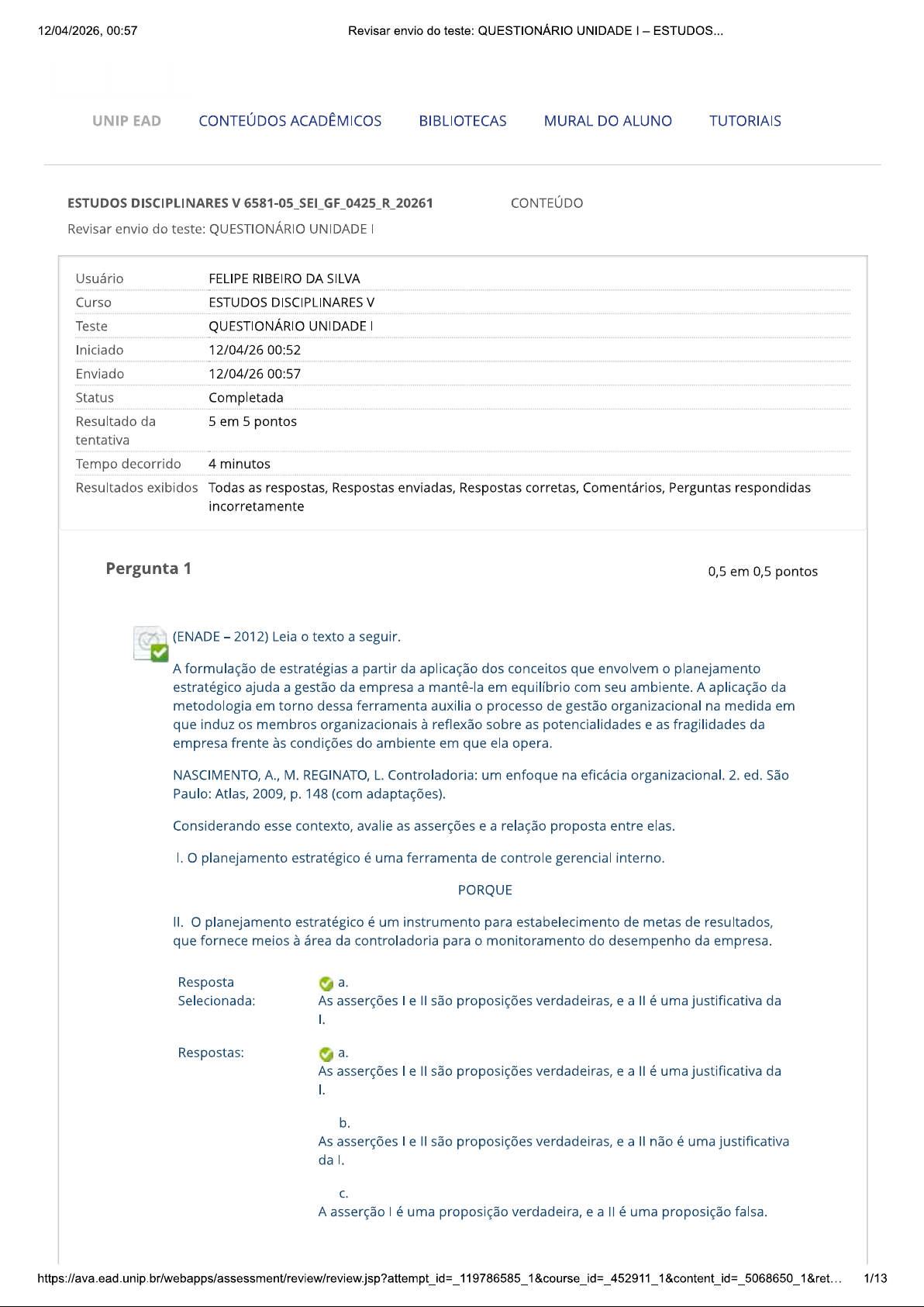 12/04/2026, 00:57 Revisar envio do teste: QUESTIONÁRIO UNIDADE - ESTUDOS... UNIP EAD CONTEÚDOS ACADÊMICOS BIBLIOTECAS MURAL DO ALUNO TUTORIAIS ESTUDOS DISCIPLINARES V 6581-05_SEI_GF_0425_R_20261 CONTEÚDO Revisar envio do teste: QUESTIONÁRIO UNIDADE Usuário FELIPE RIBEIRO DA SILVA Curso ESTUDOS DISCIPLINARES V Teste QUESTIONÁRIO UNIDADE Iniciado 12/04/26 00:52 Enviado 12/04/26 00:57 Status Completada Resultado da 5 em 5 pontos tentativa Tempo decorrido 4 minutos Resultados exibidos Todas as respostas, Respostas enviadas, Respostas corretas, Comentários, Perguntas respondidas incorretamente Pergunta 1 0,5 em 0,5 pontos (ENADE 2012) Leia texto a seguir. A formulação de estratégias a partir da aplicação dos conceitos que envolvem planejamento estratégico ajuda a gestão da empresa a mantê-la em equilíbrio com seu ambiente. A aplicação da metodologia em torno dessa ferramenta auxilia processo de gestão organizacional na medida em que induz os membros organizacionais à reflexão sobre as potencialidades e as fragilidades da empresa frente às condições do ambiente em que ela opera. NASCIMENTO, A.,M. REGINATO, L. Controladoria: um enfoque na eficácia organizacional. 2. ed. São Paulo: Atlas, 2009, p. 148 (com adaptações). Considerando esse contexto, avalie as asserções e a relação proposta entre elas. I. planejamento estratégico é uma ferramenta de controle gerencial interno. PORQUE II. planejamento estratégico é um instrumento para estabelecimento de metas de resultados, que fornece meios à área da controladoria para monitoramento do desempenho da empresa. Resposta a. Selecionada: As asserções e II são proposições verdadeiras, e a é uma justificativa da I. Respostas: a. As asserções e II são proposições verdadeiras, e a é uma justificativa da I. b. As asserções e II são proposições verdadeiras, e a não é uma justificativa da I. A asserção lé uma proposição verdadeira, e a é uma proposição falsa. 1/1312/04/2026, 00:57 Revisar envio do teste: QUESTIONÁRIO UNIDADE - ESTUDOS... d. A asserção é uma proposição falsa, e a é uma proposição verdadeira. e. As asserções I e são proposições falsas. Comentário Resposta: A da resposta: Comentário: Asserção verdadeira. JUSTIFICATIVA. planejamento estratégico deve analisar a organização e fazer uma leitura crítica de suas ações, seus objetivos e suas metas. Asserção verdadeira. JUSTIFICATIVA. planejamento é usado para direcionamento, controle, maximização dos objetivos e minimização das deficiências de uma empresa, proporcionando eficiência. Relação entre as asserções. A asserção é verdadeira e justifica a asserção I, pois, para que se tenha controle sobre comportamento de uma empresa, é preciso que se tenha uma ferramenta de controle gerencial que mostre como está a operação e apresente provável cenário futuro a partir do modus operandi estabelecido. Além disso, essa ferramenta deve ter como parâmetros os objetivos almejados pela organização, traçados pelo Planejamento Estratégico. Pergunta 2 0,5 em 0,5 pontos (ENADE 2012) A taxa de juros Selic (Sistema Especial de Liquidação e Custódia) é uma das principais taxas de remuneração dos títulos públicos federais e vale cerca de 8% ao ano (julho de 2012). Como reflexo da redução dessa taxa, os bancos praticam juros anuais da ordem de 9% para financiamento de longo prazo. desempenho da Bolsa de Valores de São Paulo não tem apresentado um bom retorno nos últimos cinco anos, com média de rentabilidade próxima dos 13% anuais. Nesse contexto, custo de capital das empresas brasileiras tem diminuído, uma vez que o modelo do custo médio ponderado de capital (CPMC) é calculado a partir desses mesmos parâmetros, especialmente na definição do custo de capital próprio pelo método (capital asset pricing model), na estimativa do custo de capital de terceiros (Kt), cujas fórmulas estão apresentadas a seguir. CAPM Beta Na fórmula: kf = taxa de juros de uma aplicação livre de risco; km = taxa de juros do mercado (com risco); Beta = beta do setor de atividade econômica no Brasil; T = soma das alíquotas dos tributos incidentes sobre lucro líquido (IRPJ e CSLL). Se uma empresa é optante do Simples Nacional, atua em um ramo de atividade cujo Beta é igual a 1 e cuja rentabilidade estimada é de 9% ao ano, então, ao analisá-la na perspectiva do contexto descrito anteriormente, seus custos de capital próprio e de terceiros são, respectivamente, de Resposta Selecionada: 13,00% e 9,00%. e. Respostas: 8,00% e 5,94%. a. b. 8,00% e 6,84%. 13,00% e 5,94%. d. 13,10% e 6,84%. 2/1312/04/2026, 00:57 Revisar envio do teste: QUESTIONÁRIO UNIDADE - ESTUDOS... 13,00% e 9,00%. e. Comentário Resposta: E da resposta: Comentário: modelo de precificação de ativos financeiros (CAPM) é mais influente modelo de precificação de ativos criado até hoje. Apesar disso, recebe diversas críticas dos administradores financeiros, pois modelo é dependente do coeficiente Beta, sendo seu sucesso atrelado à eficiência do coeficiente em representar risco sistemático. coeficiente Beta representa a relação entre excesso de retorno de um investimento e excesso de retorno de mercado: Beta Na igualdade, Kp é a taxa de retorno do investimento, ou taxa mínima de atratividade, Km é a taxa média de retorno de mercado e Kf é a taxa de retorno de um investimento livre de risco. Assim, a taxa de retorno do investimento fica: No exemplo, Beta é igual a 1, Km é igual a 13% e Kf é igual a 9%. Com esses valores, temos: Com relação ao capital de terceiros, temos: Taxa de juros dos bancos Pergunta 3 0,5 em 0,5 pontos (ENADE - 2012) Leia texto a seguir. A empresa que transpira ética deve se preocupar em cumprir todos os aspectos legais que ela exige e preocupar-se também com bem-estar e a saúde de seus funcionários, propiciando-lhes melhor qualidade de vida. Deve evitar desperdício de produtos e recursos natur