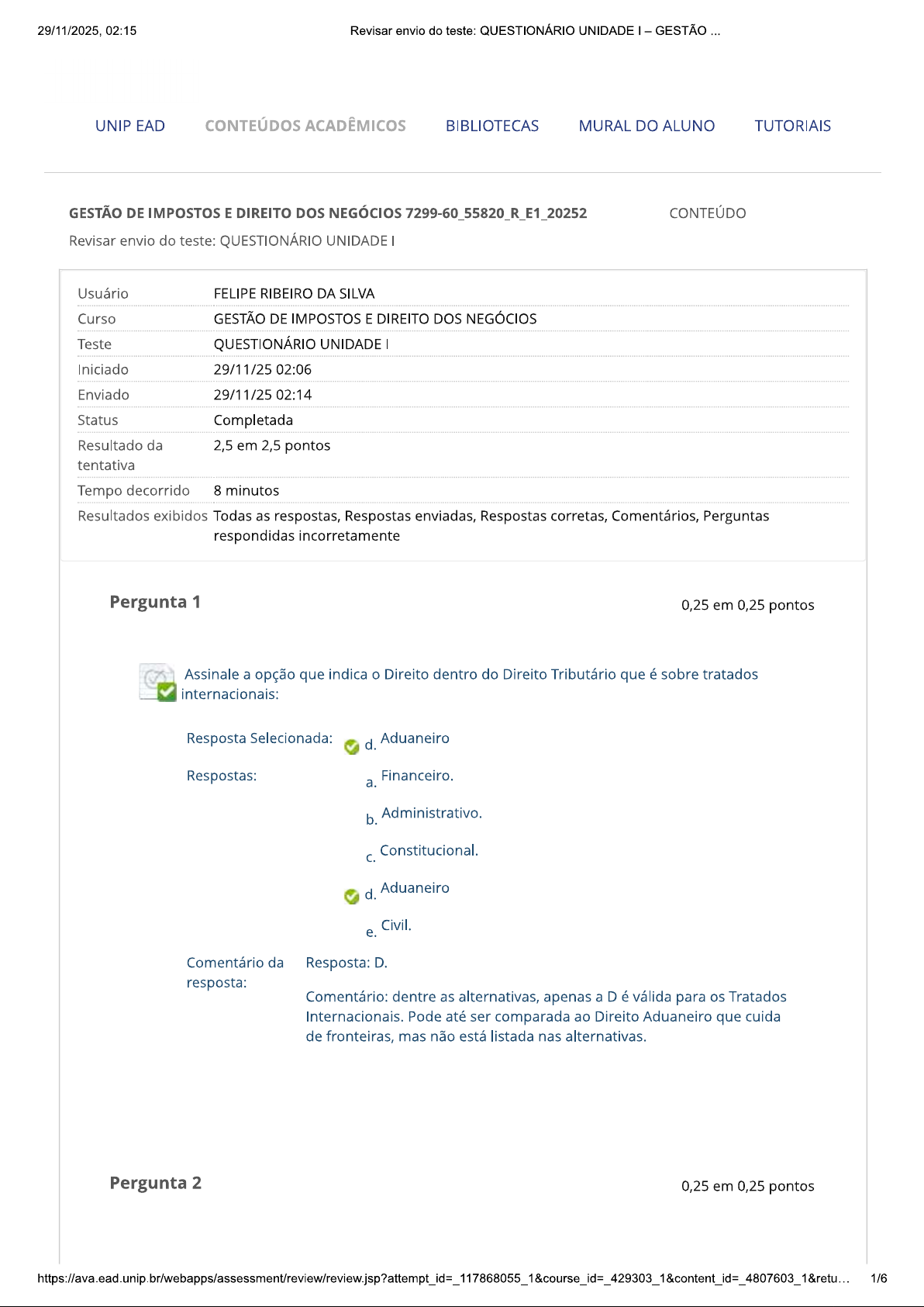 29/11/2025, 02:15 Revisar envio do teste: QUESTIONÁRIO UNIDADE GESTÃO UNIP EAD CONTEÚDOS ACADÊMICOS BIBLIOTECAS MURAL DO ALUNO TUTORIAIS GESTÃO DE IMPOSTOS E DIREITO DOS NEGÓCIOS 7299-60_55820_R_E1_20252 CONTEÚDO Revisar envio do teste: QUESTIONÁRIO UNIDADE I Usuário FELIPE RIBEIRO DA SILVA Curso GESTÃO DE IMPOSTOS E DIREITO DOS NEGÓCIOS Teste QUESTIONÁRIO UNIDADE I Iniciado 29/11/25 02:06 Enviado 29/11/25 02:14 Status Completada Resultado da 2,5 em 2,5 pontos tentativa Tempo decorrido 8 minutos Resultados exibidos Todas as respostas, Respostas enviadas, Respostas corretas, Comentários, Perguntas respondidas incorretamente Pergunta 1 0,25 em 0,25 pontos Assinale a opção que indica Direito dentro do Direito Tributário que é sobre tratados internacionais: Resposta Selecionada: d. Aduaneiro Respostas: Financeiro. a. b. Administrativo. Constitucional. Aduaneiro d. e. Civil. Comentário da Resposta: D. resposta: Comentário: dentre as alternativas, apenas a válida para os Tratados Internacionais. Pode até ser comparada ao Direito Aduaneiro que cuida de fronteiras, mas não está listada nas alternativas. Pergunta 2 0,25 em 0,25 pontos 1/629/11/2025, 02:15 Revisar envio do teste: QUESTIONÁRIO UNIDADE GESTÃO Assinale a opção que indica Princípio que vedou a cobrança de tributos em relação aos fatos geradores ocorridos antes do início da vigência da lei que instituiu ou aumentou. Resposta Selecionada: Princípio da irretroatividade. a. Respostas: Princípio da irretroatividade. a. b. Princípio da tipicidade fechada. Princípio da estrita legalidade. d. Princípio da anterioridade. e. Princípio da reserva absoluta de lei. Comentário da Resposta: resposta: Comentário: dentre as alternativas, apenas a letra A representa um indicativo de que a lei não é apenas escrita, mas deve ser interpretada estritamente. Pergunta 3 0,25 em 0,25 pontos Assinale a opção que indica 0 princípio que proíbe tratamento desigual aos contribuintes. Resposta Selecionada: Princípio da isonomia. Respostas: a. Princípio da irretroatividade. b. Princípio da vedação ao confisco. Princípio da isonomia. C. d. Princípio da anterioridade. Princípio da capacidade contributiva. e. Comentário da Resposta: resposta: Comentário: como em várias definições apontadas, Princípio da isonomia, ou da igualdade, é único princípio constitucional que trata sobre tema. Pergunta 4 0,25 em 0,25 pontos Assinale a opção que indica Princípio onde os impostos terão caráter pessoal e serão graduados segundo a capacidade econômica do contribuinte: 2/629/11/2025, 02:15 Revisar envio do teste: QUESTIONÁRIO UNIDADE GESTÃO Resposta Selecionada: d. Princípio da Capacidade Contributiva. Respostas: a. Princípio da competência tributária. b. Princípio da não cumulatividade. Princípio da seletividade. d. Princípio da Capacidade Contributiva. e. Princípio das Imunidades Tributárias. Comentário da Resposta: D. resposta: Comentário: como em várias definições apontadas, Princípio da Capacidade Contributiva é o único que realmente trata da essencialidade. Pergunta 5 0,25 em 0,25 pontos Qual foi marco na história para a conscientização de direitos e a formação da primeira Constituição ou Carta Magna? Resposta Selecionada: Inglaterra, em 1215. Respostas: Constantinopla, em 1197. a. b. Revolução Americana, em 1783. Inglaterra, em 1215. d. França, em 1597. Brasil, em 1822. e. Comentário da Resposta: resposta: Comentário: como em várias definições apontadas, os fatos históricos na parte tributária são consistentes, mas a única alternativa que lida com a história do Rei João sem Terra, em que foi constituída a Carta Magna, foi na Inglaterra, em 1215 d.C. Pergunta 6 0,25 em 0,25 pontos Leia as asserções e depois assinale a alternativa correta: cidadão enxerga pagamento do tributo como uma imposição pecuniária sem retorno para a sociedade, porque 3/629/11/2025, 02:15 Revisar envio do teste: QUESTIONÁRIO UNIDADE GESTÃO contribuinte sabe quanto custou ganhar bem material que o Estado impositivamente lhe cobra para aplicar em bons planos e planos não tão bons, já que de alguma forma houve um estresse para obter aqueles recursos. Resposta Selecionada: a. A e B estão corretas e A justifica B. Respostas: A e estão corretas e A justifica B. a. b. A e B estão corretas e A não justifica B. A e estão erradas, mas A justifica B. d. A e estão erradas, mas A não justifica B. Nenhuma das alternativas está correta. e. Comentário da Resposta: A resposta: Comentário: A complementa e justifica porque nexo causal do que cidadão pensa vem ao encontro do que o contribuinte expressa na justificativa Pergunta 7 0,25 em 0,25 pontos Leia as asserções a seguir e depois assinale a alternativa correta: A diferença entre a Igreja e governo, é que a Igreja pede doações e o dízimo, já o governo obriga pagamento, assim, contribuinte, querendo ou não, terá de pagar parte de sua produção ou riqueza, mesmo que seja para manter algo pelo qual não necessariamente tem apreço ou a contraprestação do serviço público. Resposta Selecionada: A e B estão corretas e A justifica a. Respostas: a. A e estão corretas e A justifica B. b. A e estão corretas e A não justifica A e estão erradas, mas A justifica B. C. d. A e estão erradas, mas A não justifica B. Nenhuma das alternativas está correta. e. Comentário da Resposta: resposta: Comentário: a asserção A complementa a e a justifica porque nexo causal do que cidadão pensa vem ao encontro do que contribuinte expressa na justificativa B. 4/629/11/2025, 02:15 Revisar envio do teste: QUESTIONÁRIO UNIDADE GESTÃO Pergunta 8 0,25 em 0,25 pontos Se determinada conduta praticada pelo agente não estiver prevista como ilegal pela lei, ela necessariamente será lícita, livre e impunível por parte do Estado, pois: Resposta Selecionada: Não há crime sem lei anterior que defina. Respostas: A administração pública é implac
