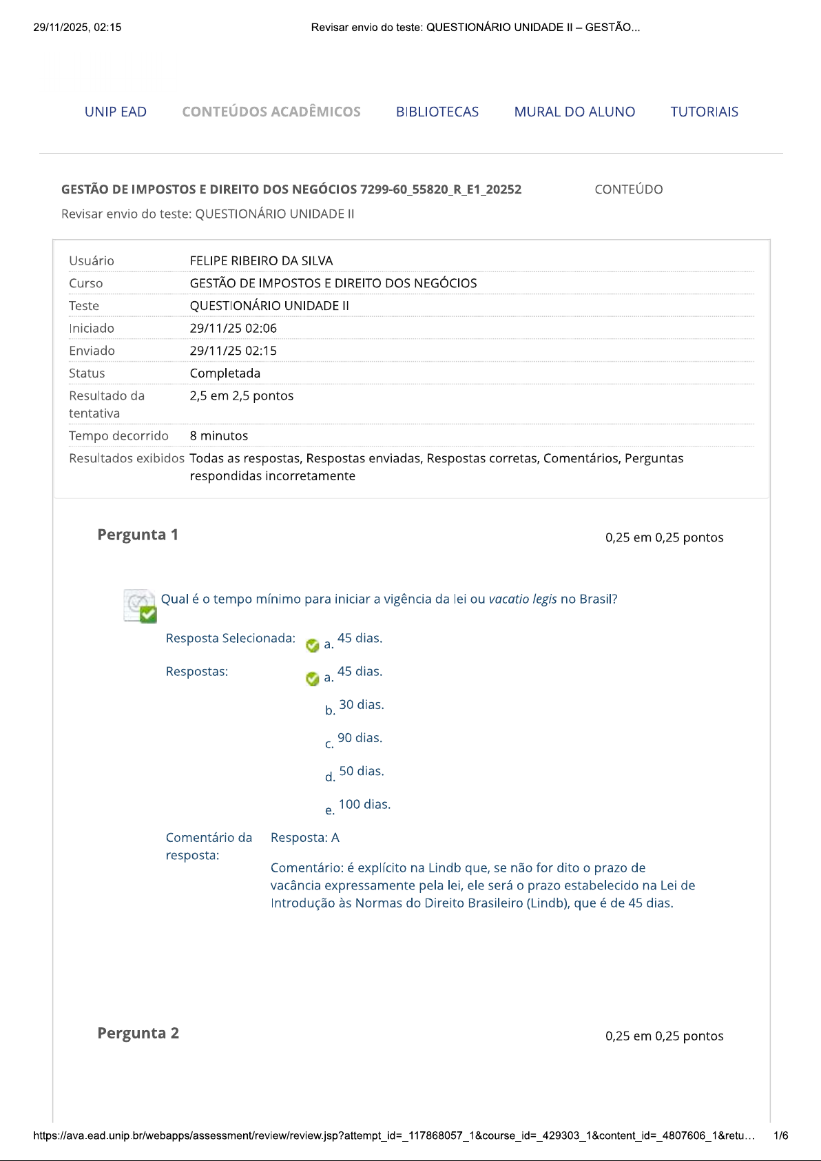 29/11/2025, 02:15 Revisar envio do teste: QUESTIONÁRIO UNIDADE UNIP EAD CONTEÚDOS ACADÊMICOS BIBLIOTECAS MURAL DO ALUNO TUTORIAIS GESTÃO DE IMPOSTOS E DIREITO DOS NEGÓCIOS 7299-60_55820_R_E1_20252 CONTEÚDO Revisar envio do teste: QUESTIONÁRIO UNIDADE Usuário FELIPE RIBEIRO DA SILVA Curso GESTÃO DE IMPOSTOS E DIREITO DOS NEGÓCIOS Teste QUESTIONÁRIO UNIDADE Iniciado 29/11/25 02:06 Enviado 29/11/25 02:15 Status Completada Resultado da 2,5 em 2,5 pontos tentativa Tempo decorrido 8 minutos Resultados exibidos Todas as respostas, Respostas enviadas, Respostas corretas, Comentários, Perguntas respondidas incorretamente Pergunta 1 0,25 em 0,25 pontos Qual é tempo mínimo para iniciar a vigência da lei ou vacatio legis no Brasil? Resposta Selecionada: a. 45 dias. Respostas: a. 45 dias. b. 30 dias. 90 dias. d. 50 dias. 100 dias. e. Comentário da Resposta: A resposta: Comentário: é explícito na Lindb que, se não for dito prazo de vacância expressamente pela lei, ele será prazo estabelecido na Lei de Introdução às Normas do Direito Brasileiro (Lindb), que é de 45 dias. Pergunta 2 0,25 em 0,25 pontos 1/629/11/2025, 02:15 Revisar envio do teste: QUESTIONÁRIO UNIDADE GESTÃO.. Sabendo-se que princípio da anterioridade possui suas modalidades e características, em qual das opções esse princípio se refere? Resposta Selecionada: d. Anual e nonagesimal. Respostas: Dual e semestral. a. b. 60 dias e 120 dias prorrogáveis. Quinzenal e bimestral. d. Anual e nonagesimal. Mensal e semestral. e. Comentário Resposta: D da resposta: Comentário: princípio da anterioridade somente fala sobre a anterioridade anual que se refere à lei não poder entrar em vigência antes da virada do próximo ano, ou da anterioridade nonagesimal que a lei poderá entrar em vigor somente após mínimo de 90 dias após a publicação. Esse princípio evita a surpresa de uma lei, por exemplo, ser publicada em dezembro para eventual entrada em vigência em janeiro. Pergunta 3 0,25 em 0,25 pontos Dentre as alternativas, escolha a que se refere a impostos Resposta Selecionada: d. Não há contraprestação específica por parte do Estado. Respostas: a. Cobrados de serviços específicos, são aqueles identificáveis. b. São tributos vinculados. C. Possuem dois fatos geradores. d. Não há contraprestação específica por parte do Estado. Nenhuma das alternativas está correta. e. Comentário Resposta: D da resposta: Comentário: Impostos são uma espécie de tributo não vinculado, ou seja, não há contraprestação específica por parte do Estado. CTN (BRASIL, 1966) assim os define: "Art. 16. Imposto é tributo cuja obrigação tem por fato gerador uma situação independente de qualquer atividade estatal específica, relativa ao contribuinte".. Pergunta 4 0,25 em 0,25 pontos 2/629/11/2025, 02:15 Revisar envio do teste: QUESTIONÁRIO UNIDADE Dentre as alternativas, escolha a que se refere a taxas: Resposta São tributos vinculados e possuem dois fatos geradores. Selecionada: Respostas: a. São tributos cuja obrigação tem por fato gerador uma situação independente de qualquer atividade estatal específica, relativa ao contribuinte. b. São uma espécie de tributo não vinculado. São tributos vinculados e possuem dois fatos geradores. d. Têm caráter contributivo e proporcionam a chamada solidariedade social. Nenhuma das alternativas está correta. e. Comentário da Resposta: resposta: Comentário: taxas são tributos vinculados (existe a contraprestação específica do Estado, como a destinação para aquela finalidade específica) e possuem dois fatos geradores. Pergunta 5 0,25 em 0,25 pontos De acordo com Código Tributário Nacional, sujeito passivo da obrigação tributária principal é a pessoa : Resposta d. Selecionada: Física ou jurídica que tenha relação pessoal e direta com a situação que constitui respectivo fato gerador. Respostas: a. Jurídica de direito público, titular da competência de exigir cumprimento da obrigação. b. Jurídica de direito público, destinatária do produto da arrecadação do referido tributo. C. Física ou jurídica, obrigada ao pagamento do tributo ou da penalidade pecuniária de natureza tributária. d. Física ou jurídica que tenha relação pessoal e direta com a situação que constitui respectivo fato gerador. Nenhuma das alternativas está correta. e. 3/629/11/2025, 02:15 Revisar envio do teste: QUESTIONÁRIO UNIDADE GESTÃO.. Comentário da Resposta: D resposta: Comentário: sujeito passivo da obrigação tributária é responsável pelo fato gerador, tanto para pessoa jurídica como física. Pergunta 6 0,25 em 0,25 pontos Dos tributos informados a seguir, qual não é de competência da União? Resposta Selecionada: d. Imposto sobre transmissão causa mortis e doação. Respostas: a. Impostos de importação. b. Imposto sobre produto industrializado. Imposto sobre grandes fortunas. d. Imposto sobre transmissão causa mortis e doação. Imposto sobre operações financeiras. e. Comentário da Resposta: D resposta: Comentário: ITCMD ou Imposto sobre transmissão Causa mortis e doação é de competência dos Estados e não da União. Pergunta 7 0,25 em 0,25 pontos Dos tributos informados a seguir, qual não é de competência dos estados? 4/629/11/2025, 02:15 Revisar envio do teste: QUESTIONÁRIO UNIDADE Resposta b. Imposto sobre produto industrializado. Selecionada: Respostas: a. Imposto sobre a propriedade de veículos automotores. b. Imposto sobre produto industrializado. Imposto sobre operações relativas à circulação de mercadorias e prestação de serviços de transporte interestadual e intermunicipal e de comunicação. d. Imposto sobre transmissão causa mortis e doação. Nenhuma das alternativas está correta. e. Comentário da Resposta: resposta: Comentário: esse imposto, IPI, é de competência federal e não estadual. Pergunta 8 0,25 em 0,25 pontos Dos tributos informados a seguir, qual não é de competência dos municípi