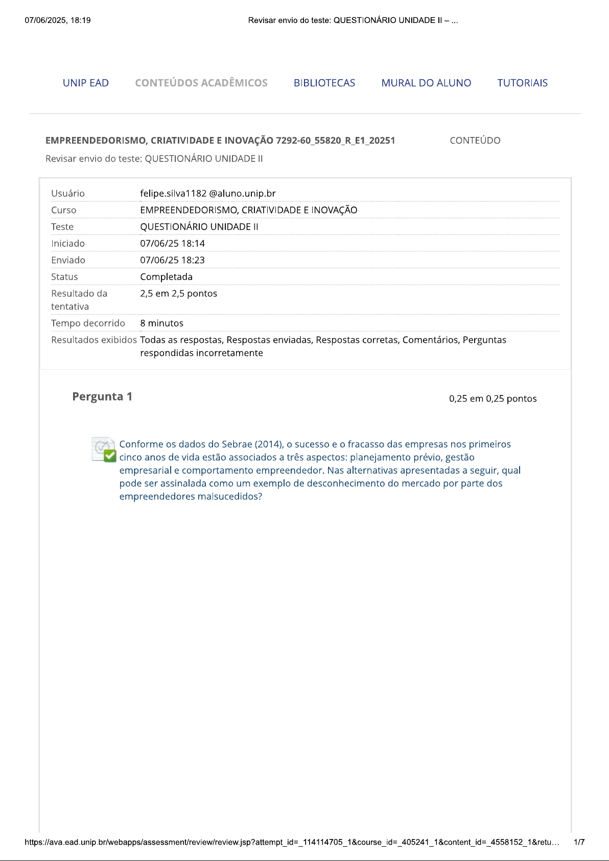 07/06/2025, 18:19 Revisar envio do teste: QUESTIONÁRIO UNIDADE UNIP EAD CONTEÚDOS ACADÊMICOS BIBLIOTECAS MURAL DO ALUNO TUTORIAIS EMPREENDEDORISMO, CRIATIVIDADE E INOVAÇÃO 7292-60_55820_R_E1_20251 CONTEÚDO Revisar envio do teste: QUESTIONÁRIO UNIDADE Usuário felipe.silva1182@aluno.unip.br Curso EMPREENDEDORISMO, CRIATIVIDADE E INOVAÇÃO Teste QUESTIONÁRIO UNIDADE Iniciado 07/06/25 18:14 Enviado 07/06/25 18:23 Status Completada Resultado da 2,5 em 2,5 pontos tentativa Tempo decorrido 8 minutos Resultados exibidos Todas as respostas, Respostas enviadas, Respostas corretas, Comentários, Perguntas respondidas incorretamente Pergunta 1 0,25 em 0,25 pontos Conforme os dados do Sebrae (2014), o sucesso e fracasso das empresas nos primeiros cinco anos de vida estão associados a três aspectos: planejamento prévio, gestão empresarial e comportamento empreendedor. Nas alternativas apresentadas a seguir, qual pode ser assinalada como um exemplo de desconhecimento do mercado por parte dos empreendedores malsucedidos? 1/707/06/2025, 18:19 Revisar envio do teste: QUESTIONÁRIO UNIDADE Resposta e. Selecionada: Não sabiam número de clientes que teriam nem os seus hábitos. Respostas: a. Não definiram uma estratégia para evitar desperdícios. b. Não determinaram valor do lucro pretendido. Não elaboraram um plano de negócios. d. Não planejaram como a empresa funcionaria em sua ausência. e. Não sabiam o número de clientes que teriam nem os seus hábitos. Comentário Resposta: E da resposta: Comentário: dentre as alternativas, apenas a letra E representa um indicativo de desconhecimento de mercado ambiente externo, ou seja, não houve cuidado em conhecer as características e os comportamentos do público consumidor do produto e/ou serviço. As demais alternativas indicam falhas de planejamento em relação à concepção do negócio, a partir de elementos do ambiente interno da empresa. Pergunta 2 0,25 em 0,25 pontos Entre as diversas definições de plano de negócios, é incorreto afirmar: Resposta b. Selecionada: É a descrição, em um documento, dos riscos de negócio que o candidato a empreendedor pretende desenvolver. Respostas: a. É um documento usado para descrever um empreendimento e modelo de negócios que sustenta a empresa. b. É a descrição, em um documento, dos riscos de negócio que o candidato a empreendedor pretende desenvolver. C. É um documento preparado pelo empreendedor, no qual são descritos todos os elementos externos e internos para início de um novo empreendimento. d. É um documento que descreve os objetivos de negócio e quais passos devem ser dados para serem alcançados. e. É um documento que descreve uma série de etapas processuais para o adequado posicionamento no ambiente de negócios. Comentário da Resposta: resposta: Comentário: ao desenvolver um plano de negócios, empreendedor 2/707/06/2025, 18:19 Revisar envio do teste: QUESTIONÁRIO UNIDADE - busca identificar oportunidades, as quais possibilitem atender às demandas não atendidas ou atendidas de maneira insatisfatória. Pergunta 3 0,25 em 0,25 pontos Degen (2009) apresenta uma série de benefícios que um plano de negócios pode gerar: praticamente impossível para as pessoas guardarem na memória ordenadamente todos os dados e as informações necessárias para um novo negócio, e a elaboração do plano de negócio torna o acesso às informações consistente e imediato. II. Avaliar o potencial de lucro do negócio e perspectivas de crescimento, projetar o fluxo de caixa; declarar, avaliar e mitigar os riscos do empreendimento; estabelecer o plano de marketing e vendas, estabelecer plano de operação. III. Os riscos do negócio e as maneiras de superá-los são evidenciados para todos os stakeholders, isso evita que algo crítico ao projeto fique esquecido. Está correto que se afirma em: Resposta Selecionada: I, e III. e. Respostas: a. I, apenas. b. e II. e III. d. e III. I, e III. e. Comentário da Resposta: E resposta: Comentário: as três afirmativas fazem parte de um estudo de Degen, que relaciona dez benefícios ao elaborar um plano de negócios, e contribuem para uma adequação do modelo de negócios às dimensões de planejamento e gerenciamento da empresa e as oportunidades percebidas. Pergunta 4 0,25 em 0,25 pontos Apesar de vários estudos apontarem para a importância do uso de um plano de negócios, muitos empreendedores justificam desprezo pelo documento por conta dos seguintes argumentos, exceto: Resposta Selecionada: "Preciso conhecer mercado". a. Respostas: "Preciso conhecer o mercado". a. b. "Não preciso disso". 3/707/06/2025, 18:19 Revisar envio do teste: QUESTIONÁRIO UNIDADE "Não tenho afinidade com números". d. "Tenho recursos suficientes". e. "Está tudo na minha cabeça". Comentário Resposta: A da resposta: Comentário: como em várias definições apontadas, o plano de negócios é um documento que contribui para a compreensão mais complexa do modelo de negócios, desde a percepção das oportunidades, assim como as limitações para o bom desempenho da iniciativa. Nesse sentido, o plano de negócios permite um conhecimento preciso das características do mercado, dos consumidores, da dinâmica logística e os respectivos comportamentos de todos os atores envolvidos no negócio. Pergunta 5 0,25 em 0,25 pontos Dornelas (2001) propõe um esquema geral para ajudar empreendedor a formatar e alinhar discurso de vendas do projeto. Após a elaboração do plano de negócios, deve-se considerar que representa alicerce do projeto. É necessário elaborar um sumário executivo e, em seguida, precisa ser desenvolvido chamado elevator speech, que consiste em uma sequência de passos, em que empreendedor buscará responder a alguns questionamentos básicos do seu modelo de negócios. Desse modo, questões como: "quais atividades chave serão desenvolvidas pela equipe", "quais marcos de referência serão considerados" e "quais serão os resultados esperados" 