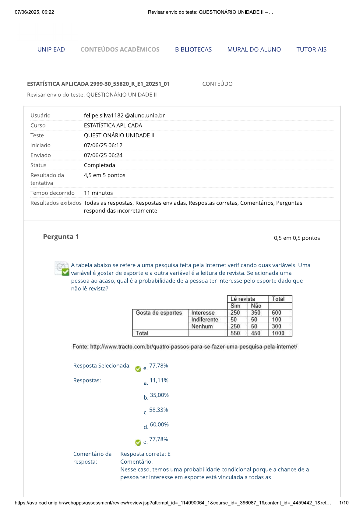07/06/2025, 06:22 Revisar envio do teste: QUESTIONÁRIO UNIDADE UNIP EAD CONTEÚDOS ACADÊMICOS BIBLIOTECAS MURAL DO ALUNO TUTORIAIS ESTATÍSTICA APLICADA 2999-30_55820_R_E1_20251_01 CONTEÚDO Revisar envio do teste: QUESTIONÁRIO UNIDADE Usuário felipe.silva1182@aluno.unip.br Curso ESTATÍSTICA APLICADA Teste QUESTIONÁRIO UNIDADE Iniciado 07/06/25 06:12 Enviado 07/06/25 06:24 Status Completada Resultado da 4,5 em 5 pontos tentativa Tempo decorrido 11 minutos Resultados exibidos Todas as respostas, Respostas enviadas, Respostas corretas, Comentários, Perguntas respondidas incorretamente Pergunta 1 0,5 em 0,5 pontos A tabela abaixo se refere a uma pesquisa feita pela internet verificando duas variáveis. Uma variável é gostar de esporte e a outra variável é a leitura de revista. Selecionada uma pessoa ao acaso, qual é a probabilidade de a pessoa ter interesse pelo esporte dado que não lê revista? Lê revista Total Sim Não Gosta de esportes Interesse 250 350 600 Indiferente 50 50 100 Nenhum 250 50 300 Total 550 450 1000 Fonte: Resposta Selecionada: 77,78% e. Respostas: a. 11,11% b. 35,00% 58,33% C. d. 60,00% 77,78% e. Comentário da Resposta correta: E resposta: Comentário: Nesse caso, temos uma probabilidade condicional porque a chance de a pessoa ter interesse em esporte está vinculada a todas as 1/1007/06/2025, 06:22 Revisar envio do teste: QUESTIONÁRIO UNIDADE possibilidades desta pessoa não ler a revista. Então, teremos: 350 P(interesse em esporte / não lê revista) = 450 = 0,7778 * 100% = 77,78% Pergunta 2 0,5 em 0,5 pontos A tabela abaixo se refere ao diâmetro de tampas de garrafa da produção de certa empresa. Diâmetro (cm) Frequência 4-6 6 6-8 8 8 10 12 10 12 10 12 14 4 Determine valor da média e do desvio Resposta Selecionada: e S = b. Respostas: a. b. d. e. 2/1007/06/2025, 06:22 Revisar envio do teste: QUESTIONÁRIO UNIDADE Comentário da Resposta correta: B resposta: Comentário Para calcular a média, primeiro devemos determinar ponto médio xi de cada classe coluna). Depois, multiplicamos xi por fi e assim podemos somar os resultados da multiplicação. Dividir a soma pelo tamanho da amostra. Diâmetro (cm) xi Frequência 4-6 5 6 7 8 56 8 10 9 12 108 10 12 11 10 110 12 14 13 4 52 Total 40 Então, a média será: 356 = 8,9 cm 40 Para determinar 0 desvio padrão, primeiro devemos determinar a variância. Fazer cálculo de Diâmetro (cm) xi Frequência (xi 5 6 (5 6 = 7 8 8 8 - 10 9 12 10 12 11 10 12 14 13 4 Total 40 Somar valores calculados na última resultado deve ser dividido pelo tamanho da amostra e assim teremos a s² = 231.6 5,79 40 Agora, devemos tirar a raiz quadrada do valor da para determinar desvio padrão. = cm Então, a média é igual a cm e desvio padrão igual a cm. Pergunta 3 0,5 em 0,5 pontos A tabela dada refere-se aos salários da empresa Koke. Salário (R$) Número de empregados 1000 2000 10 2000 3000 20 3000 4000 15 4000 5000 5 Assinale a alternativa incorreta. Resposta Selecionada: d. A amplitude das classes vale R$ 5000. Respostas: tamanho da amostra é igual a 50. a. b. Os pontos médios são 1500, 2500, 3500 e 4500. A média é igual a R$ 2800. d. A amplitude das classes vale R$ 5000. 30% dos empregados têm salário entre R$ 3000 e R$ 4000. e. Comentário da Resposta correta: D resposta: Comentário 3/1007/06/2025, 06:22 Revisar envio do teste: QUESTIONÁRIO UNIDADE A diferença entre o limite superior da última classe (Lmax) e limite inferior da primeira classe (Imin) na tabela. Ela representa a abertura geral da distribuição de dados. A amplitude é uma medida de dispersão e pode ser determinada fazendo a subtração do maior valor e do menor valor. Então: A = 5000 1000 = R$ 4000. Pergunta 4 0,5 em 0,5 pontos As companhias de seguro pesquisam continuamente as idades na morte e as respectivas causas. Os dados se baseiam em um estudo sobre as mortes causadas por armas de fogo na América durante uma semana. Frequência 25 20 de pessoas 15 10 5 0 16-25 26-35 36-45 45-55 56-55 66-75 76-85 Idade Obtenha a probabilidade do resultado da idade de mortes entre 26 e 35 anos ocasionada por armas de fogo. Resposta Selecionada: b. 20% Respostas: 10% a. b. 20% 30% d. 40% 50% e. Comentário da Resposta correta: resposta: Comentário: A probabilidade é a chance de um evento ocorrer dado total de possibilidades. Neste conjunto de dados o evento é a idade de mortes entre 26 e 35 anos e a chance deste evento ocorrer é igual a 10 pessoas. As possibilidades são todos os eventos possíveis além da idade de mortes entre 26 e 35 anos. Então devemos somar todas as possibilidades: 22 + 10 + 6 + 2 + 4 + 5 + 1 50 possibilidades. Assim, a 4/1007/06/2025, 06:22 Revisar envio do teste: QUESTIONÁRIO UNIDADE probabilidade será igual a: P(idade da morte 26 a 35 anos) = 50 10 = 0,2 100% = 20%. Pergunta 5 0,5 em 0,5 pontos Determine a média da estatura de 100 estudantes da seguinte distribuição de frequência. Estatura Frequência 151-158 5 159-166 18 167-174 42 175-182 27 183-190 8 Resposta Selecionada: 171,70 cm e. Respostas: a. 154,5 cm b. 157,10 cm 161,70 cm d. 167,10 cm 171,70 cm e. Comentário da Resposta correta: E resposta: Comentário: Para determinar a média, primeiro é necessário calcular ponto médio xi de cada intervalo de classe coluna). Depois, multiplicar em cada classe ponto médio pela frequência simples e somar os resultados dos produtos coluna) e assim dividir valor da soma pelo tamanho da amostra n. Estatura xi Frequência fi 151-158 154,5 5 154,5 5 = 772,5 159-166 162,5 18 2.925 167-174 170,5 42 7.161 175-182 178,5 27 4.819,5 183-190 186,5 8 1.492 Total Σ 171.70 E agora usando a fórmula de média: 17170 x = 171,70 cm 100 Pergunta 6 0,5 em 0,5 pontos 5/1007/06/2025, 06:22 Revisar envio do teste: QUESTIONÁRIO UNIDADE Discos de policarbonato são analisados no que se refere à resistência de arranhões e resistência a choque. Os resultados de 100 discos são mostrados abaixo. Resistência a choques Alta Baixa Resistênc