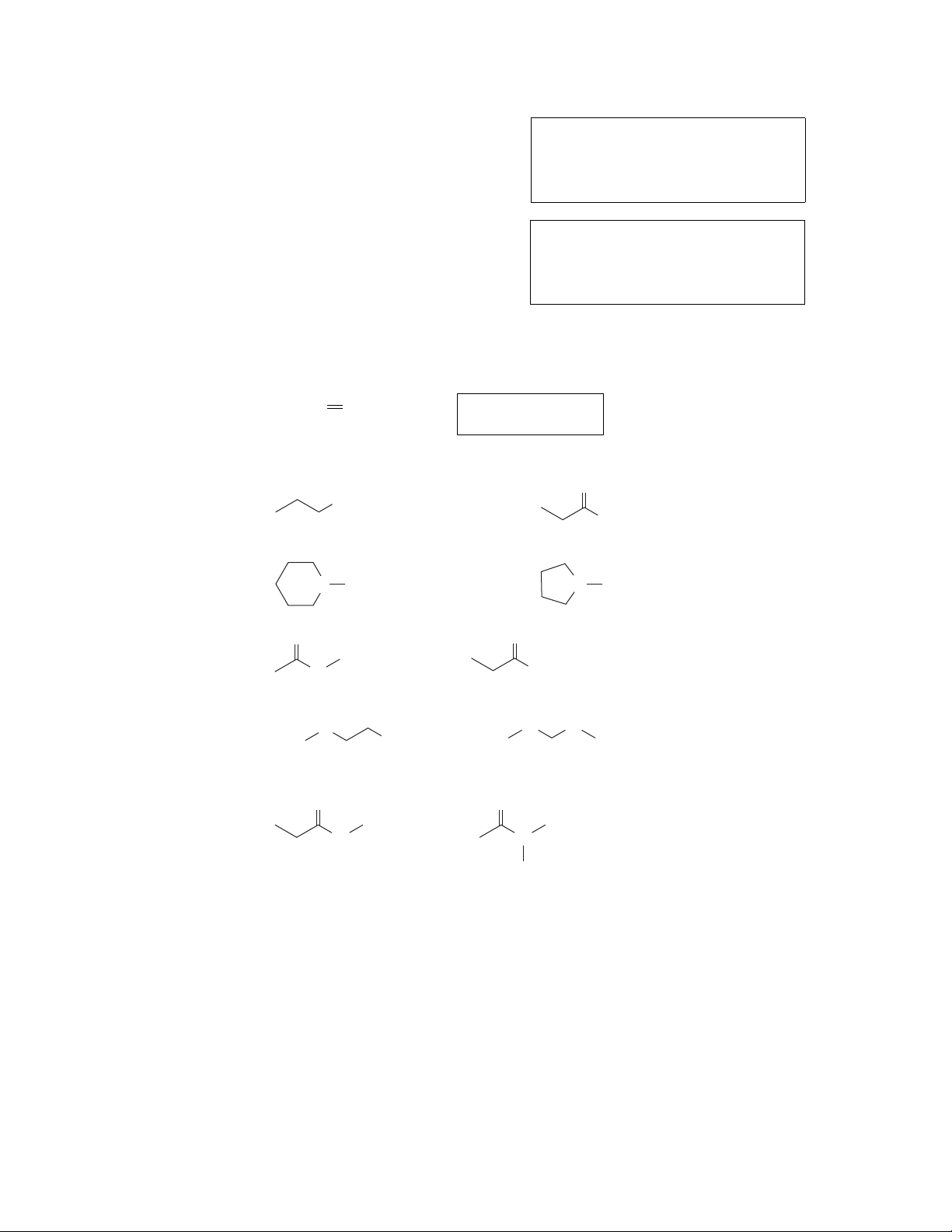 32 FAMILIES OF CARBON COMPOUNDS (f) The isomer of C3H8O that would have the lowest boiling point (g) The isomer of C4H11N that would have the lowest boiling point 2.5 Write the bond-line formula for a constitutional isomer of the compound shown below that does not contain a double bond. CH3CH2CH CH2 2.6 Circle the compound in each pair that would have the higher boiling point. (a) or (b) or CH3N O H OH HN (c) or (d) or O O CH3 CH3 (e) or O O CH3 O OH O CH3 OH O N H CH3 O N CH3 CH3