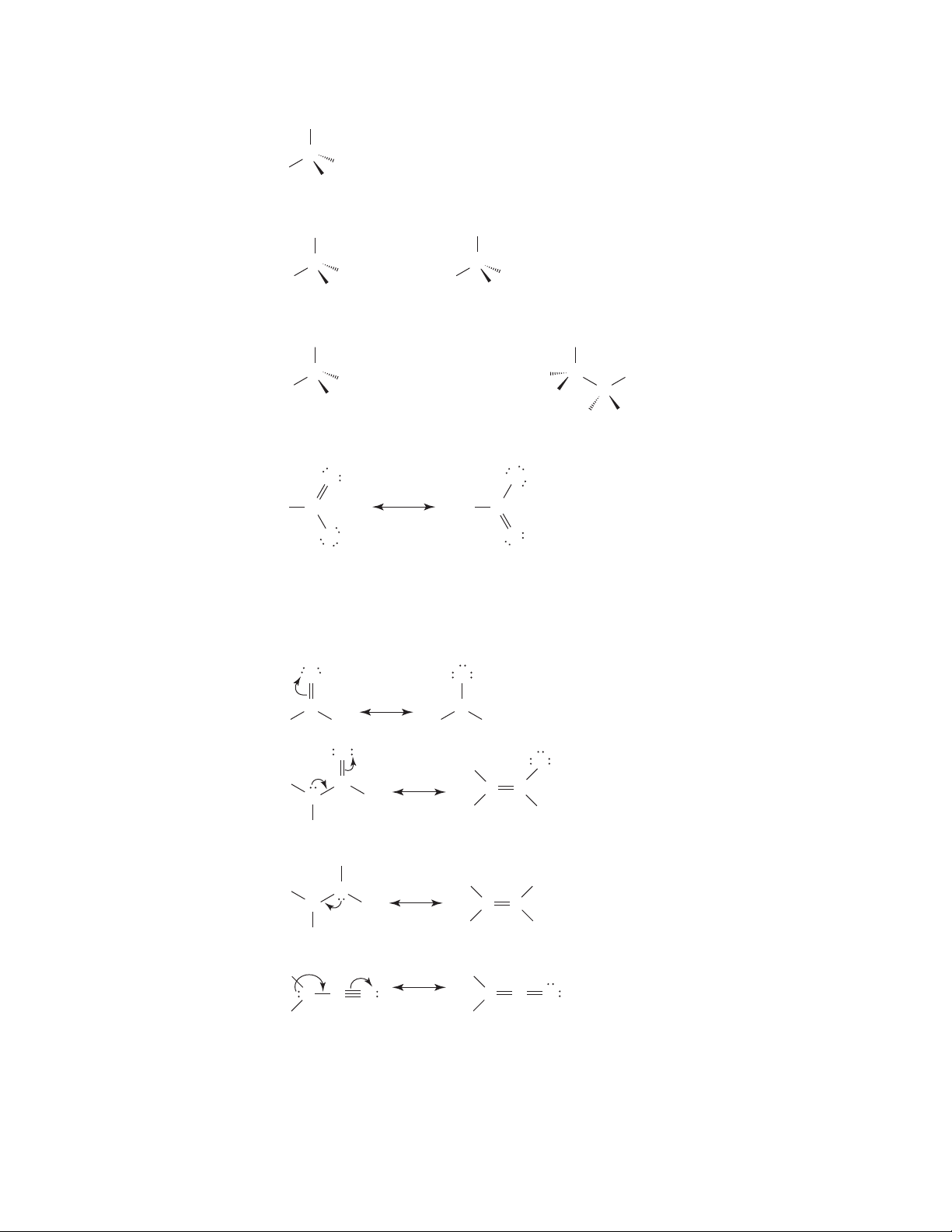 THE BASICS: BONDING AND MOLECULAR STRUCTURE 5 1.17 (a) Cl (Note that the Cl atom and the three H atoms may be written at any of the four positions.) C Cl H H H H H Cl H H C (c) Cl Br H H C (b) or and so on and others (d) H CH and others Cl Cl C Cl H C H H 1.18 C O O H C O O H − − (a) (b) and (c). Since the two resonance structures are equivalent, each should make an equal contribution to the overall hybrid. The C—O bonds should therefore be of equal length (they should be of bond order 1.5), and each oxygen atom should bear a 0.5 negative charge. 1.19 (a) H H C O C +H H C Ο − (b) H C −H C H O O − C C H HH (c) + + H H NH C H C N H H H H (d) − C NC H H − C C N H H