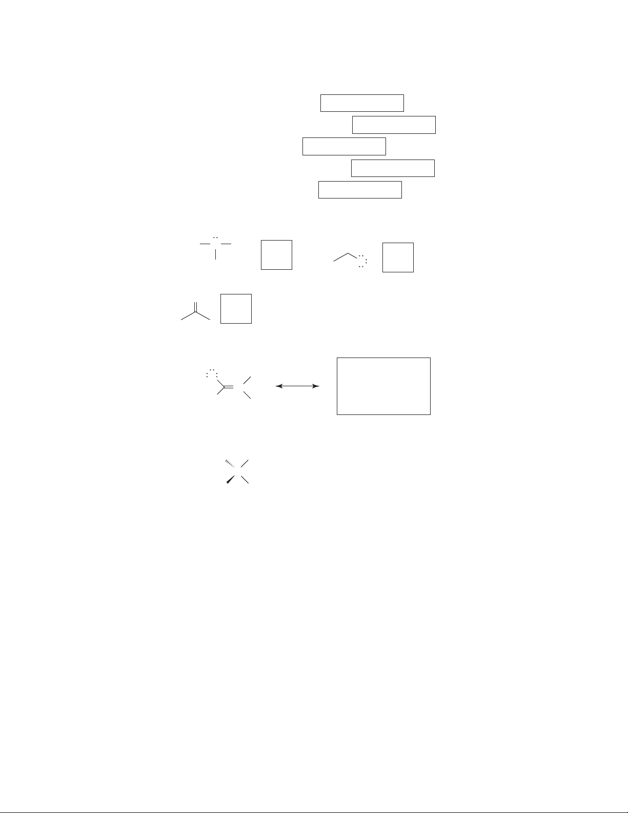 THE BASICS: BONDING AND MOLECULAR STRUCTURE 17 1.9 Consider the molecule (CH3)3B and give the following: (a) Hybridization state of boron (b) Hybridization state of carbon atoms (c) Formal charge on boron (d) Orientation of groups around boron (e) Dipole moment of (CH3)3B 1.10 Give the formal charge on oxygen in each compound. (c) (a) CH3 CH3 CH3O (b) O O − 1.11 Write another resonance structure in which all of the atoms have a formal charge of zero. H O − N + H H 1.12 Indicate the direction of the net dipole moment of the following molecule. C Cl FH3C H3C 1.13 Write bond-line formulas for all compounds with the formula C3H6O.