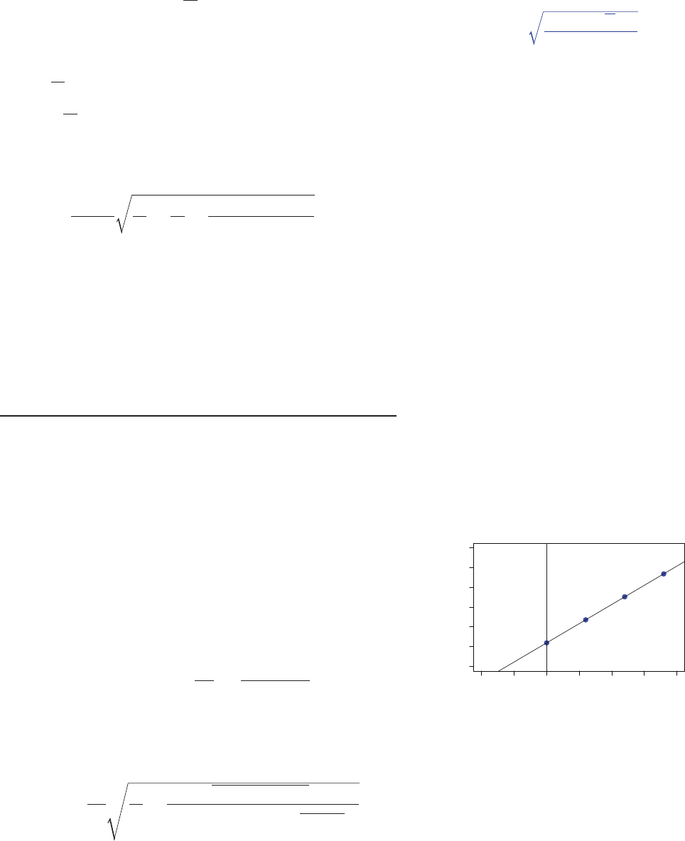 45Chapter 5 Standardizing Analytical Methods cumbersome to calculate. We can simplify the calculation, however, by recognizing that ( )C Cstd std 2 i-/ is the numerator in the equa- tion that gives the standard deviation for the concentrations of the standards, sCd. Because sCd is easy to determine using a calculator, a spreadsheet, or a statistical software program, it is easy to calculate ( )C Cstd std 2 i-/ ; thus ( )) ( ) ( ) ( ) ( .C C n s 34871 6 1 26 41std i n std Cd 1 22 2 i- == - = - = / Substituting all terms back into equation 5.25 gives the standard de- viation in the concentration as ( ) ( ) . . . . . .s 1 1 3487 66 3 68 7 1 43 2 826 1 6 1 43 2 14C 2 2 Cd = + + - = ^ h The 95% confidence interval for the sample’s concentration, there- fore, is . ( . ) ( . ) . .49 9 2 776 2 14 49 9 5 9 nMCd ! !n = = 9. The standard addition for this problem follows equation 5.10, which, as we saw in Problem 5.5, is best treated by plotting Sspike(Vo + Vstd) on the y-axis vs. CsVs on the x-axis, the values for which are Vstd (mL) Sspike (arb. units) Sspike(Vo + Vstd) CstdVstd 0.00 0.119 0.595 0.0 0.10 0.231 1.178 60.0 0.20 0.339 1.763 120.0 0.30 0.442 2.343 180.0 Figure SM5.5 shows the resulting calibration curve for which the calibration equation is ( ) . .S V V C V0 5955 0 009713spike o std std std#+ = + To find the analyte’s concentration, CA, we use the absolute value of the x-intercept, –CAVo, which is equivalent to the y-intercept divided by the slope; thus ( . ) . . .C V C k b5 00 0 009713 0 5955 61 31mLA o A A 0 = = = = which gives CA as 12.3 ppb. To find the 95% confidence interval for CA, we use a modified form of equation 5.25 to calculate the standard deviation in the x-intercept ( ) ( ) ( ) s b s n b C V C V S V V1 C V r std std std std i n spike o std 1 1 2 2 1 2 A o i i = + - + = " , / where the number of standards, n, is four, the standard deviation about the regression, sr, is 0.00155, the slope, b1, is 0.009713, the ( ) s n C C 1 Cd std std 2 i = - -/ −100 −50 0 50 100 150 200 0 .0 1 .0 2 .0 3 .0 CstdVstd S sp ik e(V o + V st d ) Figure SM5.5 Standard additions calibra- tion curve for Problem 5.9.
