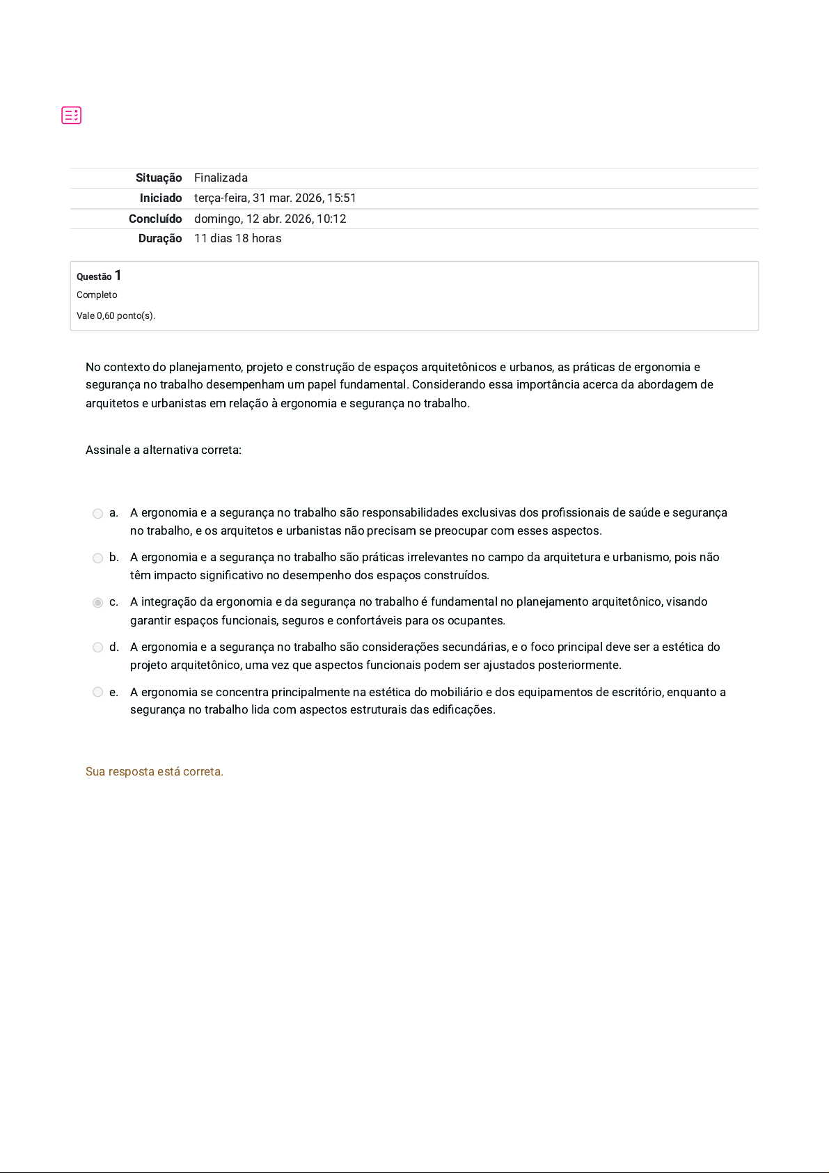 Situação Finalizada Iniciado terça-feira, 31 mar. 2026, 15:51 Concluído domingo, 12 abr. 2026, 10:12 Duração 11 dias 18 horas Questão 1 Completo Vale 0,60 ponto(s). No contexto do planejamento, projeto e construção de espaços arquitetônicos e urbanos, as práticas de ergonomia e segurança no trabalho desempenham um papel fundamental. Considerando essa importância acerca da abordagem de arquitetos e urbanistas em relação à ergonomia e segurança no trabalho. Assinale a alternativa correta: a. A ergonomia e a segurança no trabalho são responsabilidades exclusivas dos profissionais de saúde e segurança no trabalho, e os arquitetos e urbanistas não precisam se preocupar com esses aspectos. b. A ergonomia e a segurança no trabalho são práticas irrelevantes no campo da arquitetura e urbanismo, pois não têm impacto significativo no desempenho dos espaços construídos. c. A integração da ergonomia e da segurança no trabalho é fundamental no planejamento arquitetônico, visando garantir espaços funcionais, seguros e confortáveis para os ocupantes. d. A ergonomia e a segurança no trabalho são considerações secundárias, e o foco principal deve ser a estética do projeto arquitetônico, uma vez que aspectos funcionais podem ser ajustados posteriormente. e. A ergonomia se concentra principalmente na estética do mobiliário e dos equipamentos de escritório, enquanto a segurança no trabalho lida com aspectos estruturais das edificações. Sua resposta está correta. Questão 2 Completo Vale 0,60 ponto(s). Dentro do panorama das normas e regulamentos relacionados à saúde e segurança ocupacional, a Norma Regulamentadora 15 (NR 15) possui uma área específica de abrangência. Considerando a importância das normas de segurança e saúde no trabalho, bem como o impacto direto na qualidade de vida dos trabalhadores, podemos destacar a NR 15 como uma das normas regulamentadoras cruciais no ambiente laboral. Ela desempenha um papel fundamental na proteção da saúde dos trabalhadores, regulando atividades e operações que envolvem exposição a agentes que podem ser prejudiciais. Com base nos conhecimentos sobre a NR 15, há uma explicação abrangente sobre o que a referida norma regulamenta e supervisiona no ambiente de trabalho, assinale a alternativa correta: a. Definir critérios e limites para a exposição ocupacional a agentes que representam riscos à saúde e bem-estar dos trabalhadores. b. Regulamentar a comercialização de produtos químicos perigosos no mercado. c. Assegurar a conformidade das construções civis com as regulamentações municipais. d. Estabelecer diretrizes para a gestão de tráfego nas vias públicas. e. Normatizar a segurança em parques de diversões e áreas de lazer, principalmente, visando o bem-estar geral. Sua resposta está correta. Questão 3 Completo Vale 0,60 ponto(s). A ergonomia desempenha um papel fundamental no ambiente de trabalho, proporcionando benefícios substanciais tanto para as empresas quanto para os trabalhadores. Ela se concentra na adaptação do local de trabalho às necessidades físicas e psicológicas dos funcionários, promovendo assim o conforto e a eficiência. Com base nesta informação analise as asserções abaixo: I. A aplicação dos princípios ergonômicos nas empresas pode contribuir significativamente para a diminuição das faltas e do trabalho com baixa produtividade devido a lesões ou doenças ocupacionais. PORQUE II. A ergonomia visa criar um ambiente de trabalho seguro e saudável, reduzindo os riscos de lesões e doenças relacionadas ao trabalho, o que, por sua vez, ajuda a manter os trabalhadores em boa saúde e produtivos, resultando em menor ausência e maior eficiência. A respeito dessas asserções, assinale a opção correta: a. A asserção I é uma proposição verdadeira e a II é uma proposição falsa. b. A asserção I é uma proposição falsa e a II é uma proposição verdadeira c. As asserções I e II são proposições verdadeiras, mas a II não é uma justificativa correta da I. d. As asserções I e II são proposições verdadeiras e a II é uma justificativa correta da I. e. As asserções I e II são proposições falsas. Sua resposta está correta. Questão 4 Completo Vale 0,60 ponto(s). A Portaria SIT n.º 787, emitida em 28 de novembro de 2018, teve um impacto significativo nas regulamentações de saúde e segurança no trabalho, em particular na Norma Regulamentadora 17 (NR-17). Esta portaria desempenhou um papel crucial na adaptação e no aprimoramento das condições de trabalho para garantir o conforto, a segurança, a saúde e o desempenho eficiente dos trabalhadores, de acordo com as características psicofisiológicas específicas de cada um. Diante desse contexto, assinale a alternativa correta, que aborda o principal objetivo da Portaria SIT n.º 787 em relação à NR- 17. a. Ampliar a abrangência da NR-17 para incluir orientações específicas para profissionais da área de saúde e segurança ocupacional em hospitais. b. Implantar um programa de capacitação obrigatório para todos os trabalhadores, focado na conscientização ergonômica, trabalhista e sustentável. c. Introduzir diretrizes detalhadas sobre a iluminação e ventilação em ambientes de trabalho, abordando aspectos de ergonomia em escritórios. d. Caracterizar oficialmente a NR-17 como uma Norma Geral, estabelecendo diretrizes abrangentes para a adaptação das condições de trabalho às características psicofisiológicas dos trabalhadores. e. Criar um sistema de certificação ergonômica para empresas, permitindo que aquelas que atendessem aos critérios da NR-17 recebessem um selo de conformidade e permissividade de atuação no mercado em determinada área conquistada. Sua resposta está correta. Questão 5 Completo Vale 0,60 ponto(s). A ergonomia no projeto de ventilação e iluminação é uma abordagem de design que se concentra na criação de ambientes de tr
