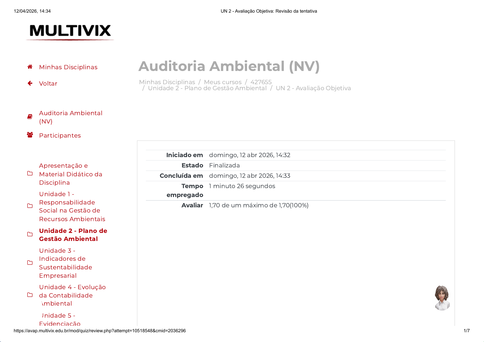 Minhas Disciplinas / Meus cursos / 427655 / Unidade 2 - Plano de Gestão Ambiental / UN 2 - Avaliação Objetiva Auditoria Ambiental (NV) Iniciado em domingo, 12 abr 2026, 14:32 Estado Finalizada Concluída em domingo, 12 abr 2026, 14:33 Tempo empregado 1 minuto 26 segundos Avaliar 1,70 de um máximo de 1,70(100%) Minhas Disciplinas Voltar Auditoria Ambiental (NV) Participantes Apresentação e Material Didático da Disciplina Unidade 1 - Responsabilidade Social na Gestão de Recursos Ambientais Unidade 2 - Plano de Gestão Ambiental Unidade 3 - Indicadores de Sustentabilidade Empresarial Unidade 4 - Evolução da Contabilidade Ambiental Unidade 5 - Evidenciação 12/04/2026, 14:34 UN 2 - Avaliação Objetiva: Revisão da tentativa https://avap.multivix.edu.br/mod/quiz/review.php?attempt=10518548&cmid=2036296 1/7 https://avap.multivix.edu.br/my/ https://avap.multivix.edu.br/course/view.php?id=38369 https://avap.multivix.edu.br/course/view.php?id=38369§ion=3 https://avap.multivix.edu.br/mod/quiz/view.php?id=2036296 https://avap.multivix.edu.br/my/ https://avap.multivix.edu.br/course/view.php?id=38369 https://avap.multivix.edu.br/user/index.php?id=38369 https://avap.multivix.edu.br/course/view.php?id=38369§ion=1 https://avap.multivix.edu.br/course/view.php?id=38369§ion=2 https://avap.multivix.edu.br/course/view.php?id=38369§ion=3 https://avap.multivix.edu.br/course/view.php?id=38369§ion=4 https://avap.multivix.edu.br/course/view.php?id=38369§ion=5 https://avap.multivix.edu.br/course/view.php?id=38369§ion=6 https://avap.multivix.edu.br/ https://avap.multivix.edu.br/ https://avap.multivix.edu.br/ https://avap.multivix.edu.br/ https://avap.multivix.edu.br/ https://avap.multivix.edu.br/ https://avap.multivix.edu.br/ https://avap.multivix.edu.br/ Questão 1 Correto Atingiu 0,34 de 0,34 Uma empresa de celulose está em fase de ampliação de suas instalações e, para atender às exigências do órgão licenciador, precisa apresentar um documento que detalhe os programas de monitoramento, mitigação e controle de impactos ambientais. Esse documento corresponde ao: Escolha uma opção: a. Relatório de Controle Financeiro b. Plano de Marketing Verde c. Plano de Segurança do Trabalho d. Plano de Gestão Ambiental (PGA) e. Plano Diretor Municipal Minhas Disciplinas Voltar Auditoria Ambiental (NV) Participantes Apresentação e Material Didático da Disciplina Unidade 1 - Responsabilidade Social na Gestão de Recursos Ambientais Unidade 2 - Plano de Gestão Ambiental Unidade 3 - Indicadores de Sustentabilidade Empresarial Unidade 4 - Evolução da Contabilidade Ambiental Unidade 5 - Evidenciação 12/04/2026, 14:34 UN 2 - Avaliação Objetiva: Revisão da tentativa https://avap.multivix.edu.br/mod/quiz/review.php?attempt=10518548&cmid=2036296 2/7 https://avap.multivix.edu.br/my/ https://avap.multivix.edu.br/course/view.php?id=38369 https://avap.multivix.edu.br/user/index.php?id=38369 https://avap.multivix.edu.br/course/view.php?id=38369§ion=1 https://avap.multivix.edu.br/course/view.php?id=38369§ion=2 https://avap.multivix.edu.br/course/view.php?id=38369§ion=3 https://avap.multivix.edu.br/course/view.php?id=38369§ion=4 https://avap.multivix.edu.br/course/view.php?id=38369§ion=5 https://avap.multivix.edu.br/course/view.php?id=38369§ion=6 https://avap.multivix.edu.br/ https://avap.multivix.edu.br/ https://avap.multivix.edu.br/ https://avap.multivix.edu.br/ https://avap.multivix.edu.br/ https://avap.multivix.edu.br/ https://avap.multivix.edu.br/ https://avap.multivix.edu.br/ Questão 2 Correto Atingiu 0,34 de 0,34 Uma empresa do setor alimentício decidiu implementar um Sistema de Gestão Ambiental (SGA) após perceber o aumento dos custos com consumo de água e energia, além de recorrentes notificações por inadequações ambientais. Após seis meses, a empresa observou redução significativa de desperdícios e maior controle de seus processos internos. Com base nessa situação, qual vantagem do SGA está diretamente associada aos resultados obtidos pela empresa? Escolha uma opção: a. Melhora exclusiva da imagem institucional, sem impacto operacional. b. Aumento automático do valor de mercado da empresa independentemente de melhorias operacionais. c. Redução de gastos relacionados ao uso de recursos e diminuição dos riscos de penalidades ambientais. d. Redução do tempo necessário para obtenção do licenciamento ambiental, sem necessidade de adequações técnicas. e. Eliminação total dos riscos ambientais, tornando desnecessário o atendimento às legislações. Minhas Disciplinas Voltar Auditoria Ambiental (NV) Participantes Apresentação e Material Didático da Disciplina Unidade 1 - Responsabilidade Social na Gestão de Recursos Ambientais Unidade 2 - Plano de Gestão Ambiental Unidade 3 - Indicadores de Sustentabilidade Empresarial Unidade 4 - Evolução da Contabilidade Ambiental Unidade 5 - Evidenciação 12/04/2026, 14:34 UN 2 - Avaliação Objetiva: Revisão da tentativa https://avap.multivix.edu.br/mod/quiz/review.php?attempt=10518548&cmid=2036296 3/7 https://avap.multivix.edu.br/my/ https://avap.multivix.edu.br/course/view.php?id=38369 https://avap.multivix.edu.br/user/index.php?id=38369 https://avap.multivix.edu.br/course/view.php?id=38369§ion=1 https://avap.multivix.edu.br/course/view.php?id=38369§ion=2 https://avap.multivix.edu.br/course/view.php?id=38369§ion=3 https://avap.multivix.edu.br/course/view.php?id=38369§ion=4 https://avap.multivix.edu.br/course/view.php?id=38369§ion=5 https://avap.multivix.edu.br/course/view.php?id=38369§ion=6 https://avap.multivix.edu.br/ https://avap.multivix.edu.br/ https://avap.multivix.edu.br/ https://avap.multivix.edu.br/ https://avap.multivix.edu.br/ https://avap.multivix.edu.br/ https://avap.multivix.edu.br/ https://avap.multivix.edu.br/ Questão 3 Correto Atingiu 0,34 de 0,34 Uma fábrica de embalagens plásticas está ampliando sua linha de produtos e, por isso, decidiu contratar uma empresa especializada para ve