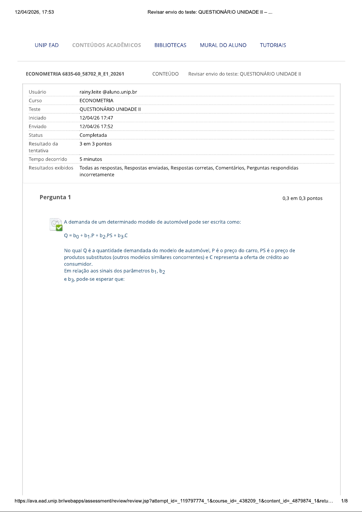 12/04/2026, 17:53 Revisar envio do teste: QUESTIONÁRIO UNIDADE UNIP EAD CONTEÚDOS ACADÊMICOS BIBLIOTECAS MURAL DO ALUNO TUTORIAIS ECONOMETRIA 6835-60_58702_R_E1_20261 CONTEÚDO Revisar envio do teste: QUESTIONÁRIO UNIDADE Usuário rainy.leite @aluno.unip.br Curso ECONOMETRIA Teste QUESTIONÁRIO UNIDADE Iniciado 12/04/26 17:47 Enviado 12/04/26 17:52 Status Completada Resultado da 3 em 3 pontos tentativa Tempo decorrido 5 minutos Resultados exibidos Todas as respostas, Respostas enviadas, Respostas corretas, Comentários, Perguntas respondidas incorretamente Pergunta 1 0,3 em 0,3 pontos A demanda de um determinado modelo de automóvel pode ser escrita como: No qual Q é a quantidade demandada do modelo de automóvel, P é preço do carro, PS é preço de produtos substitutos (outros modelos similares concorrentes) e representa a oferta de crédito ao consumidor. Em relação aos sinais dos parâmetros b1, b₂ e b3, pode-se esperar que: 1/812/04/2026, 17:53 Revisar envio do teste: QUESTIONÁRIO UNIDADE Resposta Selecionada: d. b1 seja negativo e b₂ e b3 sejam positivos. Respostas: b₂ seja positivo e b1 e sejam negativos. a. b. seja positivo e b1 e sejam negativos. b1 seja positivo e b₂ e sejam negativos. C. d. seja negativo e b₂ e b3 sejam positivos. b₂ seja negativo e b1 e sejam positivos. e. Comentário Resposta: D da resposta: Comentário: Regressão é uma importante técnica para medir ou estimar relações entre variáveis econômicas, ocupa-se do estudo da dependência de uma variável em relação a uma ou mais variáveis explicativas utilizadas pelos economistas para fins de análise estrutural (verificação de teorias econômicas), avaliação de políticas econômicas e previsão de valores futuros de variáveis de natureza econômica. objetivo é testar proposições teóricas nessas relações, procurando isolar, desagregar efeitos de relações de causalidades e estimar parâmetros envolvidos na construção de modelos econométricos. As proposições teóricas nessas relações entre variáveis e os efeitos de relações de causalidade estão expressas na lógica dos sinais (+: relação direta; ou -: relação inversa) dos parâmetros estimados no modelo. No modelo proposto, no qual a quantidade demandada de automóvel (Q) é uma relação inversa ao seu preço (P), será expressa pelo sinal negativo para b1, segue a lei da oferta e procura. Se preço do produto substituto aumenta, a relação é direta para com a demanda do automóvel (Q), a lógica será expressa pelo sinal positivo para b2. A oferta de crédito amplia a quantidade demandada do automóvel (Q), portanto, a lógica confere o sinal positivo para parâmetro estimado b3. Pergunta 2 0,3 em 0,3 pontos (ESAF/Analista do Banco Central do Brasil/2002). Relativamente ao teste da hipótese conjunta a alternativa assinale a opção correta. A notação F (m; n) representa a distribuição F com m graus de liberdade no numerador e n graus de liberdade no denominador. Resposta Selecionada: valor da estatística teste é 259 e esta tem distribuição F(2;14) sob e. Respostas: valor da estatística teste é 259 e esta tem distribuição F(2;15) sob H₀. a. b. valor da estatística teste é 518 e esta tem distribuição F(2;14) sob valor da estatística teste é 518 e esta tem distribuição F(3;16) sob H₀. C. d. O valor da estatística teste é 518 e esta tem distribuição F(2;15) sob H₀. valor da estatística teste é 259 e esta tem distribuição F(2;14) sob e. Comentário Resposta: E da resposta: Comentário: Completando ANOVA (Análise de Variância) Soma de Quadrado Médio Fonte g.l. F quadrados (SQ) (QM) Modelo (corrigido pela média) 2 0,518 0,259 259 Erro 14 0,014 0,001 Total (corrigido pela média) 16 0,532 Temos F(k; n-k-1) 259, em que k número de variáveis independentes (r: renda e p: preço) e (n-k-1), respectivamente graus de liberdade do Modelo e do Erro. Portanto, F(2; 14). cálculo do F (teste) é representado pela razão (divisão) do QM regressão pelo QM erro, isto é, 2/812/04/2026, 17:53 Revisar envio do teste: QUESTIONÁRIO UNIDADE 0,518/2 0,259 F = 259. 0,014/14 0,001 Pergunta 3 0,3 em 0,3 pontos (CESPE/UnB / CEBRASPE ANATEL - 2014) Em relação às propriedades do modelo clássico de regressão linear, assinale a alternativa FALSA. Resposta a. Selecionada: No processo de modelagem por regressão linear múltipla, como regra geral, define-se como melhor modelo aquele que produz maior coeficiente de determinação (R²). Respostas: a. No processo de modelagem por regressão linear múltipla, como regra geral, define-se como melhor modelo aquele que produz maior coeficiente de determinação b. modelo de regressão linear simples pela origem, cujo ajuste pelo método de mínimos quadrados ordinários se apresenta na forma = sempre gera estimativas viciadas para coeficiente ß. C. Na presença de autocorrelação dos resíduos, embora os estimadores de mínimos quadrados ordinários dos coeficientes do modelo não sejam viciados, eles se mostram estatisticamente ineficientes. d. Se as variáveis regressoras forem perfeitamente multicolineares, não será possível obter de forma única os estimadores de mínimos quadrados ordinários para os coeficientes do modelo de regressão. e. Se as variáveis regressoras forem perfeitamente colineares, não será possível obter de forma única os estimadores de mínimos quadrados ordinários para os coeficientes do modelo de regressão. Comentário Resposta: A da resposta: Comentário: uma medida que descreve a qualidade do ajuste obtido no modelo. Embora R² aumente com a adição de termos (variáveis independentes) ao modelo, isto não significa necessariamente que novo modelo é superior ao anterior. A questão é a inclusão indiscriminada de variáveis, mesmo que tenham muito pouco poder explicativo sobre a variável dependente, aumenta valor de R² e tende a prejudicar modelo (princípio da parcimônia). Uma medida que considera est