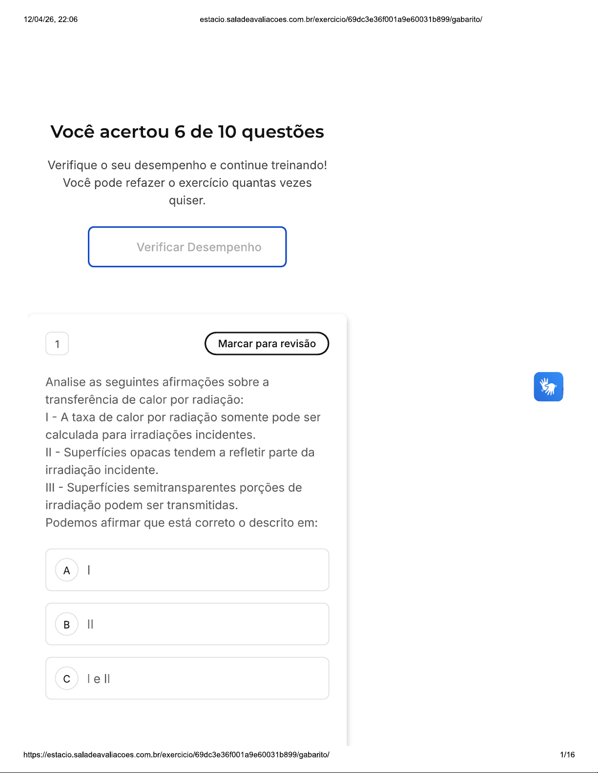 12/04/26, 22:06 estacio.saladeavaliacoes.com.br/exercicio/69dc3e36f001a9e60031b899/gabarito/ Você acertou 6 de 10 questões Verifique seu desempenho e continue treinando! Você pode refazer exercício quantas vezes quiser. Verificar Desempenho 1 Marcar para revisão Analise as seguintes afirmações sobre a transferência de calor por radiação: I - A taxa de calor por radiação somente pode ser calculada para irradiações incidentes. - Superfícies opacas tendem a refletir parte da irradiação incidente. III - Superfícies semitransparentes porções de irradiação podem ser transmitidas. Podemos afirmar que está correto descrito em: A I c le https://estacio.saladeavaliacoes.com.br/exercicio/69dc3e36f001a9e60031b899/gabarito/ 1/1612/04/26, 22:06 estacio.saladeavaliacoes.com.br/exercicio/69dc3e36f001a9e60031b899/gabarito/ D e III E I, e III Resposta correta Parabéns, você selecionou a alternativa correta. Confira gabarito comentado! Gabarito Comentado A alternativa correta é a D, que afirma que as superfícies opacas tendem a refletir parte da irradiação incidente (afirmação II) e que as superfícies semitransparentes podem transmitir porções de irradiação (afirmação III). A afirmação está incorreta, pois a taxa de calor por radiação não se limita apenas a irradiações incidentes. A energia radiante pode ser absorvida, refletida ou transmitida por um material, e a taxa na qual essa energia é absorvida pode ser calculada pela propriedade de absortividade. Portanto, é possível calcular a taxa de radiação tanto emitida quanto absorvida, não se restringindo apenas a irradiações incidentes. 2 Marcar para revisão Para fins de transferência de calor, um homem em pé pode ser considerado como um cilindro vertical de 32 cm de diâmetro e 180 cm de altura. As superfícies superior e inferior são isoladas e com a temperatura lateral de Qual é a perda de 2/1612/04/26, 22:06 estacio.saladeavaliacoes.com.br/exercicio/69dc3e36f001a9e60031b899/gabarito/ transferência de calor por convecção em um meio ambiente de coeficiente de transferência de calor por convecção é de 15 W/m²K. A 217 W 100 W c 301 W D 294 W E 850 W Resposta correta Parabéns, você selecionou a alternativa correta. Confira gabarito comentado! Gabarito Comentado Aplicando a lei de resfriamento de Newton observamos que temos todas as variáveis para calcular fluxo de transferência de calor por convecção. No entanto, precisamos ter cuidado no cálculo da área de transferência. Essa área é representada como a parte lateral do cilindro, se abrirmos ele, observamos que é um retângulo, tendo como base o perímetro da circunferência e outro lado a altura do cilindro: 3/1612/04/26, 22:06 estacio.saladeavaliacoes.com.br/exercicio/69dc3e36f001a9e60031b899/gabarito/ 15W 3 Marcar para revisão Analise as afirmações abaixo no que tange a transferência de calor. Selecione a alternativa que supre as omissões das afirmações: I - calor do Sol chega até nós por Uma moeda bem polida fica quente do que uma moeda revestida de tinta preta, quando ambas são expostas ao sol. III Numa barra metálica aquecida numa extremidade, a propagação do calor se dá para a outra extremidade por A Radiação - menos - convecção. Convecção - mais - radiação c Radiação menos - condução. D Convecção - mais - condução E Condução mais radiação. Resposta correta https://estacio.saladeavaliacoes.com.br/exercicio/69dc3e36f001a9e60031b899/gabarito/ 4/1612/04/26, 22:06 Parabéns, você selecionou a alternativa correta. Confira gabarito comentado! Gabarito Comentado calor do Sol chega até nós por radiação, pois entre Sol e a Terra não existe meio material. Assim, não é possível que calor se propague de outra forma; Uma moeda bem polida fica menos quente do que uma moeda revestida de tinta preta, quando ambas são expostas ao sol. Isso porque uma moeda polida refletirá a energia que recebe, enquanto a moeda revestida de tinta preta absorverá calor que recebe; III Em uma barra metálica aquecida em uma extremidade, a propagação do calor ocorre para a outra extremidade por condução, uma vez que, em meios sólidos, calor somente se propaga por meio da condução. 4 Marcar para revisão Vamos considerar a transferência de calor em regime estacionário entre duas placas paralelas às temperaturas constantes de T1= 320K e T2= 290 K, separadas entre elas por 2 cm. Supondo que as duas superfícies têm uma emissividade de 0,7. Qual seria a transferência de calor entres as placas por unidade de área superficial supondo que espaço entre elas está recheada de um super isolante opaco com condutividade térmica de 0,0002 W/mK? 5/1612/04/26, 22:06 estacio.saladeavaliacoes.com.br/exercicio/69dc3e36f001a9e60031b899/gabarito/ A 1 B 0,3 c 1,5 D 0,7 E 0,2 Resposta correta Parabéns, você selecionou a alternativa correta. Confira gabarito comentado! Gabarito Comentado Qualquer tipo de radiação incidente nas placas será absorvido totalmente e transferida ao interior entre essas duas placas. Ou seja, que dentro das duas placas podem acontecer dois tipos de transferência de calor, radiação ou condução. Mas será que temos radiação? Por material ser um sólido opaco a transferência de calor por condução é predominante, se fosse um material semitransparente, as duas transferências aconteceriam no meio. Por tanto, vamos calcular a taxa de transferência de calor por condução entre essas duas placas: 6/1612/04/26, 22:06 estacio.saladeavaliacoes.com.br/exercicio/69dc3e36f001a9e60031b899/gabarito/ A = 2x10 W (320 0,02m 290 K) = 5 Marcar para revisão Considere uma pessoa cuja área de superfície exposta é de 1,8 m², sua emissividade é 0,75 e sua temperatura superficial é de Qual é a perda de calor de radiação dessa pessoa em uma grande sala que tem paredes a uma temperatura de 288 K? A 153 W 57 W c -153 W D -57 W E 85 W 7/1612/04/26, 22:06 Resposta correta Parabéns, você selecionou a