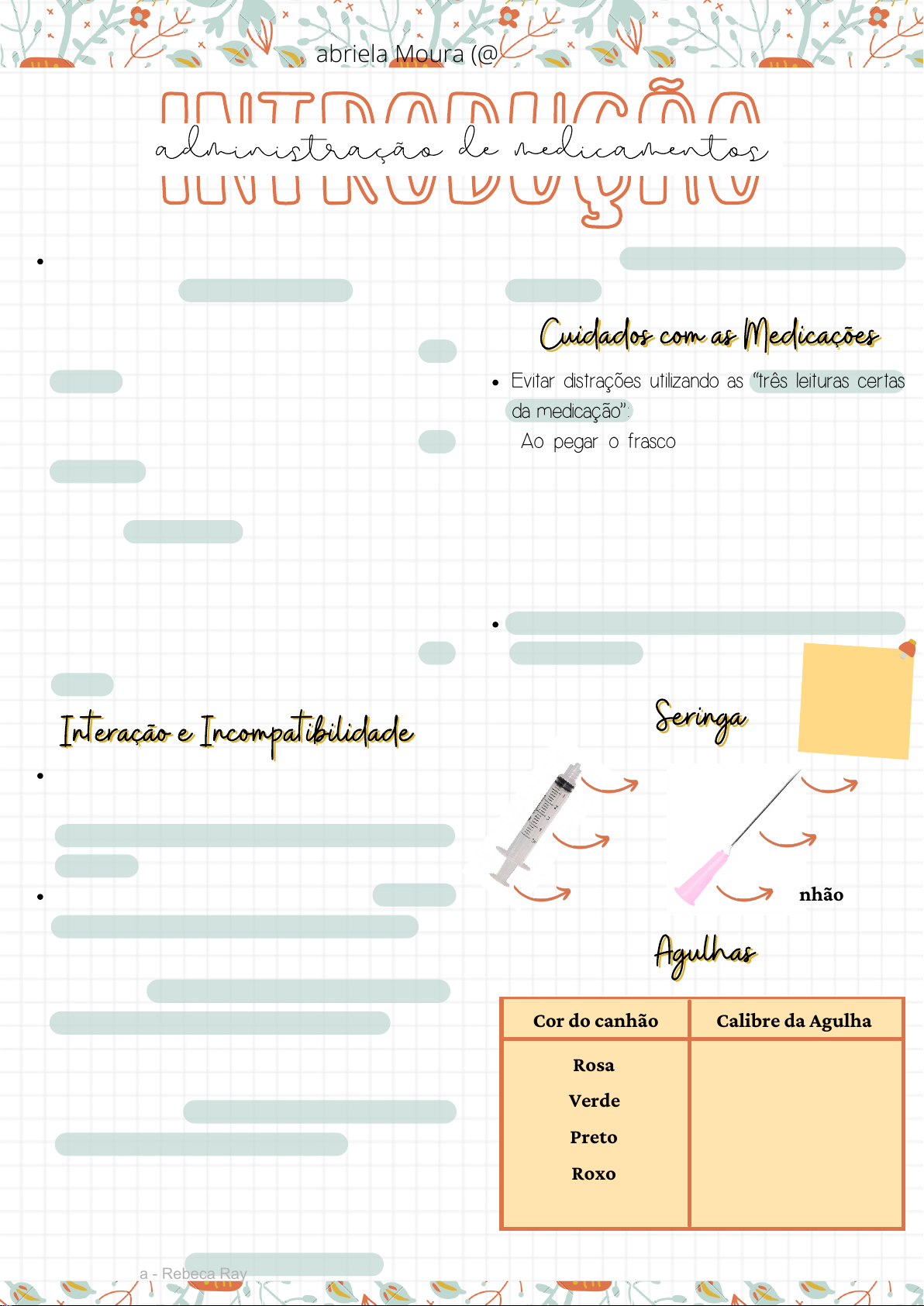 introduçãointrodução Medicação: uma substância introduzida no organismo para finalidade terapêutica. As interações medicamentosas têm importância considerável, uma vez que estas exercem influencia direta sobre o efeito farmacológico desejado. Existem três tipos de interações: fármaco cinéticas, fármaco dinâmicas e físico químicas. ↳Preventiva: quando evita o aparecimento de doenças ou diminui a gravidade das mesmas. Ex.: vacinas; ↳Paliativa: quando alivia determinados sintomas de uma doença, destacando-se entre eles a dor. Ex.: analgésico; ↳Curativa: quando remove o agente causal das doenças. Ex.: antibiótico; ↳Substitutiva: quando repõe outra substância normalmente encontrada no organismo, mas que por um desequilíbrio orgânico, está em quantidade insuficiente ou mesmo ausente. Ex.: insulina. administração de medicamentos Interação e IncompatibilidadeInteração e Incompatibilidade Evitar distrações utilizando as “três leituras certas da medicação”: Ao pegar o frasco ou ampola confira o rótulo pela primeira vez; Ao aspirar a medicação confira o rótulo pela segunda vez; Ao desprezar o frasco leia o rótulo pela terceira vez. Preparar o medicamento de cada paciente separadamente; -vando-se ou formando uma substancia tóxica ao organismo. 1. 2. 3. ↳Interações fármacos cinéticas é quando uma substância interfere na absorção, distribuição, biotransformação ou eliminação da outra quando administradas conjuntamente. ↳Interações fármaco dinâmicas ou farmacológicas é quando a interação está relacionada ao mecanismo de ação dos fármacos, que podem ser aditivos ou antagônicos e interferem diretamente no efeito farmacológico desejado. ↳Interações físico-químicas é quando duas ou mais substancias reagem de forma direta, inati- Cuidados com as MedicaçõesCuidados com as Medicações Não administrar medicamentos preparados por outras pessoas. SeringaSeringa Bico Cilindro Êmbolo Bisel Haste Canhão AgulhasAgulhas Cor do canhão Calibre da Agulha Rosa Verde Preto Roxo Marrom 40x12 25x8, 30x8 25x7, 30x7 20x5, 5 13x4, 4 Criado por Gabriela Moura (@enfermeira.formando) Licenciado para - Rebeca Rayane de Sousa Marinho - Protegido por Eduzz.com