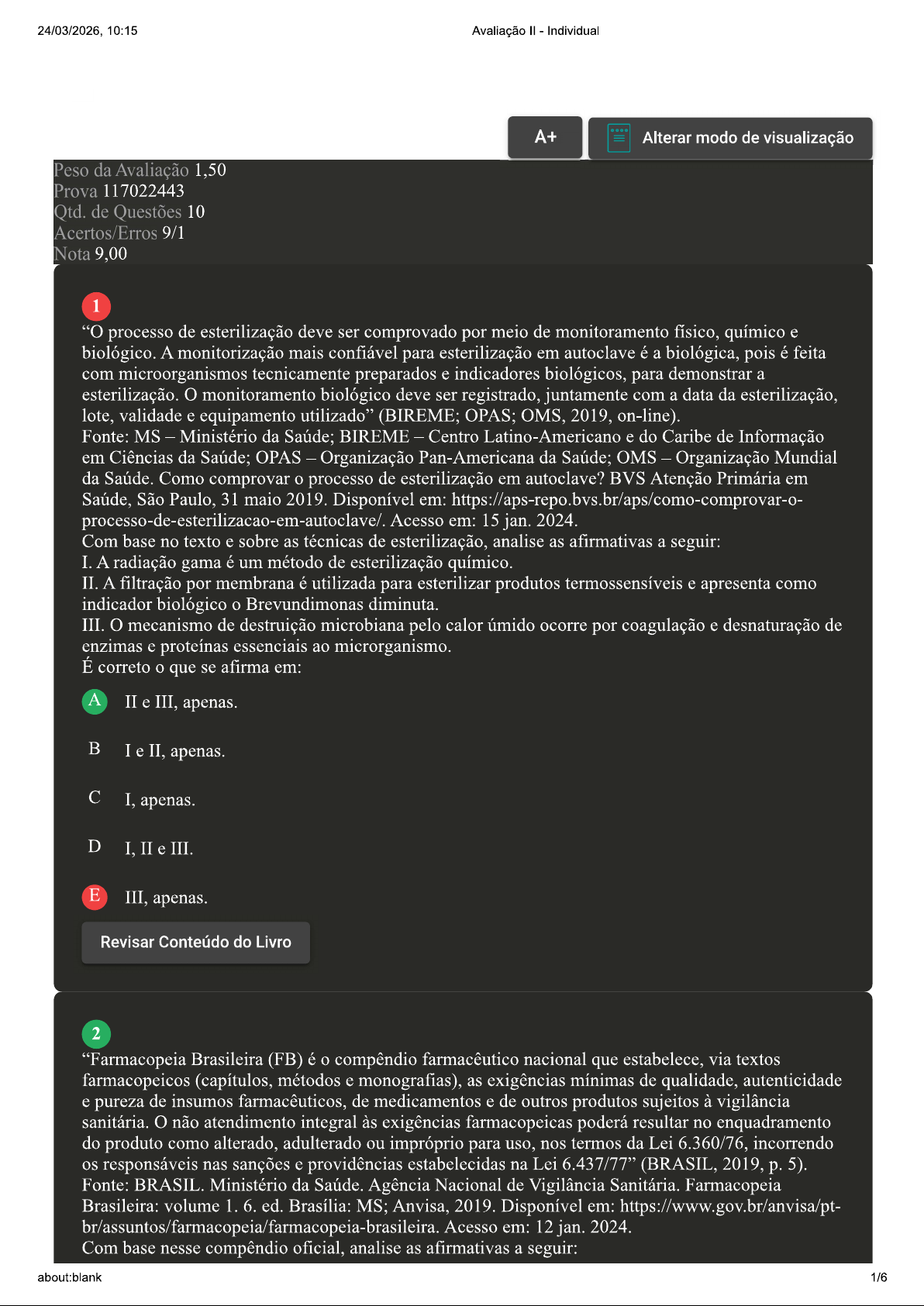 24/03/2026, 10:15 Avaliação Individual A+ Alterar modo de visualização Peso da Avaliação 1,50 Prova 117022443 Qtd. de Questões 10 Acertos/Erros 9/1 Nota 9,00 1 processo de esterilização deve ser comprovado por meio de monitoramento físico, químico e biológico. A monitorização mais confiável para esterilização em autoclave é a biológica, pois é feita com microorganismos tecnicamente preparados e indicadores biológicos, para demonstrar a esterilização. monitoramento biológico deve ser registrado, juntamente com a data da esterilização, lote, validade e equipamento utilizado" (BIREME; OPAS; OMS, 2019, on-line). Fonte: MS Ministério da Saúde; BIREME Centro Latino-Americano e do Caribe de Informação em Ciências da Saúde; OPAS Organização Pan-Americana da Saúde; OMS Organização Mundial da Saúde. Como comprovar o processo de esterilização em autoclave? BVS Atenção Primária em Saúde, São Paulo, 31 maio 2019. Disponível em: processo-de-esterilizacao-em-autoclave/. Acesso em: 15 jan. 2024. Com base no texto e sobre as técnicas de esterilização, analise as afirmativas a seguir: I. A radiação gama é um método de esterilização químico. II. A filtração por membrana é utilizada para esterilizar produtos termossensíveis e apresenta como indicador biológico o Brevundimonas diminuta. III. mecanismo de destruição microbiana pelo calor úmido ocorre por coagulação e desnaturação de enzimas e proteínas essenciais ao microrganismo. É correto o que se afirma em: A II e III, apenas. I e II, apenas. I, apenas. D I, II e III. E III, apenas. Revisar Conteúdo do Livro 2 "Farmacopeia Brasileira (FB) é o compêndio farmacêutico nacional que estabelece, via textos farmacopeicos (capítulos, métodos e monografias), as exigências mínimas de qualidade, autenticidade e pureza de insumos farmacêuticos, de medicamentos e de outros produtos sujeitos à vigilância sanitária. não atendimento integral às exigências farmacopeicas poderá resultar no enquadramento do produto como alterado, adulterado ou impróprio para uso, nos termos da Lei 6.360/76, incorrendo os responsáveis nas sanções e providências estabelecidas na Lei 6.437/77" (BRASIL, 2019, 5). Fonte: BRASIL. Ministério da Saúde. Agência Nacional de Vigilância Sanitária. Farmacopeia Brasileira: volume 1.6. ed. Brasília: MS; Anvisa, 2019. Disponível em: https://www.gov.br/anvisa/pt- Acesso em: 12 jan. 2024. Com base nesse compêndio oficial, analise as afirmativas a seguir: about:blank 1/624/03/2026, 10:15 Avaliação Individual I. A Farmacopeia Brasileira é dividida em capítulos que descrevem métodos analíticos e monografias. II. Os métodos descritos na farmacopeia podem ser adaptados sem a necessidade de validação analítica. III. A Farmacopeia Brasileira estabelece os parâmetros de aceitabilidade dos produtos disponibilizados à população. É correto o que se afirma em: A I, II e III. I, apenas. I e III, apenas. D III, apenas. E II e III, apenas. 3 Os métodos analíticos são frequentemente classificados como clássicos e instrumentais. Os métodos clássicos precederam os métodos instrumentais por um século ou mais. Eles envolvem análise volumétrica e análise gravimétrica. Já os métodos instrumentais envolvem cromatografia a gás, cromatografia a líquido, potenciometria, condutometria, entre outros. Com base nas informações apresentadas, analise as afirmativas a seguir: I. Os métodos clássicos apresentam baixa exatidão e precisão, porém maior rapidez. II. Os métodos instrumentais apresentam sensibilidade e reprodutibilidade, mas podem apresentar alto custo de equipamento. III. Os métodos clássicos utilizam um sinal gerado por um instrumento para detectar a quantidade de um analito em uma amostra. IV. Os métodos instrumentais são ensaios físicos de identificação os quais podem ser baseados em espectros, cromatogramas ou medidas diretas de propriedades físico-químicas. Fonte: adaptado de: GAUTO, A.; ROSA, G. R.; GONÇALVES, F.F. Química analítica: práticas de laboratório (Tekne). Porto Alegre: Grupo A, 2013. E-book. Disponível em: https://app.minhabiblioteca.com.br/#/books/9788565837705/. Acesso em: 12 jan. 2024. Com base nas informações apresentadas, analise as afirmativas a seguir: I. Os métodos clássicos apresentam baixa exatidão e precisão, porém maior rapidez. II. Os métodos instrumentais apresentam sensibilidade e reprodutibilidade, mas podem apresentar alto custo de equipamento. III. Os métodos clássicos utilizam um sinal gerado por um instrumento para detectar a quantidade de um analito em uma amostra. IV. Os métodos instrumentais são ensaios físicos de identificação os quais podem ser baseados em espectros, cromatogramas ou medidas diretas de propriedades físico-químicas. É correto o que se afirma em: A II e III, apenas. I, apenas. II e IV, apenas. D I, II, III e IV. about:blank 2/624/03/2026, 10:15 Avaliação Individual E I e III, apenas. 4 A Resolução RDC 113/16 altera a resolução de estudo de estabilidade de produtos, em caso de alteração ou inclusão de local de fabricação, e a instrução normativa de lotes pilotos. Com a publicação da RDC 113/16, o relatório de estudo de estabilidade referente a um lote do produto acabado poderá ser substituído pelo protocolo de estudo de estabilidade referente aos três lotes iniciais, desde que a empresa peticione, ao mesmo tempo, resultados de estudos de acompanhamento ou de longa duração realizados para referido produto no local de fabricação anterior. Fonte: adaptado de: BRASIL. Agência Nacional de Vigilância Sanitária. Relatório de estudo de estabilidade passa por alteração. 2022. Disponível em: https://www.gov.br/anvisa/pt- br/assuntos/noticias-anvisa/2016/relatorio-de-estudo-de-estabilidade-passa-por-alteracao.. Acesso em: 26 jul. 2023. Com base no texto e sobre as informações obrigatórias que devem constar no relatório de estabilidade,
