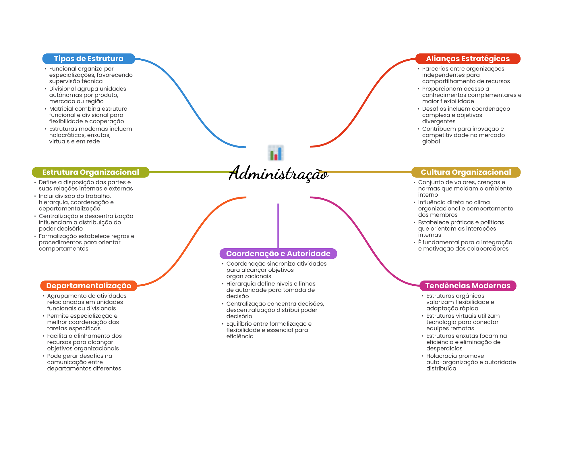 Tipos de Estrutura Alianças Estratégicas Funcional organiza por Parcerias entre organizações especializações, favorecendo independentes para supervisão técnica compartilhamento de recursos Divisional agrupa unidades Proporcionam acesso a autônomas por produto, conhecimentos complementares e mercado ou região maior flexibilidade Matricial combina estrutura Desafios incluem coordenação funcional e divisional para complexa e objetivos flexibilidade e cooperação divergentes Estruturas modernas incluem Contribuem para inovação e holacráticas, enxutas, competitividade no mercado virtuais e em rede global Estrutura Organizacional Administração Cultura Organizacional Define a disposição das partes e Conjunto de valores, crenças e suas relações internas e externas normas que moldam ambiente Inclui divisão do trabalho, interno hierarquia, coordenação e Influência direta no clima departamentalização organizacional e comportamento Centralização e descentralização dos membros influenciam a distribuição do Estabelece práticas e políticas poder decisório que orientam as interações Formalização estabelece regras e internas procedimentos para orientar É fundamental para a integração comportamentos e motivação dos colaboradores Coordenação e Autoridade Coordenação sincroniza atividades para alcançar objetivos organizacionais Hierarquia define níveis e linhas Tendências Modernas de autoridade para tomada de Agrupamento de atividades decisão Estruturas orgânicas relacionadas em unidades Centralização concentra decisões, valorizam flexibilidade e funcionais ou divisionais descentralização distribui poder adaptação rápida Permite especialização e decisório Estruturas virtuais utilizam melhor coordenação das Equilíbrio entre formalização e tecnologia para conectar tarefas específicas flexibilidade é essencial para equipes remotas Facilita alinhamento dos eficiência Estruturas enxutas focam na recursos para alcançar eficiência e eliminação de objetivos organizacionais desperdícios Pode gerar desafios na Holacracia promove comunicação entre auto-organização e autoridade departamentos diferentes distribuída