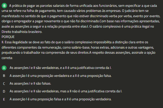 8 A prática de pagar as parcelas salariais de forma unificada aos funcionários, sem especificar a que cada uma se refere na folha de pagamento, tem causado vários problemas às empresas. 0 judiciário tem se manifestado no sentido de que 0 pagamento que não estiver discriminado verba por verba, evento por evento, obriga empregador a pagar novamente 0 que não foi discriminado.Com base nas informações apresentadas, avalie as asserções a seguir e a relação proposta entre elas:l. 0 complessivo é uma prática ilegal no Direito trabalhista brasileiro. PORQUE II. Essa ilegalidade se deve ao fato de que 0 complessivo impossibilita a distinção clara entre diferentes componentes da remuneração, como horas extras, adicionais e outras vantagens, prejudicando 0 trabalhador na compreensão de seus direitos.A respeito dessas asserções, assinale a opção correta: A As asserções I e II são verdadeiras, e a II é uma justificativa correta da I. B A asserção I é uma proposição verdadeira e a II é uma proposição falsa. As asserções I e II são falsas. D As asserções I e são verdadeiras, mas a não é uma justificativa correta da I. E A asserção I uma proposição falsa e a uma proposição verdadeira.