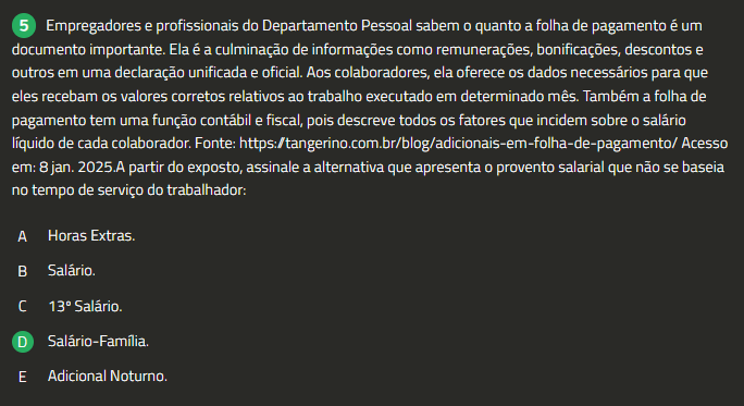 5 Empregadores e profissionais do Departamento Pessoal sabem 0 quanto a folha de pagamento um documento importante. Ela a culminação de informações como remunerações, bonificações, descontos e outros em uma declaração unificada e oficial. Aos colaboradores, ela oferece dados necessários para que eles recebam valores corretos relativos ao trabalho executado em determinado mês. Também a folha de pagamento tem uma função contábil e fiscal, pois descreve todos fatores que incidem sobre 0 salário líquido de cada colaborador. Fonte: em: 8 jan. 2025.A partir do exposto, assinale a alternativa que apresenta 0 provento salarial que não se baseia no tempo de serviço do trabalhador: A Horas Extras. B Salário. 13° Salário. D Salário-Família. E Adicional Noturno.