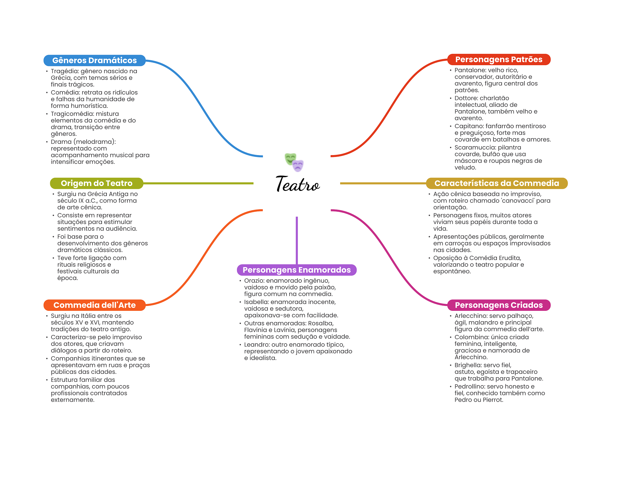 Gêneros Dramáticos Personagens Patrões Tragédia: gênero nascido na Pantalone: velho rico, Grécia, com temas sérios e conservador, autoritário e finais trágicos. avarento, figura central dos Comédia: retrata ridículos patrões. e falhas da humanidade de Dottore: charlatão forma humorística. intelectual, aliado de Tragicomédia: mistura Pantalone, também velho e elementos da comédia e do avarento. drama, transição entre Capitano: fanfarrão mentiroso gêneros. e preguiçoso, forte mas Drama (melodrama): covarde em batalhas e amores. representado com Scaramuccia: pilantra acompanhamento musical para covarde, bufão que usa intensificar emoções. máscara e roupas negras de veludo. Origem do Teatro Teatro Características da Commedia Surgiu na Grécia Antiga no Ação cênica baseada no improviso, século IX a.C., como forma com roteiro chamado 'canovacci' para de arte cênica. orientação. Consiste em representar Personagens fixos, muitos atores situações para estimular viviam seus papéis durante toda a sentimentos na vida. Foi base para Apresentações públicas, geralmente desenvolvimento dos gêneros em carroças ou espaços improvisados dramáticos clássicos. nas cidades. Teve forte ligação com Oposição à Comédia Erudita, rituais religiosos e valorizando teatro popular e festivais culturais da Personagens Enamorados espontâneo. época. Orazio: enamorado ingênuo, vaidoso e movido pela paixão, figura comum na commedia. Commedia dell'Arte Isabella: enamorada inocente, vaidosa e sedutora, Personagens Criados Surgiu na Itália entre apaixonava-se com facilidade. Arlecchino: servo palhaço, séculos XV e XVI, mantendo Outras enamoradas: Rosalba, ágil, malandro e principal tradições do teatro antigo. Flavínia e Lavínia, personagens figura da commedia dell'arte. Caracteriza-se pelo improviso femininas com sedução e vaidade. Colombina: única criada dos atores, que criavam Leandro: outro enamorado típico, feminina, inteligente, diálogos a partir do roteiro. representando jovem apaixonado graciosa e namorada de Companhias itinerantes que se e idealista. Arlecchino. apresentavam em ruas e praças Brighella: servo fiel, públicas das cidades. astuto, egoísta e trapaceiro Estrutura familiar das que trabalha para Pantalone. companhias, com poucos Pedrollino: servo honesto e profissionais contratados fiel, conhecido também como externamente. Pedro ou Pierrot.