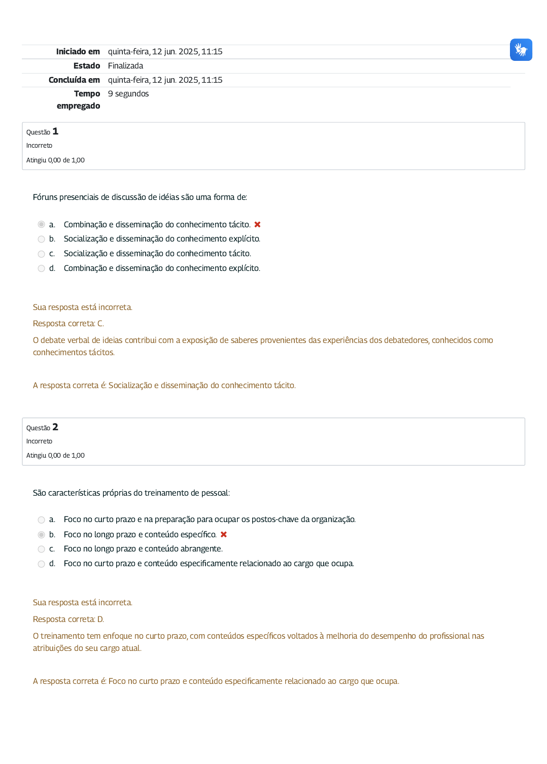 Iniciado em quinta-feira, 12 jun. 2025, 11:15 Estado Finalizada Concluída em quinta-feira, 12 jun. 2025, 11:15 Tempo empregado 9 segundos Questão 1 Incorreto Atingiu 0,00 de 1,00 Questão 2 Incorreto Atingiu 0,00 de 1,00 Fóruns presenciais de discussão de idéias são uma forma de: a. Combinação e disseminação do conhecimento tácito. b. Socialização e disseminação do conhecimento explícito. c. Socialização e disseminação do conhecimento tácito. d. Combinação e disseminação do conhecimento explícito. Sua resposta está incorreta. Resposta correta: C. O debate verbal de ideias contribui com a exposição de saberes provenientes das experiências dos debatedores, conhecidos como conhecimentos tácitos. A resposta correta é: Socialização e disseminação do conhecimento tácito. São características próprias do treinamento de pessoal: a. Foco no curto prazo e na preparação para ocupar os postos-chave da organização. b. Foco no longo prazo e conteúdo específico. c. Foco no longo prazo e conteúdo abrangente. d. Foco no curto prazo e conteúdo especificamente relacionado ao cargo que ocupa. Sua resposta está incorreta. Resposta correta: D. O treinamento tem enfoque no curto prazo, com conteúdos específicos voltados à melhoria do desempenho do profissional nas atribuições do seu cargo atual. A resposta correta é: Foco no curto prazo e conteúdo especificamente relacionado ao cargo que ocupa. Questão 3 Incorreto Atingiu 0,00 de 1,00 Questão 4 Correto Atingiu 1,00 de 1,00 No processo de aprendizagem, é fundamental a: a. Transformação de conceitos abstratos em práticas e métodos aplicáveis no dia a dia laboral. b. Transformação de práticas e métodos do dia a dia em conceitos abstratos. c. Transformação de ideias em outras teorias e conceitos. d. Elaboração de um programa geral de treinamento, com capacitações padronizadas para toda a organização. Sua resposta está incorreta. Resposta correta: A. O êxito do treinamento e do desenvolvimento se dá quando há capacidade de pôr em prática um conteúdo teórico que foi aprendido. A resposta correta é: Transformação de conceitos abstratos em práticas e métodos aplicáveis no dia a dia laboral. Formam os três componentes da gestão por competências: a. Conhecimentos, técnicas e práticas de trabalho. b. Conhecimentos, habilidades e atitudes. c. Habilidades, comportamentos e práticas de trabalho. d. Comportamentos, técnicas e práticas de trabalho. Sua resposta está correta. Resposta correta: B. Os pilares da gestão por competências englobam saber, saber fazer e agir. A resposta correta é: Conhecimentos, habilidades e atitudes. Questão 5 Incorreto Atingiu 0,00 de 1,00 O monitoramento do profissional na organização ocorre: a. Desde a entrada na entidade e, no caso dos servidores públicos, até o fim do seu estágio probatório. b. Após o período de experiência até sua completa adaptação ao ambiente organizacional. c. Desde a entrada na entidade até sua completa adaptação ao ambiente organizacional. d. Desde a entrada na entidade e continua enquanto perdurarem seus serviços. Sua resposta está incorreta. Resposta correta: D. O monitoramento se dá desde a entrada na entidade e deve permanecer enquanto houver o vínculo profissional, de modo a contribuir com a produtividade do colaborador e o seu alinhamento às diretrizes institucionais. A resposta correta é: Desde a entrada na entidade e continua enquanto perdurarem seus serviços.