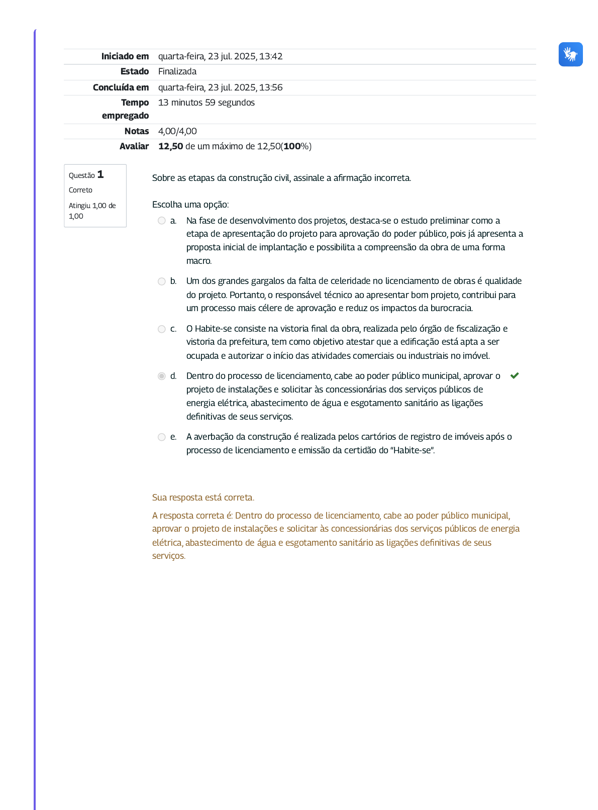Questão 1 Correto Atingiu 1,00 de 1,00 Iniciado em quarta-feira, 23 jul. 2025, 13:42 Estado Finalizada Concluída em quarta-feira, 23 jul. 2025, 13:56 Tempo empregado 13 minutos 59 segundos Notas 4,00/4,00 Avaliar 12,50 de um máximo de 12,50(100%) Sobre as etapas da construção civil, assinale a afirmação incorreta. Escolha uma opção: a. Na fase de desenvolvimento dos projetos, destaca-se o estudo preliminar como a etapa de apresentação do projeto para aprovação do poder público, pois já apresenta a proposta inicial de implantação e possibilita a compreensão da obra de uma forma macro. b. Um dos grandes gargalos da falta de celeridade no licenciamento de obras é qualidade do projeto. Portanto, o responsável técnico ao apresentar bom projeto, contribui para um processo mais célere de aprovação e reduz os impactos da burocracia. c. O Habite-se consiste na vistoria final da obra, realizada pelo órgão de fiscalização e vistoria da prefeitura, tem como objetivo atestar que a edificação está apta a ser ocupada e autorizar o início das atividades comerciais ou industriais no imóvel. d. Dentro do processo de licenciamento, cabe ao poder público municipal, aprovar o projeto de instalações e solicitar às concessionárias dos serviços públicos de energia elétrica, abastecimento de água e esgotamento sanitário as ligações definitivas de seus serviços. e. A averbação da construção é realizada pelos cartórios de registro de imóveis após o processo de licenciamento e emissão da certidão do “Habite-se”. Sua resposta está correta. A resposta correta é: Dentro do processo de licenciamento, cabe ao poder público municipal, aprovar o projeto de instalações e solicitar às concessionárias dos serviços públicos de energia elétrica, abastecimento de água e esgotamento sanitário as ligações definitivas de seus serviços. Questão 2 Correto Atingiu 1,00 de 1,00 Quais são os principais impactos do custo da burocracia para a economia do país: Aponte se as afirmações abaixo são verdadeiras (V) ou falsas (F). ( ) Queda do PIB brasileiro ( ) Redução de emprego formal ( ) Déficit habitacional ( ) Aumento da construção irregular ( ) Impacto na arrecadação (receita) municipal: taxa de licenciamento, ISS, aplicação do IPTU e do ITBI ( ) Lucro para o construtor Marque a opção com a sequência correta: Escolha uma opção: a. V, V, F, F e V b. V, F, V, F e V c. F, F, F, F e V d. V, V, V, V e F e. F, F, F, F e F Sua resposta está correta. As respostas corretas são: V, V, V, V e F , F, F, F, F e F Questão 3 Correto Atingiu 1,00 de 1,00 Aponte se as afirmações abaixo são verdadeiras (V) ou falsas (F). ( ) A sobreposição de exigências, a complexidade e inconsistências nas legislações municipais, ou até mesmo a ausência de disponibilização de informação dos parâmetros edilícios e urbanísticos aceitos do local pretendido, podem dificultar a prospecção do terreno, e comprometer os estudos de viabilidade e desenvolvimento dos projetos. ( ) Após a finalização da obra licenciada, todas as ligações definitivas devem ser solicitadas e estabelecidas pelas concessionárias dos serviços públicos de energia elétrica, abastecimento de água e esgotamento sanitário. A concessionária realizará vistoria para verificar se o projeto arquitetônico aprovado corresponde à obra construída. Não havendo problemas, será ativado o fornecimento de energia e água junto à rede pública, além da ligação à rede de esgoto. ( ) Auto de Vistoria do Corpo de Bombeiros (AVCB) é um documento oficial, no qual se indica que o imóvel foi vistoriado e está dentro das normas de segurança contra incêndios e pânico, previstas na legislação e no PPCI (Plano de Prevenção e Combate de Incêndios). ( ) O imóvel pode ser averbado no cartório de registro de imóveis antes da certidão do “Habite-se”. Marque a opção com a sequência correta: Escolha uma opção: a. V, V, F e F b. V, F, V e F c. F, F, F e F d. F, F, V e V e. V, V, V e F Sua resposta está correta. A resposta correta é: V, V, V e F Questão 4 Correto Atingiu 1,00 de 1,00 Aponte se as afirmações abaixo são verdadeiras (V) ou falsas (F) relacionadas ao impacto da burocracia. ( ) A burocracia é necessária para o bem andamento das atividades relacionadas à gestão pública - o excesso da burocracia é que atrasa ou paraliza os processos. ( ) Ausência de padronização e clareza no processo de licenciamento provocam interpretações contrárias, às aprovações obtidas anteriormente no processo. ( ) Alterações de legislações ou inclusão de novos itens de atendimento nas regulamentações, provocam retrabalho. ( ) Falta de capacitação dos recursos humanos ou a ausência de coordenação dos processos de tramitação na prefeitura atrasam os prazos de análise e vistoria das obras. Marque a opção com a sequência correta: Escolha uma opção: a. V, V, F e F b. V, F, V e F c. V, F, F e F d. F, F, V e F e. V, V, V e V Sua resposta está correta. A resposta correta é: V, V, V e V