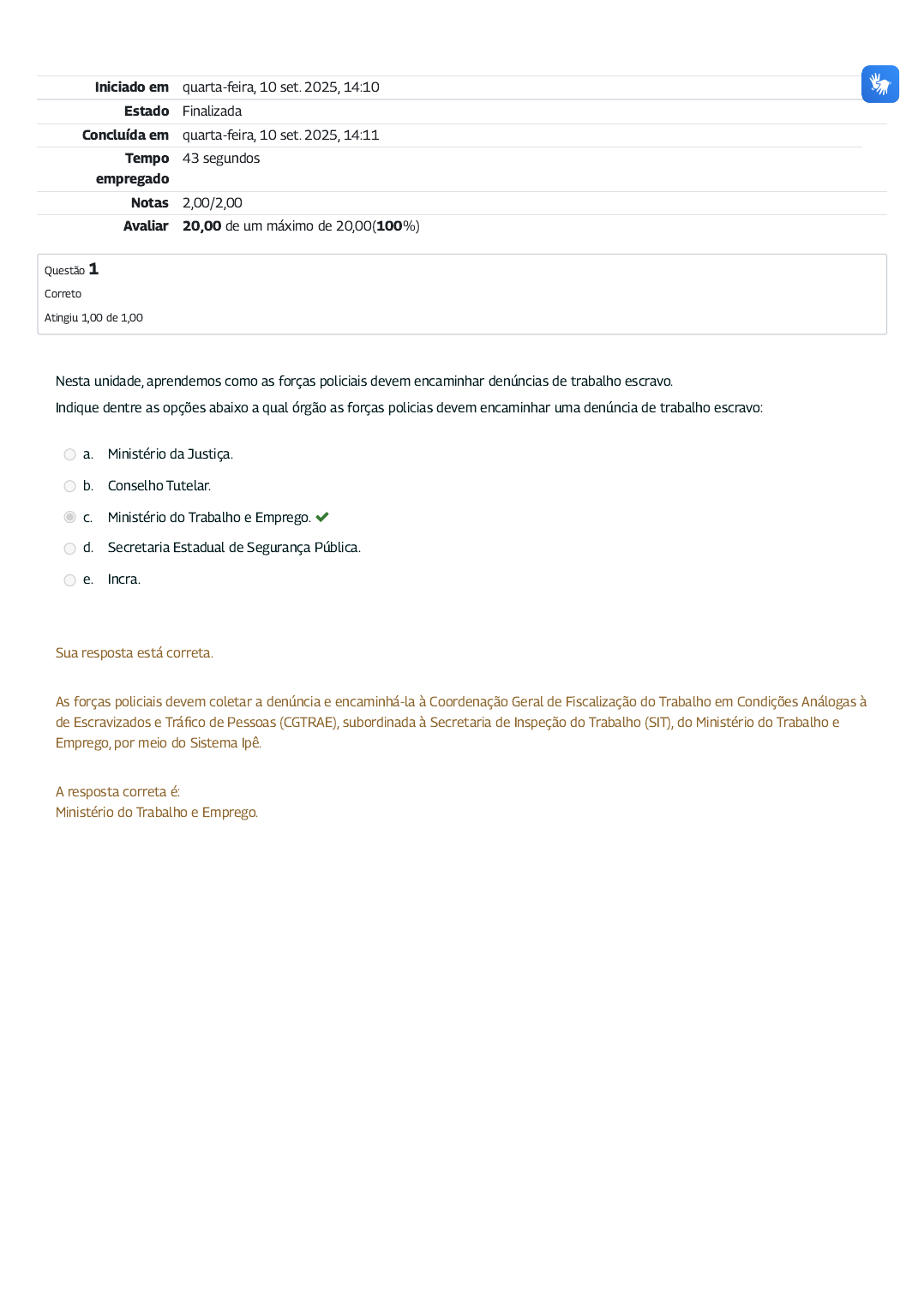 Iniciado em quarta-feira, 10 set. 2025, 14:10 Estado Finalizada Concluída em quarta-feira, 10 set. 2025, 14:11 Tempo empregado 43 segundos Notas 2,00/2,00 Avaliar 20,00 de um máximo de 20,00(100%) Questão 1 Correto Atingiu 1,00 de 1,00 Nesta unidade, aprendemos como as forças policiais devem encaminhar denúncias de trabalho escravo. Indique dentre as opções abaixo a qual órgão as forças policias devem encaminhar uma denúncia de trabalho escravo: a. Ministério da Justiça. b. Conselho Tutelar. c. Ministério do Trabalho e Emprego. d. Secretaria Estadual de Segurança Pública. e. Incra. Sua resposta está correta. As forças policiais devem coletar a denúncia e encaminhá-la à Coordenação Geral de Fiscalização do Trabalho em Condições Análogas à de Escravizados e Tráfico de Pessoas (CGTRAE), subordinada à Secretaria de Inspeção do Trabalho (SIT), do Ministério do Trabalho e Emprego, por meio do Sistema Ipê. A resposta correta é: Ministério do Trabalho e Emprego. Questão 2 Correto Atingiu 1,00 de 1,00 A força policial com prerrogativa de integração nas operações de fiscalização de trabalho escravo é a Polícia Federal e, a depender do contexto, a Polícia Rodoviária Federal. A Auditoria Fiscal do Trabalho, como coordenadora da ação fiscal, segundo a determinação do Fluxo Nacional de Atendimento às Vítimas de Trabalho Escravo, comunica às forças policiais para participação da força-tarefa. Quais são as funções da Polícia Federal numa operação fiscal de trabalho escravo? a. Segurança dos agentes do poder público integrantes da força-tarefa de fiscalização. b. Segurança das vítimas resgatadas do trabalho escravo durante a operação. c. Atuação como polícia judiciária, coletando e organizando o conjunto probatório do crime de trabalho escravo. d. Flagrante de outras práticas criminosas presentes numa operação em que se constatou a presença de trabalho escravo. e. Todas as alternativas anteriores. Sua resposta está correta. Durante uma operação fiscalizatória de trabalho escravo, coordenada pela Auditoria Fiscal do Trabalho, a Polícia Federal deve atuar para a segurança da equipe de fiscalização e das vítimas resgatas; realizar o seu papel de polícia judiciária, principalmente, no que se refere à coleta e encaminhamento de provas para a instauração do processo criminal por parte do MPF e, por fim, registrar o flagrante e dar o devido encaminhamento referente a outros crimes que possam ser constatados no local. A resposta correta é: Todas as alternativas anteriores.