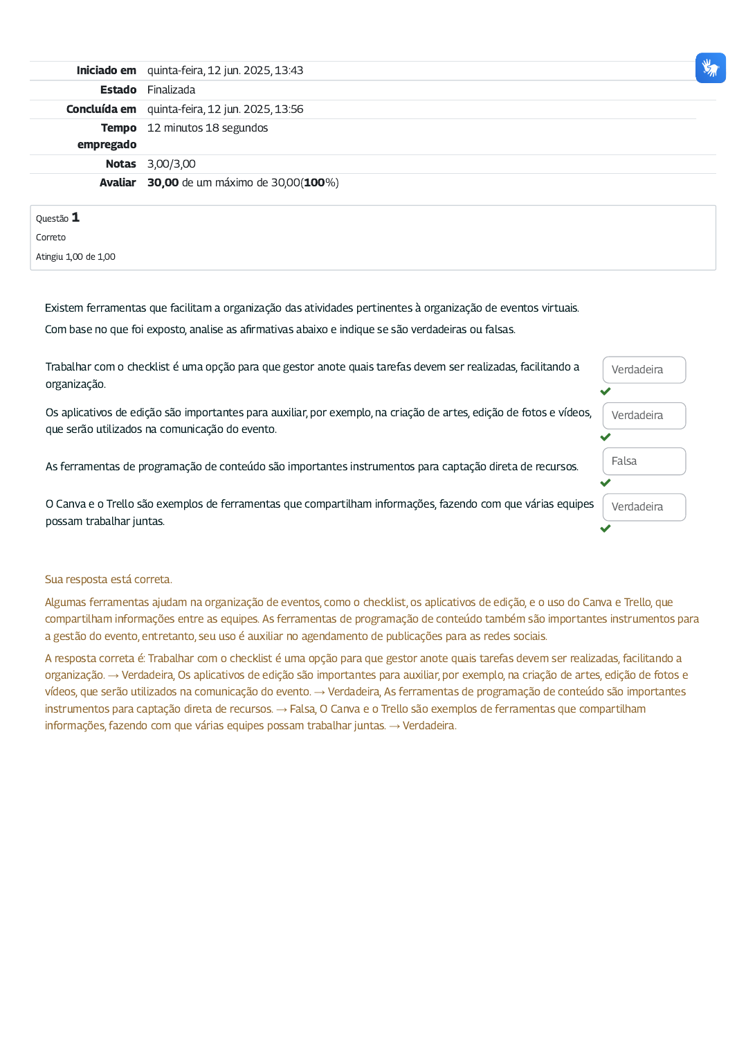 Iniciado em quinta-feira, 12 jun. 2025, 13:43 Estado Finalizada Concluída em quinta-feira, 12 jun. 2025, 13:56 Tempo empregado 12 minutos 18 segundos Notas 3,00/3,00 Avaliar 30,00 de um máximo de 30,00(100%) Questão 1 Correto Atingiu 1,00 de 1,00 Existem ferramentas que facilitam a organização das atividades pertinentes à organização de eventos virtuais. Com base no que foi exposto, analise as afirmativas abaixo e indique se são verdadeiras ou falsas. Trabalhar com o checklist é uma opção para que gestor anote quais tarefas devem ser realizadas, facilitando a organização. Os aplicativos de edição são importantes para auxiliar, por exemplo, na criação de artes, edição de fotos e vídeos, que serão utilizados na comunicação do evento. As ferramentas de programação de conteúdo são importantes instrumentos para captação direta de recursos. O Canva e o Trello são exemplos de ferramentas que compartilham informações, fazendo com que várias equipes possam trabalhar juntas. Verdadeira Verdadeira Falsa Verdadeira Sua resposta está correta. Algumas ferramentas ajudam na organização de eventos, como o checklist, os aplicativos de edição, e o uso do Canva e Trello, que compartilham informações entre as equipes. As ferramentas de programação de conteúdo também são importantes instrumentos para a gestão do evento, entretanto, seu uso é auxiliar no agendamento de publicações para as redes sociais. A resposta correta é: Trabalhar com o checklist é uma opção para que gestor anote quais tarefas devem ser realizadas, facilitando a organização. → Verdadeira, Os aplicativos de edição são importantes para auxiliar, por exemplo, na criação de artes, edição de fotos e vídeos, que serão utilizados na comunicação do evento. → Verdadeira, As ferramentas de programação de conteúdo são importantes instrumentos para captação direta de recursos. → Falsa, O Canva e o Trello são exemplos de ferramentas que compartilham informações, fazendo com que várias equipes possam trabalhar juntas. → Verdadeira. Questão 2 Correto Atingiu 1,00 de 1,00 Questão 3 Correto Atingiu 1,00 de 1,00 As plataformas de transmissão, como o Zoom e o StreamYard, são importantes ferramentas para a realização de eventos virtuais. Alguns usos dessas plataformas são: controle de entrada de participantes, habilitação ou não comentários, possibilidade de os participantes ligarem a câmera e o som, direcionamento dos participantes para uma sala de espera. Julgue como verdadeiro (V) ou falso (F) o enunciado exposto. Escolha uma opção: Verdadeiro Falso A frase exposta está correta. De fato, as plataformas de transmissão, como o Zoom e o StreamYard, são importantes ferramentas para a realização de eventos virtuais. Alguns usos dessas plataformas são: controle de entrada de participantes, habilitação ou não comentários, possibilidade de os participantes ligarem a câmera e o som, direcionamento dos participantes para uma sala de espera. Para isso, é muito importante que as configurações das plataformas sejam estudadas, a fim de que se aproveite o melhor que elas oferecem. A resposta correta é 'Verdadeiro'. Imagine que está sendo organizado um evento virtual de roda de conversa de uma empresa do ramo alimentício. A empresa já tem um público bastante participativo em sua rede social no Instragram, tem uma constância de produção de conteúdos informativos ao público-alvo e recebe um retorno positivo. Marcos, o idealizador do evento, soube que há outras redes sociais que possibilitam a transmissão online, como o Youtube, que ouviu ser uma das maiores redes sociais para quem quer construir uma autoridade. Diante do cenário descrito, Marcos deve mudar a plataforma que já estava definida para realizar o evento? Escolha uma opção: a. Sim, Marcos deve mudar a plataforma para o Youtube. b. Não, Marcos deve manter a realização do evento no Instagram. Sua resposta está correta. Apesar de ser possível a transmissão em várias redes socais, o mais importante é verificar onde o público-alvo está. Não adianta, em vista do exemplo citado, fazer uma transmissão pelo Youtube, já que o público e clientes da empresa estão no Instagram. A resposta correta é: Não, Marcos deve manter a realização do evento no Instagram.