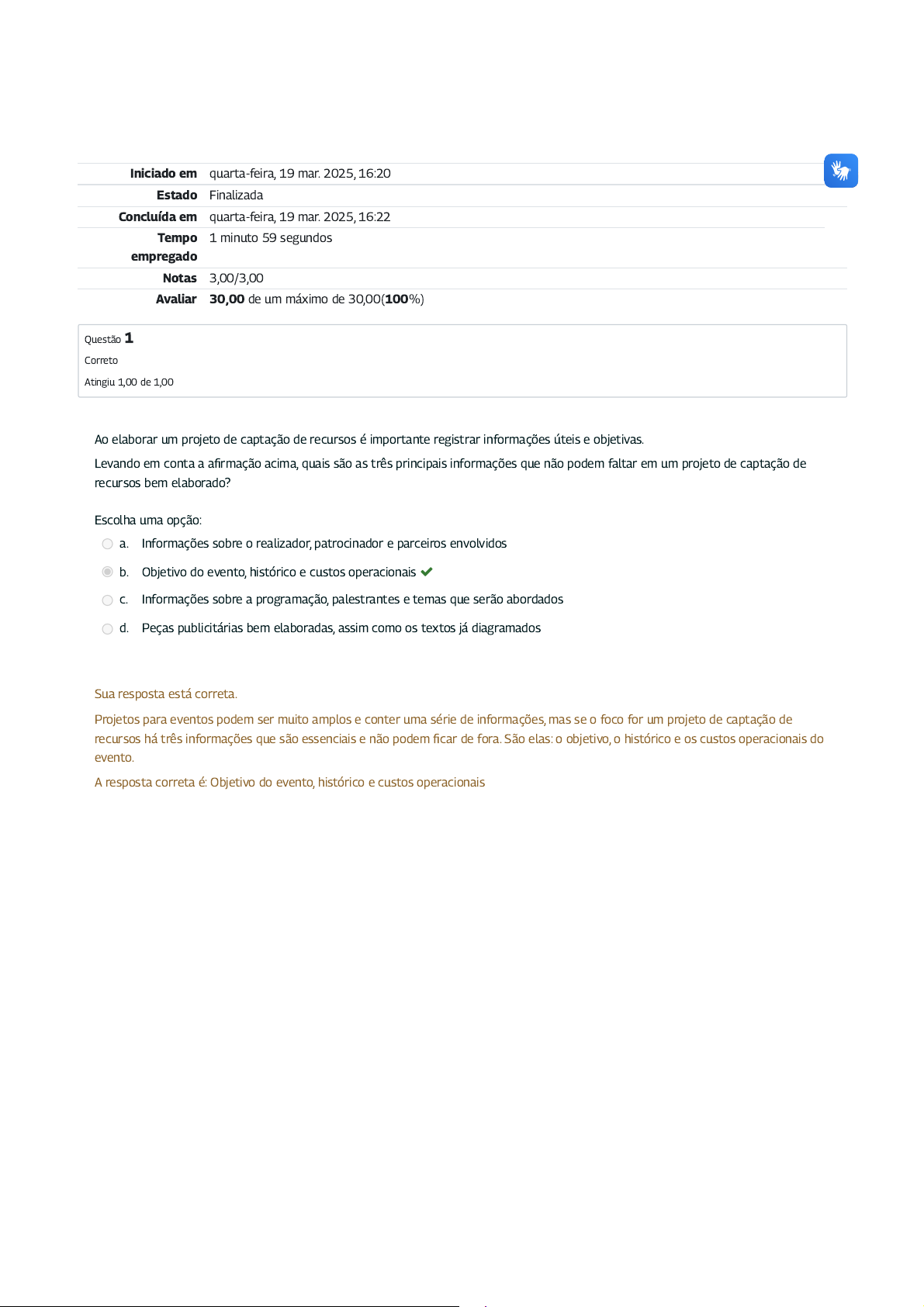 Iniciado em quarta-feira, 19 mar. 2025, 16:20 Estado Finalizada Concluída em quarta-feira, 19 mar. 2025, 16:22 Tempo empregado 1 minuto 59 segundos Notas 3,00/3,00 Avaliar 30,00 de um máximo de 30,00(100%) Questão 1 Correto Atingiu 1,00 de 1,00 Ao elaborar um projeto de captação de recursos é importante registrar informações úteis e objetivas. Levando em conta a afirmação acima, quais são as três principais informações que não podem faltar em um projeto de captação de recursos bem elaborado? Escolha uma opção: a. Informações sobre o realizador, patrocinador e parceiros envolvidos b. Objetivo do evento, histórico e custos operacionais c. Informações sobre a programação, palestrantes e temas que serão abordados d. Peças publicitárias bem elaboradas, assim como os textos já diagramados Sua resposta está correta. Projetos para eventos podem ser muito amplos e conter uma série de informações, mas se o foco for um projeto de captação de recursos há três informações que são essenciais e não podem ficar de fora. São elas: o objetivo, o histórico e os custos operacionais do evento. A resposta correta é: Objetivo do evento, histórico e custos operacionais Questão 2 Correto Atingiu 1,00 de 1,00 Imagine que você é gestor de um grande evento que está prestes a iniciar, faltam apenas 5 (cinco) dias para a realização. Você está acertando com os palestrantes os ajustes finais da organização, quando lembra que precisa escrever uma publicação para divulgar em suas redes sociais sobre o evento, pois já não há publicação há mais de 10 (dez) dias. Pensando nessa situação, qual parte do processo de gestão de eventos não foi feita corretamente e prejudicou sua organização? Escolha uma opção: a. Captação de recursos e apoiadores b. Contratação de equipe de recursos humanos c. Carta de Vendas d. Calendário Editorial e. Definição do objetivo do evento Sua resposta está correta. Uma parte importante na gestão de comunicação é a elaboração de um Calendário Editorial bem planejado e organizado. Com ele, o gestor de eventos possui todas as publicações organizadas para serem divulgadas em suas redes sociais. A resposta correta é: Calendário Editorial Questão 3 Correto Atingiu 1,00 de 1,00 Ao organizar um evento, você, como gestor, traçou um objetivo para ser alcançado. Para que isso ocorra, é necessário que haja uma boa gestão de comunicação a fim de que o seu público conheça o seu evento e se interesse por ele. Sobre o Plano de Comunicação de Eventos, analise as afirmativas abaixo e marque Verdadeiro ou Falso. O Word e o Trello são ferramentas que podem ser utilizadas para organizar as ideias de publicações. As planilhas de Excel servem exclusivamente para elaborar o projeto de captação de recursos, não servindo para a Gestão de Comunicação. Os programadores de publicações, como o estúdio de criação do Facebook, são ferramentas para agendar a postagem das publicações automaticamente nas redes sociais utilizadas, ajudando a otimizar o tempo. Disponibilizar e-books gratuitos sobre temas relacionados ao evento é uma forma eficaz de atrair o público-alvo. É recomendado divulgar o evento bem próximo à data; assim, o público se surpreende e faz a aquisição do ingresso/produto instantaneamente. Verdadeiro Falso Verdadeiro Verdadeiro Falso Sua resposta está correta. Na gestão de comunicação, o Word e o Trello são ferramentas que ajudam na organização de ideias de publicações. A planilha do Excel pode ser uma ótima ferramenta para a organização das publicações sobre o evento. Nela, o gestor pode organizar as informações “o quê”, “quando”, “responsável” etc. Os programadores de publicações são ótimas ferramentas para otimizar o tempo, já que é possível agendar a postagem automática das publicações. A disponibilização de e-book e materiais gratuitos ajuda na atração do público-alvo do evento. Sobre a divulgação o evento, recomenda-se que haja um bom planejamento anterior ao evento, criando estratégias de marketing, a fim de aquecer o público-alvo e despertar o seu interesse. A resposta correta é: O Word e o Trello são ferramentas que podem ser utilizadas para organizar as ideias de publicações. → Verdadeiro, As planilhas de Excel servem exclusivamente para elaborar o projeto de captação de recursos, não servindo para a Gestão de Comunicação. → Falso, Os programadores de publicações, como o estúdio de criação do Facebook, são ferramentas para agendar a postagem das publicações automaticamente nas redes sociais utilizadas, ajudando a otimizar o tempo. → Verdadeiro, Disponibilizar e- books gratuitos sobre temas relacionados ao evento é uma forma eficaz de atrair o público-alvo. → Verdadeiro, É recomendado divulgar o evento bem próximo à data; assim, o público se surpreende e faz a aquisição do ingresso/produto instantaneamente. → Falso.