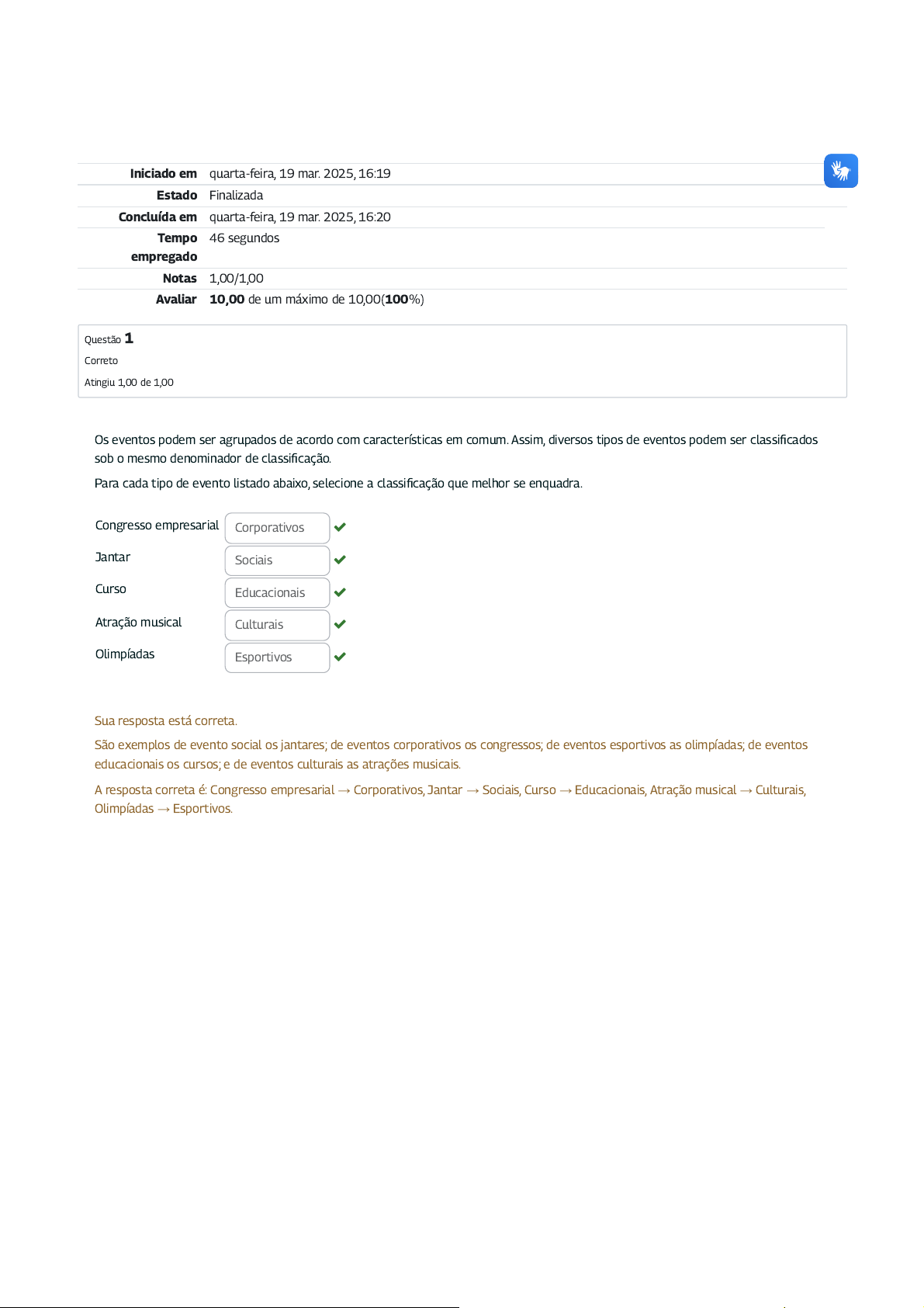 Iniciado em quarta-feira, 19 mar. 2025, 16:19 Estado Finalizada Concluída em quarta-feira, 19 mar. 2025, 16:20 Tempo empregado 46 segundos Notas 1,00/1,00 Avaliar 10,00 de um máximo de 10,00(100%) Questão 1 Correto Atingiu 1,00 de 1,00 Os eventos podem ser agrupados de acordo com características em comum. Assim, diversos tipos de eventos podem ser classificados sob o mesmo denominador de classificação. Para cada tipo de evento listado abaixo, selecione a classificação que melhor se enquadra. Congresso empresarial Jantar Curso Atração musical Olimpíadas Corporativos Sociais Educacionais Culturais Esportivos Sua resposta está correta. São exemplos de evento social os jantares; de eventos corporativos os congressos; de eventos esportivos as olimpíadas; de eventos educacionais os cursos; e de eventos culturais as atrações musicais. A resposta correta é: Congresso empresarial → Corporativos, Jantar → Sociais, Curso → Educacionais, Atração musical → Culturais, Olimpíadas → Esportivos.