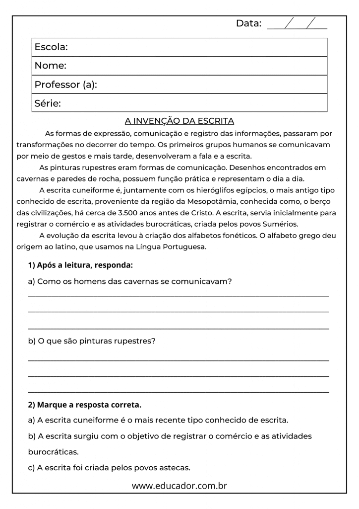 Data: Escola: Nome: Professor (a): Série: A INVENÇÃO DA ESCRITA As formas de expressão, comunicação e registro das informações, passaram por transformações no decorrer do tempo. Os primeiros grupos humanos se comunicavam por meio de gestos e mais tarde, desenvolveram a fala e a escrita. As pinturas rupestres eram formas de comunicação. Desenhos encontrados em cavernas e paredes de rocha, possuem função prática e representam O dia a dia. A escrita cuneiforme é, juntamente com hieróglifos egípcios, O mais antigo tipo conhecido de escrita, proveniente da região da Mesopotâmia, conhecida como, O berço das civilizações, há cerca de 3.500 anos antes de Cristo. A escrita, servia inicialmente para registrar O comércio e as atividades burocráticas, criada pelos povos Sumérios. A evolução da escrita levou à criação dos alfabetos fonéticos. O alfabeto grego deu origem ao latino, que usamos na Língua Portuguesa. 1) Após a leitura, responda: a) Como OS homens das cavernas se comunicavam? b) que são pinturas rupestres? 2) Marque a resposta correta. a) A escrita cuneiforme é O mais recente tipo conhecido de escrita. b) A escrita surgiu com O objetivo de registrar O comércio e as atividades burocráticas. c) A escrita foi criada pelos povos astecas. www.educador.com.br