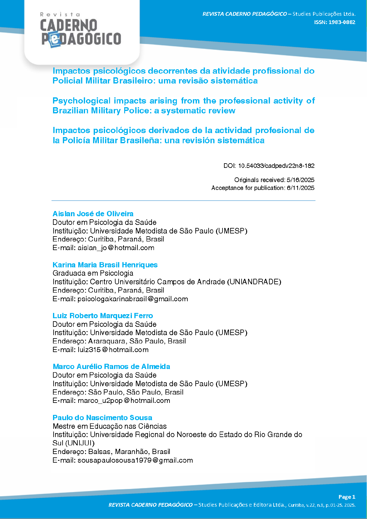 Revista REVISTA CADERNO PEDAGÓGICO Studies Publicações Ltda. CADERNO ISSN: 1983-0882 AGOGICO Impactos psicológicos decorrentes da atividade profissional do Policial Militar Brasileiro: uma revisão sistemática Psychological impacts arising from the professional activity of Brazilian Military Police: a systematic review Impactos psicológicos derivados de la actividad profesional de la Policía Militar Brasileña: una revisión sistemática DOI: 10.54033/cadpedv22n8-182 Originals received: 5/16/2025 Acceptance for publication: 6/11/2025 Aislan José de Oliveira Doutor em Psicologia da Saúde Instituição: Universidade Metodista de São Paulo (UMESP) Endereço: Curitiba, Paraná, Brasil E-mail: aislan_jo@hotmail.com Karina Maria Brasil Henriques Graduada em Psicologia Instituição: Centro Universitário Campos de Andrade (UNIANDRADE) Endereço: Curitiba, Paraná, Brasil E-mail: psicologakarinabrasil@gmail.com Luiz Roberto Marquezi Ferro Doutor em Psicologia da Saúde Instituição: Universidade Metodista de São Paulo (UMESP) Endereço: Araraquara, São Paulo, Brasil E-mail: luiz315@hotmail.com Marco Aurélio Ramos de Almeida Doutor em Psicologia da Saúde Instituição: Universidade Metodista de São Paulo (UMESP) Endereço: São Paulo, São Paulo, Brasil E-mail: marco_u2pop@hotmail.com Paulo do Nascimento Sousa Mestre em Educação nas Ciências Instituição: Universidade Regional do Noroeste do Estado do Rio Grande do Sul (UNIJUI) Endereço: Balsas, Maranhão, Brasil E-mail: Page 1 REVISTA CADERNO PEDAGÓGICO Studies Publicações e Editora Ltda., Curitiba, v.22, n.8, p. 01-25. 2025.Revista REVISTA CADERNO PEDAGÓGICO Studies Publicações Ltda. CADERNO ISSN: 1983-0882 AGOGICO Caroline Velasquez Marafiga Doutora em Psicologia Clínica Instituição: Universidade do Vale do Rio dos Sinos (UNISINOS) Endereço: Curitiba, Paraná, Brasil E-mail: carolvmarafiga@hotmail.com RESUMO Introdução: O trabalho do policial militar O expõe cotidianamente a situações de riscos pessoais e coletivos podendo vir a causar agravos a sua saúde psicoló- gica. Objetivo: Este estudo teve como objetivo investigar através da literatura OS impactos psicológicos causados pela atividade profissional dos policiais militares brasileiros. Método: Trata-se de uma revisão de literatura sistemática de natu- reza qualitativa e descritiva. A busca foi realizada nas seguintes bases de dados Scielo, PePsic, BVS (março de 2020 a maio de 2020) a seleção dos artigos rea- lizou-se por meio da leitura de títulos e resumos adotando como critérios de in- clusão estudos produzidos no Brasil, estritos na língua portuguesa, produzidos nos últimos 15 anos e que contemplassem a saúde mental do policial militar bra- sileiro a nível pessoal e profissional. Foram excluídos OS estudos incompletos, estudos realizados em cadetes, revisões de literatura, livros, análises documen- tais, relatórios, dissertações e teses. Resultado: Foram identificados 621 artigos com a aplicação dos critérios de inclusão e exclusão foram selecionados 12 que contemplavam objetivo principal do estudo. Conclusão: A partir da análise dos artigos selecionados evidenciou-se a presença de agravos psicológicos nos po- liciais militares brasileiros tendo como destaque estresse e a síndrome de Bur- nout. Também esteve presente nos estudos agravos como sofrimento psíquico, abuso de substâncias psicoativas, depressão e suicídio. Palavras-chave: Polícia. Policial Militar. Psicologia. Saúde Mental. Transtornos Mentais. ABSTRACT Introduction: The work of military police officers exposes them daily to situations of personal and collective risk, which can cause damage to their psychological health. Objective: This study aimed to investigate, through literature, the psycho- logical impacts caused by the professional activity of Brazilian military police of- ficers. Method: This is a systematic review of qualitative and descriptive literature. The search was carried out in the Scielo, PePsic, VHL databases (March 2020 to May 2020). The selection of articles was carried out by reading titles and ab- stracts, adopting as inclusion criteria studies produced in Brazil, strictly in the Portuguese language, produced over the last 15 years and which addressed the mental health of Brazilian military police officers at a personal and professional level. Incomplete studies, studies carried out with cadets, literature reviews, books, documentary analyses, reports, dissertations and theses were excluded. Result: 621 articles were identified through the application of the inclusion and exclusion criteria, 12 were selected that covered the main objective of the study. Conclusion: From the analysis of the selected articles, the presence of psycho- logical problems in Brazilian military police officers was evident, with emphasis Page 2 REVISTA CADERNO PEDAGÓGICO Studies Publicações e Editora Ltda., Curitiba, v.22, n.8, p. 01-25. 2025.Revista REVISTA CADERNO PEDAGÓGICO Studies Publicações Ltda. CADERNO ISSN: 1983-0882 AGOGICO on stress and Burnout syndrome. Conditions such as psychological distress, abuse of psychoactive substances, depression and suicide were also present in the studies. Keywords: Police. Military Police. Psychology. Mental Health. Mental Disorder. RESUMEN Introducción: El trabajo de los policías militares los expone diariamente a situa- ciones de riesgo personal y colectivo, que pueden causar daños a su salud psi- cológica. Objetivo: Este estudio tuvo como objetivo investigar, a través de la lite- ratura, los impactos psicológicos causados por la actividad profesional de los policías militares brasileños. Método: Se trata de una revisión sistemática de li- teratura cualitativa y descriptiva. La búsqueda se realizó en las bases de datos Scielo, PePsic, BVS (marzo de 2020 a mayo de 2020). La selección de los ar- tículos se realizó mediante lectura de títulos y resúmenes, adoptando como cri- terio de inclus