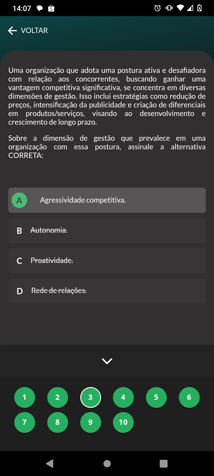 14:07 S VOLTAR Uma organização que adota uma postura ativa e desafiadora com relação aos concorrentes, buscando ganhar uma vantagem competitiva significativa, se concentra em diversas dimensões de gestão. Isso inclui estratégias como redução de preços, intensificação da publicidade e criação de diferenciais em produtos/serviços, visando ao desenvolvimento e crescimento de longo prazo. Sobre a dimensão de gestão que prevalece em uma organização com essa postura, assinale a alternativa CORRETA: A Agressividade competitiva. Autonomia. c Proatividade. D Rede de relações. 1 2 3 4 5 6 7 8 9 10