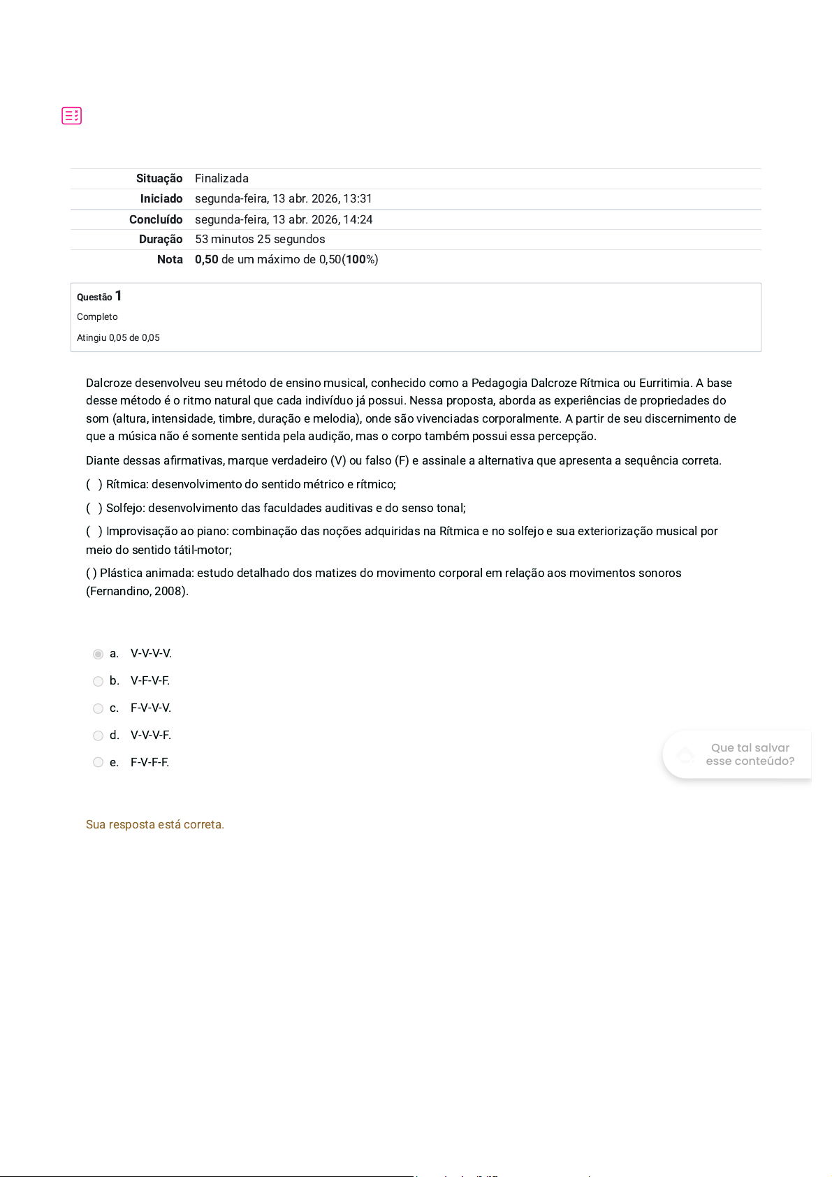 Situação Finalizada Iniciado segunda-feira, 13 abr. 2026, 13:31 Concluído segunda-feira, 13 abr. 2026, 14:24 Duração 53 minutos 25 segundos Nota 0,50 de um máximo de 0,50(100%) Questão 1 Completo Atingiu 0,05 de 0,05 Dalcroze desenvolveu seu método de ensino musical, conhecido como a Pedagogia Dalcroze Rítmica ou Eurritimia. A base desse método é o ritmo natural que cada indivíduo já possui. Nessa proposta, aborda as experiências de propriedades do som (altura, intensidade, timbre, duração e melodia), onde são vivenciadas corporalmente. A partir de seu discernimento de que a música não é somente sentida pela audição, mas o corpo também possui essa percepção. Diante dessas afirmativas, marque verdadeiro (V) ou falso (F) e assinale a alternativa que apresenta a sequência correta. ( ) Rítmica: desenvolvimento do sentido métrico e rítmico; ( ) Solfejo: desenvolvimento das faculdades auditivas e do senso tonal; ( ) Improvisação ao piano: combinação das noções adquiridas na Rítmica e no solfejo e sua exteriorização musical por meio do sentido tátil-motor; ( ) Plástica animada: estudo detalhado dos matizes do movimento corporal em relação aos movimentos sonoros (Fernandino, 2008). a. V-V-V-V. b. V-F-V-F. c. F-V-V-V. d. V-V-V-F. e. F-V-F-F. Sua resposta está correta. Que tal salvar esse conteúdo? Questão 2 Completo Atingiu 0,05 de 0,05 Questão 3 Completo Atingiu 0,05 de 0,05 A música no Brasil, “passa por três fases da história da música: a música religiosa dos jesuítas, os lundus, as óperas, as modinhas e a própria música nacionalista”. Recebendo influências europeias, africanas e indígenas. Em 1549, principalmente na cidade do Rio de Janeiro, com a chegada da corte portuguesa ao Brasil, houve um crescimento e modernização no ensino da música e surgiram instituições aptas para o ensino da mesma. Nesse sentido, analise as afirmativas, marque verdadeiro (V) ou falso (F) e assinale a alternativa que apresenta a sequência correta. ( ) Durante o período da Escola Nova no século XX, a música foi considerada um fator importante para o desenvolvimento da sociedade. ( ) O Canto Orfeônico foi liderado por Villa Lobos em 1930. ( ) Com o surgimento do Canto Orfeônico, esperava-se por uma valorização da cultura brasileira. ( ) A LDB de 1961 substitui a Educação Musical pelo Canto Orfeônico. ( ) No ano de 2008, a lei n. 11.769 torna a música conteúdo curricular obrigatório nas escolas de educação básica em todo o Brasil. a. F-V-V-V-F. b. V-F-V-F-V. c. F-V-V-F-V. d. V-V-V-F-V. e. F-V-F-F-V. Sua resposta está correta. O método Orff também conhecido como método Orff-Schulwerktem tem como objetivo principal, a integração da música a todos de uma maneira completa e não por partes; através da ludicidade, as crianças aprendem partindo do seu convívio sonoro, são gradualmente inseridas estruturas mais complexas. A audição, o tato e o ritmo natural são o ponto de partida do ensino da educação musical. Diante dessa afirmação é correto afirmar que Orff englobava em sua metodologia: Assinale a alternativa correta. a. O movimento, a dança, o canto e instrumentos de cordas. b. O movimento, a dança, o canto e o teatro. c. A música, a dança, o teatro e as artes visuais. d. O movimento, a dança, o canto e instrumentos de percussão. e. O teatro, a dança, o canto e os musicais. Sua resposta está correta. Que tal salvar esse conteúdo? Questão 4 Completo Atingiu 0,05 de 0,05 A música, em sua essência, é uma forma de arte que atravessa culturas e gerações, comunicando emoções, histórias e tradições de maneiras que palavras sozinhas muitas vezes não conseguem. Para criar esses efeitos poderosos, a música combina vários elementos fundamentais, cada um contribuindo com uma faceta única para a experiência auditiva global. Analise as alternativas abaixo: I. A melodia é o tema principal da música. II. A harmonia enriquece a parte melódica. III. Ritmo que dá o pulso da música, é o que define a música de muitas culturas. IV. A música é uma linguagem artística cultural universal, que sem palavras, tem o potencial de conectar a humanidade através de suas diversas formas e expressões. Assinale a alternativa correta sobre os elementos da música. a. Apenas II e III estão corretas. b. Apenas II, III e IV estão corretas. c. Apenas I está correta. d. I, II, III e IV estão corretas. e. Apenas I e II estão corretas. Sua resposta está correta. Que tal salvar esse conteúdo? Questão 5 Completo Atingiu 0,05 de 0,05 Questão 6 Completo Atingiu 0,05 de 0,05 Para o desenvolvimento de um processo criativo, coletivo e improvisado, com uma partitura não convencional, é necessário que os alunos explorem todo tipo de fonte sonora, sejam eles produzidos naturalmente ou artificialmente. É importante também trabalhar o silêncio como um elemento expressivo. Com base nesta informação, analise as asserções abaixo: I. Para conseguir inventar uma grafia representativa de determinado som, por exemplo, a criança não necessita perceber todas as nuances (timbre, intensidade, altura, etc.), o que exige um grau baixo de concentração. PORQUE II. O mundo dos sons é complexo e sua vivência é maravilhosa! Porém, para um bom treinamento auditivo é necessário ouvi-lo junto aos barulhos e ruídos. a. As asserções I e II são proposições verdadeiras, mas a II não é uma justificativa correta da I. b. A asserção I é uma proposição falsa e II é uma proposição verdadeira. c. A asserção I é uma proposição verdadeira e a II é uma proposição falsa. d. As asserções I e II são proposições falsas. e. As asserções I e II são proposições verdadeiras e a II é uma justificativa correta da I. Sua resposta está correta. A música é uma forma de expressão presente em todos os históricos da humanidade. Nas civilizações antigas sabe-se por estudos arqueológicos que houve a manifestação da mú