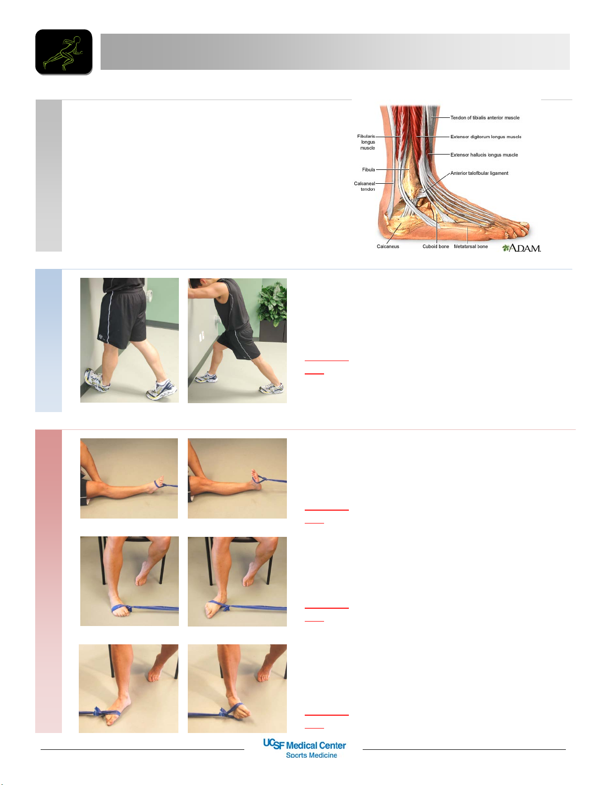 Ankle Strengthening PROTOCOLS ` B A C K G R O U N D STR ETC H IN G EX ER C ISES: • Purpose o Improve muscular strength o Regain balance and proprioception o Increase functional abilities o Rehab exercises should be performed for 6- 8 weeks. • Related activities: o As symptoms improve, slowly return to physical activities such as bicycle, stair climber and elliptical o Skipping rope is a good activity to try prior to returning to jogging. AAnnkkllee EEvveerrssiioonn Sit in a chair with the theraband attached to a stable object Keeping the knee and thigh still, rotate foot out away from the body Frequency: 3 sets x 15 reps. 1-2 times a day. Goal: Increase ankle strength CCaallff SSttrreettcchh Stretch 1: Stand with the ball of the foot against the wall Slowly move body towards the wall until stretch is felt Stretch 2: Stand facing a wall and step back with one leg. Push heel towards the ground. Frequency: 3 sets x 1 min. 2-3 times a day. Goal: Increase range of motion A N K LE STR EN G TH EX ER C ISES: AAnnkkllee DDoorrssiifflleexxiioonn Begin by attaching the theraband to a stable object Sitting on the ground with the theraband around your foot Slowly pull your toes up towards you Frequency: 3 sets x 15 reps. 1-2 times a day. Goal: Increase ankle strength AAnnkkllee IInnvveerrssiioonn Sit in a chair with the theraband attached to a stable object Keeping the knee and thigh still, rotate foot in towards the body Frequency: 3 sets x 15 reps. 1-2 times a day. Goal: Increase ankle strength UCSF Orthopaedic Institute | 1500 Owens Street Ste 170 | San Francisco, CA 94158 | Phone: 415-353-2808 | Fax: 415-353-7593 | orthosurg.ucsf.edu Ankle Strengthening PROTOCOLS A N K LE STR EN G TH CCaallff rraaiisseess Stand with the balls of your feet on a step Slowly rise up onto your toes and hold for 3 sec. Slowly lower down and repeat Try to maintain your balance and work towards performing single leg calf raises Frequency: 3 sets of 15 reps. 1-2 times per day Goal: Increase ankle strength and balance SSiinnggllee lleegg bbaallaanncciinngg Stand on a flat surface on one leg Balance for 30-60 secs. And repeat Progress to standing on a pillow/couch cushion or perform with eyes closed. Frequency: 2-3 sets of 30-60sec. 1-2 times per day Goal: Improve balance SSiinnggllee lleegg ssqquuaattss Stand on a flat surface or cushion Slowly perform a half squat to 45 degrees and hold 3 sec. Return to starting position. Frequency: 2-3 sets of 15 reps. 1-2 times per day Goal: Improve balance and ankle strength SSiinnggllee lleegg hhaallff cciirrccllee ttaappss Place 6 dots in a half circle 30 inches from the center Standing on one leg, slowly touch each dot with the other foot Can be performed on a cushion/pillow to increase difficulty Frequency: 3 sets of 30-60 sec. 1-2 times per day Goal: Increase forearm strength B A LA N C E A N D PR O PR IO C EPTIO N EX ER C ISEs: SSiinnggllee lleegg fflloooorr ttoouucchheess ““OOiill DDeerrrriicckk”” Stand on one leg with knee slightly bent Keeping torso straight, slowly reach towards the ground Bend the knee while reaching forward. Slowly return to starting position Frequency: 3 sets x 15 reps. 1-2 times a day. Goal: Improve balance UCSF Orthopaedic Institute | 1500 Owens Street Ste 170 | San Francisco, CA 94158 | Phone: 415-353-2808 | Fax: 415-353-7593 | orthosurg.ucsf.edu