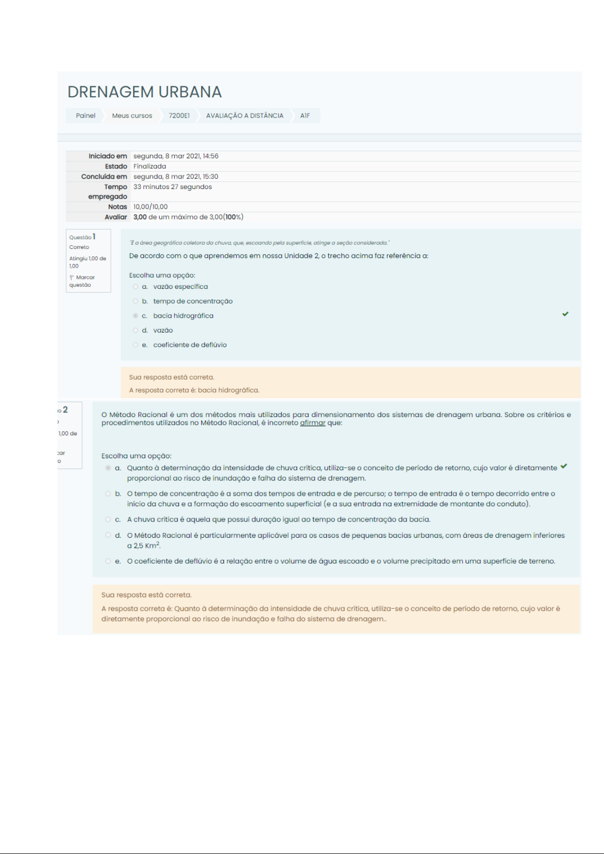 DRENAGEM URBANA Painel Meus cursos 7200E1 AVALIAÇÃO A DISTÂNCIA Iniciado em segunda, 8 mar 2021, 14:56 Estado Finalizada Concluída em segunda, 8 mar 2021, 15:30 Tempo 33 minutos 27 segundos empregado Notas 10,00/10,00 Avaliar 3,00 de um máximo de 3,00(100%) Questão 1 "É a área geográfica coletora da chuva, que, escoando pela superficie, atinge a seção considerada." Correto Atingiu 1,00 de De acordo com que aprendemos em nossa Unidade 2, trecho acima faz referência a: 1,00 P Marcar Escolha uma opção: questão a. vazão específica b. tempo de concentração C. bacia hidrográfica d. vazão e. coeficiente de deflúvio Sua resposta está correta. A resposta correta é: bacia hidrográfica. 2 Método Racional é um dos métodos mais utilizados para dimensionamento dos sistemas de drenagem urbana. Sobre critérios e procedimentos utilizados no Método Racional, é incorreto afirmar que: 1,00 de car Escolha uma opção: a. Quanto à determinação da intensidade de chuva crítica, utiliza-se conceito de período de retorno, cujo valor é diretamente proporcional ao risco de inundação e falha do sistema de drenagem. b. tempo de concentração é a soma dos tempos de entrada e de percurso; tempo de entrada é tempo decorrido entre início da chuva e a formação do escoamento superficial (e a sua entrada na extremidade de montante do conduto). C. A chuva crítica é aquela que possui duração igual ao tempo de concentração da bacia. d. Método Racional é particularmente aplicável para os casos de pequenas bacias urbanas, com áreas de drenagem inferiores a 2,5 e. coeficiente de deflúvio é a relação entre volume de água escoado e volume precipitado em uma de terreno. Sua resposta está correta. A resposta correta é: Quanto à determinação da intensidade de chuva crítica, utiliza-se conceito de período de retorno, cujo valor é diretamente proporcional risco de inundação e falha do sistema de drenagem.3 Quando observamos elementos característicos do ciclo hidrológico e do balanço hídrico de uma determinada região, podemos observar drásticas alteração entre áreas pré e pós-urbanizadas. Pensando nisso analise as afirmativas a seguir: 1,00 de redução do superficial em áreas urbanizadas. car maior infiltração em áreas pré-urbanizadas. maior evapotranspiração em áreas pré-urbanizadas. menor escoamento subterrâneo em áreas urbanizadas. Assinale a alternativa que apresenta a sequência correta. Escolha uma opção: a. F,V,F,V. b. F,F,V,V. C. V,F,F,V. d. V,F,V,F. e. F,V,V,F. Sua resposta está correta. A resposta correta tão 4 Uma ensecadeira deverá ser construída para proteger as atividades de construção de uma barragem durante 5 anos de obra. Se a to ensecadeira é projetada para resistir uma cheia de 20 anos, qual risco que a estrutura venha a ser sobrepassada no primeiro ano? iu 1,00 de Escolha uma opção: arcar a. 15% tão b. C. 7,5% d. 10,0% e. 6,75% Sua resposta está correta. A resposta correta é: tão 5 "Quando rio transporta muito solo, devido a escavações (erosões), as barragens construídas podem diminuir seu volume de to armazenamento, devido ao depósito destes solos no seu reservatório." iu 1,00 de trecho acima se refere ao processo de: arcar tão Escolha uma opção: a. Assoreamento. b. Erosão. C. Entupimento de calha fluvial. d. Intemperismo. e. Redução de talvegue. Sua resposta está correta. A resposta correta é:tão 6 Qual período de retorno a considerar no projeto da hidrelétrica com vida útil de 50 anos, se admite um risco de 10%? eto 1,00 de Escolha uma opção: a. Tr = 325 anos. arcar tão b. Tr = 157 anos. C. Tr = 475 anos. d. Tr = 275 anos. e. Tr = 455 anos. Sua resposta está correta. A resposta correta é: Tr = 475 tão 7 Conforme estudamos em nossa primeira Unidade, as medidas de controle de inundações podem ser classificadas em: eto 1,00 de Escolha uma opção: arcar tão a. Definitivas e temporárias b. Naturais e antrópicas C. Estruturais e não-estruturais d. De grande porte e de pequeno porte. Sua resposta está correta. A resposta correta é: Estruturais e não-estruturais. 8 A água das chuvas atinge o leito do curso de água através de quatro caminhos distintos. Dentre eles assinale a afirmativa 1,00 de Escolha uma opção: or a. escoamento subtterâneo b. escoamento hipodérmico C. escoamento superficial d. precipitação direta sobre corpo d'água e. através da afluentes do rio principal Sua resposta está correta. A resposta correta é: através da afluentes do rio principal.tão 9 A medida que a cidade se urbaniza, em geral, ocorrem seguintes impactos, EXCETO to iu 1,00 de Escolha uma opção: tão a. A deterioração da qualidade da água, devido a lavagem das ruas, transporte de material sólido e as ligações clandestinas de esgoto cloacal e pluvial. b. Redução dos trechos canalizados e retilinizados das calhas fluviais e consequente redução na variação nos regimes de escoamento das mesmas. C. aumento da área imperabilizada dos solos acarretando um aumento exponencial do escoamento superficial, diminuição do processo de infiltração e maior carga de sedimentos carreados para as calhas fluviais. d. Aumento da produção de sedimentos devido a desproteção das e a produção de resíduos sólidos (lixo). e. Aumento das vazões máximas (em até 7 vezes, Leopold,1968) devido ao aumento da capacidade de escoamento através de condutos e canais e impermeabilização das superfícies. Sua resposta está correta. A resposta correta é: Redução dos trechos canalizados e retilinizados das calhas fluviais e consequente redução na variação nos regimes de escoamento das 10 Uma usina hidrelétrica tem 50 anos de vida útil. Qual risco de falha se seu vertedor é projetado para uma cheia de tempo de to recorrência igual a vida útil da obra? 1,00 de rcar Escolha uma opção: ão a. 65% b. 63% C. 25% d. 75% e. 33% Sua resposta está correta. A resposta correta é: