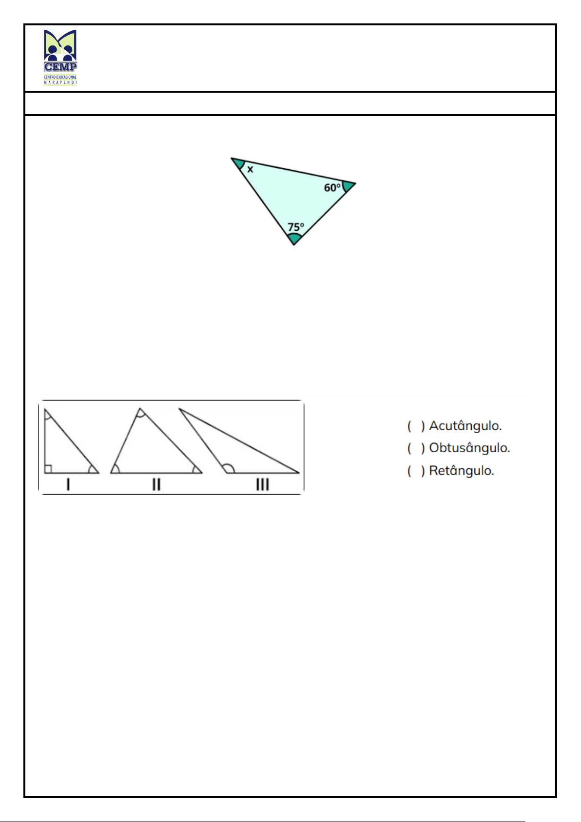 CEMP – Centro Educacional Marapendi Nome: _____________________________________________________________Data: / / 2025 Professor: 6º Ano do Ensino Fundamental Turma: _____ 1) Veja o triângulo abaixo. Qual a medida do ângulo x? a) 180º b) 75º c) 60º d) 45º 2) Observe os triângulos abaixo e relacione cada um com sua classificação correta quanto aos ângulos. 3) O que caracteriza um triângulo escaleno? a) Os três lados ter medidas iguais. b) Os três lados ter medidas diferentes. c) Dois lados ter medidas iguais e um diferente. d) Possuir um ângulo reto 4) Nas afirmativas abaixo, indique (V) para verdadeiro e (F) para falso. a) ( ) Triângulo Equilátero: Quando todos os lados são congruentes. b) ( ) Triângulo Isósceles: Quando todos os lados têm medidas diferentes. c) ( ) Triângulo Retângulo: Quando um dos ângulos é igual a 90°. d) ( ) Triângulo Acutângulo: Quando um dos ângulos é maior que 90°. e) ( ) Triângulo Isósceles: Quando dois dos lados são congruentes. Lista de exercícios – Geometria