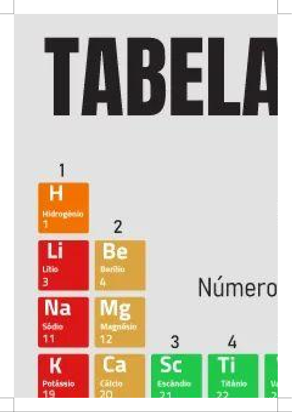 TABELA 1 H 1 2 Li Be 3 4 Número Na Mg Sódio 11 12 3 4 Ca Sc Ti Potássio 19 20 22PERIOD Símbolo H Hidrogênio r atômico T 1 5 6 7 8 9 Cr Mn Fe Co CromoICA 13 14 Nome 6 AI Si 10 11 12 13 Ni Cu Zn Ga Ge Cobre Zinco 303 1ANUAL Da 18 He 15 16 17 2 N F Ne 7. 8 9 10 P S CI Ar 15 16 17 18 As Se Br Kr CripténioRb Sr Y Zr 37 38 39 40 4 Cs Ba La-Lu Hf 55 56 57-71 72 7. Fr Ra Ac-Lr Rf 87 88 89-103 104 1 La 57 58 Ac To 89 90 Metais alcalinosNb Mo Tc Ru Rh Rédio 1 42 43 44 45 a W Re Os Ir 74 75 76 77 Sg Bh Hs Mt 05 106 107 108 109 Ce Pr Nd Pm Sm Samário 59 60 61 62 Pa U Np Pu 91 92 93 94 Metais pós-transiçãoPd Ag Cd In Sn Prata Estanh 46 47 48 49 50 Pt Au Hg TI Dure Chumb 78 79 80 81 82 Ds Rg Cn Nh FI 110 111 112 113 114 Eu Gd Dy Ho Európio Térbio Disprósio 63 64 65 66 67 Am Cm Bk Cf Es 95 96 97 98 99 Não metais diatômSb Te I Xe todo 51 02 53 54 Bi Po At Rn 83 84 85 86 Mc Lv Ts Og 115 116 117 118 Er Tm Yb Lu Túlio 68 69 70 71 Fm Md No Lr 100 101 102 EOL COS I antanídensMetais alcalinoterrosos Metais de transiçãoSemimetais Não metaisGases nobres :os Propriedades químActinídeos icas desconhecidas