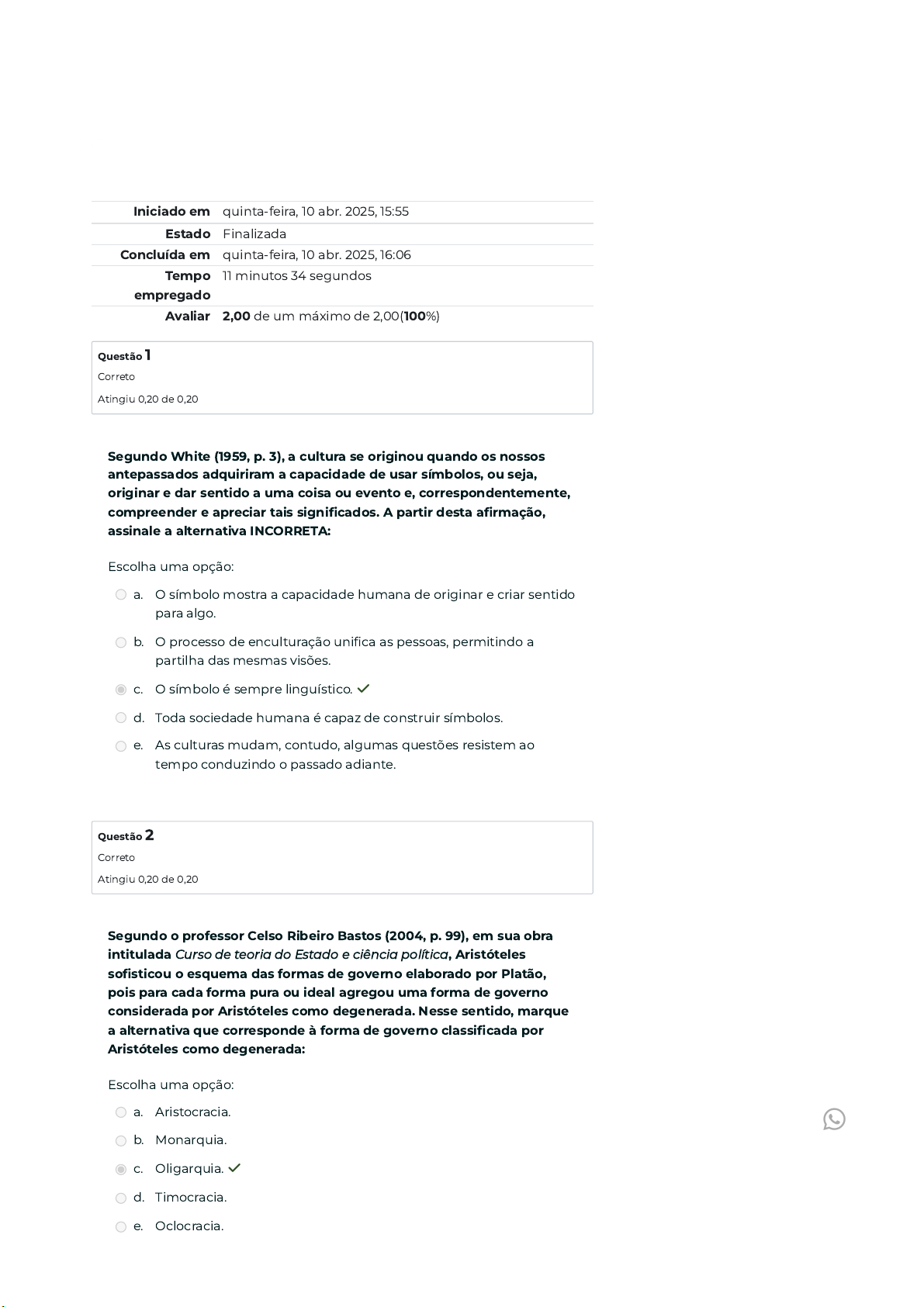 Iniciado em quinta-feira, 10 abr. 2025, 15:55 Estado Finalizada Concluída em quinta-feira, 10 abr. 2025, 16:06 Tempo empregado 11 minutos 34 segundos Avaliar 2,00 de um máximo de 2,00(100%) Questão 1 Correto Atingiu 0,20 de 0,20 Questão 2 Correto Atingiu 0,20 de 0,20 Segundo White (1959, p. 3), a cultura se originou quando os nossos antepassados adquiriram a capacidade de usar símbolos, ou seja, originar e dar sentido a uma coisa ou evento e, correspondentemente, compreender e apreciar tais significados. A partir desta afirmação, assinale a alternativa INCORRETA: Escolha uma opção: a. O símbolo mostra a capacidade humana de originar e criar sentido para algo. b. O processo de enculturação unifica as pessoas, permitindo a partilha das mesmas visões. c. O símbolo é sempre linguístico. ✓ d. Toda sociedade humana é capaz de construir símbolos. e. As culturas mudam, contudo, algumas questões resistem ao tempo conduzindo o passado adiante. Segundo o professor Celso Ribeiro Bastos (2004, p. 99), em sua obra intitulada Curso de teoria do Estado e ciência política, Aristóteles sofisticou o esquema das formas de governo elaborado por Platão, pois para cada forma pura ou ideal agregou uma forma de governo considerada por Aristóteles como degenerada. Nesse sentido, marque a alternativa que corresponde à forma de governo classificada por Aristóteles como degenerada: Escolha uma opção: a. Aristocracia. b. Monarquia. c. Oligarquia. ✓ d. Timocracia. e. Oclocracia. https://api.whatsapp.com/send?phone=554491540086&text=Ol%C3%A1,%20como%20podemos%20te%20ajudar%20hoje? Questão 3 Correto Atingiu 0,20 de 0,20 Questão 4 Correto Atingiu 0,20 de 0,20 Quanto ao objeto de estudo da Teoria Geral do Estado, assinale a alternativa que apresenta um dos seus campos de atuação. Escolha uma opção: a. A influência utilizada para a tomada decisão. b. A imposição de decisões pelos atores dotadas de autoridade. c. Os meios para a formulação de decisões políticas. d. As formas de Estado e os sistemas de governo. ✓ e. As instituições do governo. Michel Temer, teve seu nome envolvido em denúncia por crime de corrupção passiva, mas em razão da coalizão política, a Câmara rejeitou o pleito da denúncia livrando o atual presidente do julgamento e deposição do cargo. Cada sistema de governo prevê em sua constituição as principais atribuições destinadas ao chefe de governo ou ao chefe de Estado. Em respeito à Constituição Federal brasileira, considera-se como atribuição privativa do presidente brasileiro: Escolha uma opção: a. Nomear e exonerar os ministros da justiça. b. Enviar ao Congresso Nacional o plano mensal, o projeto de lei de diretrizes orçamentárias e as propostas de orçamento previstos na Constituição. c. Vetar projetos de lei somente parcialmente. d. Remeter mensagem e plano de governo ao Judiciário por ocasião da abertura da sessão legislativa, expondo a situação do país e solicitando as providências que julgar necessárias. e. Celebrar tratados, convenções e atos internacionais, sujeitos a referendo do Congresso Nacional. ✓ https://api.whatsapp.com/send?phone=554491540086&text=Ol%C3%A1,%20como%20podemos%20te%20ajudar%20hoje? Questão 5 Correto Atingiu 0,20 de 0,20 Questão 6 Correto Atingiu 0,20 de 0,20 A cultura é transmitida na sociedade. Ela não é um atributo de indivíduos em si, e sim dos indivíduos como membros de grupos. Sobre isso, de acordo com a obra Um espelho para a humanidade: uma introdução à Antropologia Cultural, de C. P. Kottak, que serve de texto- base para esta Unidade de Aprendizagem, marque a resposta INCORRETA: Escolha uma opção: a. A cultura, de alguma maneira, é integrada ao mesmo tempo, ou seja, quando algo muda, geralmente o sistema muda com ele. b. Aquilo que não é da ordem da ciência não é relevante para a cultura. ✓ c. A cultura é o principal mecanismo de adaptação do ser humano. d. A natureza humana é acrescida pela cultura, condicionando as próprias relações entre as pessoas. e. Cultura é um jeito de expressar e ordenar as nossas necessidades naturais, tais como a forma de comer. Apesar de não serem unívocos em suas perspectivas de problematização, os estudos culturais estão unidos por uma abordagem cuja ênfase recai sobre a importância de se analisar o conjunto da produção cultural de uma sociedade – seus diferentes textos e suas práticas – para entender os padrões de comportamento e a constelação de ideias compartilhadas por homens e mulheres que nela vivem. Sobre os estudos culturais, marque a alternativa INCORRETA. Escolha uma opção: a. Foi Heloísa Buarque de Hollanda quem usou a expressão "teoria viajante" para referir-se aos estudos culturais. b. Os estudos culturais sempre foram uma união de construções instáveis sem centralidade. c. Os estudos culturais pretendem ser uma disciplina acadêmica no sentido tradicional com ideias claramente postas. ✓ d. Para alguns autores, os estudos culturais se constituíram como um projeto político de oposição. e. Os estudos culturais não constituem um conjunto organizado de ideias. https://api.whatsapp.com/send?phone=554491540086&text=Ol%C3%A1,%20como%20podemos%20te%20ajudar%20hoje? Questão 7 Correto Atingiu 0,20 de 0,20 Questão 8 Correto Atingiu 0,20 de 0,20 São instrumentos de democracia semidireta adotados no direito brasileiro: Escolha uma opção: a. veto popular, revogação e plebiscito. b. referendo, iniciativa popular e revogação. c. plebiscito, referendo e iniciativa popular. ✓ d. iniciativa popular, revogação e veto popular. e. revogação, plebiscito e referendo. Montesquieu, célebre filósofo e jurista francês e autor do livro O espírito das leis, foi responsável por elaborar a Teoria da Sociologia do Direito do governo. Em contraposição a Locke, inovou ao separar os poderes segundo análise econômico-social, tradições e política de cada povo. Nesse sentido, observando as