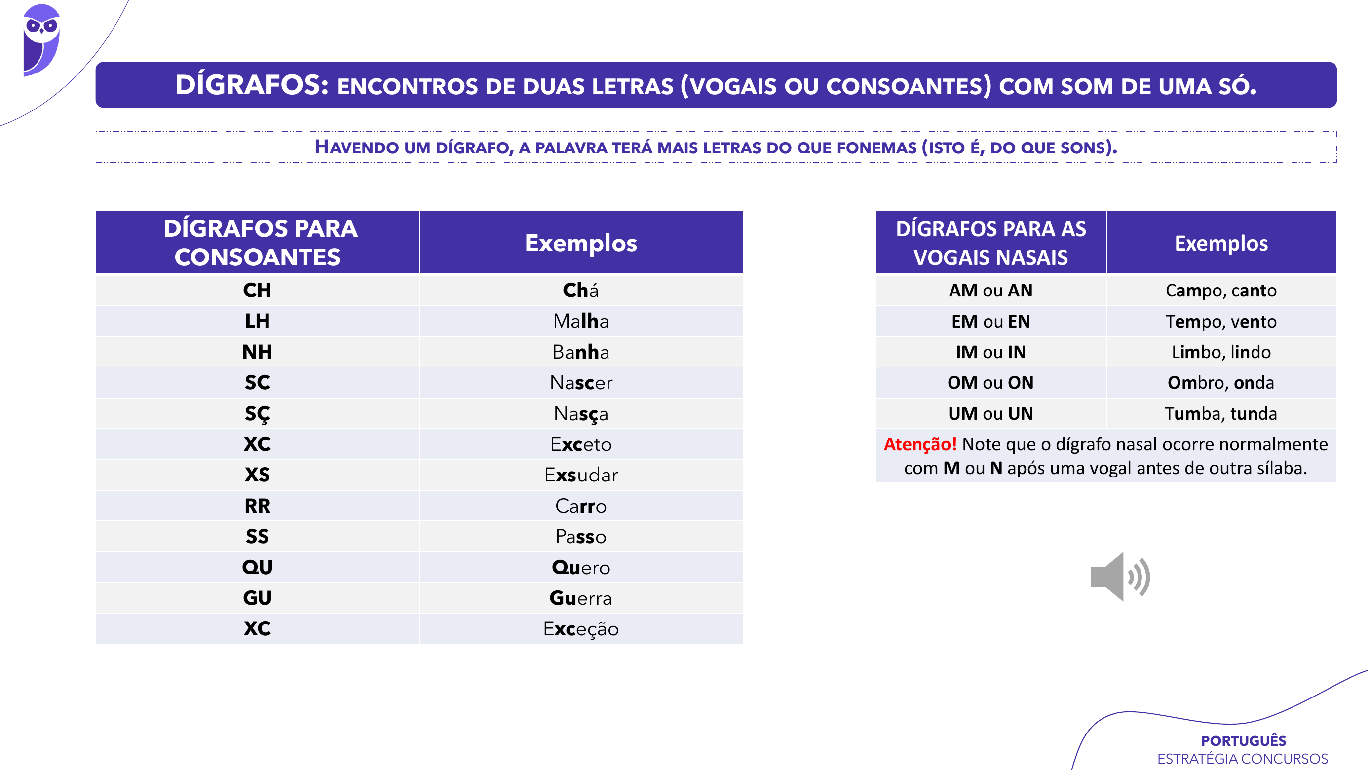 ESTRATÉGIA CONCURSOS PORTUGUÊS DÍGRAFOS: ENCONTROS DE DUAS LETRAS (VOGAIS OU CONSOANTES) COM SOM DE UMA SÓ. HAVENDO UM DÍGRAFO, A PALAVRA TERÁ MAIS LETRAS DO QUE FONEMAS (ISTO É, DO QUE SONS). DÍGRAFOS PARA CONSOANTES Exemplos CH Chá LH Malha NH Banha SC Nascer SÇ Nasça XC Exceto XS Exsudar RR Carro SS Passo QU Quero GU Guerra XC Exceção DÍGRAFOS PARA AS VOGAIS NASAIS Exemplos AM ou AN Campo, canto EM ou EN Tempo, vento IM ou IN Limbo, lindo OM ou ON Ombro, onda UM ou UN Tumba, tunda Atenção! Note que o dígrafo nasal ocorre normalmente com M ou N após uma vogal antes de outra sílaba. 07659029665 - JOÃO CARLOS FERREIRA DA CONCEIÇÃO ESTRATÉGIA CONCURSOS PORTUGUÊS ENCONTROS CONSONANTAIS: SEQUÊNCIA DE DOIS SONS CONSONANTAIS NUMA PALAVRA. ENCONTROS CONSONANTAIS HAVENDO UM ENCONTRO CONSONANTAL, CADA LETRA REPRESENTARÁ UM ÚNICO SOM. PODE OCORRER: • NA MESMA SÍLABA. EX: CLIMA, FLORES, PSICOSE, LETRA, PSEUDÔNIMO. • • EM SÍLABAS DIFERENTES. EX: ADVENTO, OBTUSO, FÚCSIA, ÉTNICO. 07659029665 - JOÃO CARLOS FERREIRA DA CONCEIÇÃO ESTRATÉGIA CONCURSOS PORTUGUÊS CONCEITOS CLASSIFICAÇÃO VOGAL (V): PRONUNCIADA COM MAIS INTENSIDADE. SEMIVOGAL (SV): PRONUNCIADA COM MENOS INTENSIDADE. DITONGO: (SV + V) OU (V + SV) DITONGOS ORAIS DITONGOS NASAIS Ditongo Crescente: sv + V precáriAs, históriA, primáriO, sériE enquAnto, cinquEnta Ditongo Decrescente: V + sv jóquEi, fóssEis, imóvEis, manAus cÂimbra, sótÃo, amAm, bebEm ENCONTROS VOCÁLICOS: ENCONTROS DE SONS VOCÁLICOS. NOS DITONGOS NASAIS O M, NO FINAL DA PALAVRA, FUNCIONA COMO SEMIVOGAL, POIS TEM SOM DE U OU I (“AMAM” E “BEBEM"). TRITONGO: SV + V + SV HIATO: V + V • EX: URUGUAI, IGUAIS, SAGUÃO, ÁGUAM, DESÁGUEM. ATENÇÃO! CADA SÍLABA DEVE TER UMA ÚNICA VOGAL; LOGO, O HIATO É O ENCONTRO DE DUAS VOGAIS EM SÍLABAS DIFERENTES. • EX: INCLUÍRAM, SAÚDE, PAÍSES, PREJUÍZO. (NOS ÚLTIMOS DOIS EXEMPLOS, O M FUNCIONA COMO SEMIVOGAL, POIS TEM SOM DE U E I) 07659029665 - JOÃO CARLOS FERREIRA DA CONCEIÇÃO ESTRATÉGIA CONCURSOS PORTUGUÊS REGRAS GERAIS DE ACENTUAÇÃO MONOSSÍLABOS TÔNICOS Primeira Regra Segunda Regra Monossílabos tônicos terminados em: A, E, O Monossílabos tônicos terminados em: ditongo aberto ÉU, ÉI, ÓI Pá, dá, cá, más Céu, véu Pé, ré, mês, dê Réis Dó, pó, só, nós Dói, sóis Nos dois casos podem ser seguidos ou não de S, pois o plural não afeta a regra. OXÍTONAS (Última sílaba da palavra é tônica) Oxítonas terminadas em A, E, O Oxítonas terminadas em ditongos abertos ÉU, ÉI, ÓI Oxítonas terminadas em EM, ENS (desde que haja 2 ou + sílabas) Sofá, gambá, Pará Chapéu, troféu Parabéns, armazéns Café, Tietê, português Papéis, fiéis Alguém, porém Avó, jiló, cipó, carijó Destrói, anzóis, Niterói, herói Mantém (singular) X mantêm (plural) 07659029665 - JOÃO CARLOS FERREIRA DA CONCEIÇÃO ESTRATÉGIA CONCURSOS PORTUGUÊS REGRAS GERAIS DE ACENTUAÇÃO PAROXÍTONAS (Penúltima sílaba da palavra é tônica) Regra Geral Regra Específica Acentuam-se todas paroxítonas exceto as terminadas em A, E, O, EM, ENS (pois essas são as terminações acentuadas das palavras oxítonas) Acentuam-se as PAROXÍTONAS terminadas em DITONGO ORAL Fácil, hífen, álbum, cadáver, álbuns, tórax, júri, lápis, vírus, bíceps, órfão, ímã, próton, Méier, destróier. Indivíduos, precárias, série, história, homogênea, médio, bromélia, imóveis, água, distância, primário, indústria, rádio, Brasília. ATENÇÃO! PAROXÍTONAS QUE TRAGAM DITONGO ABERTO EI, OI NÃO SÃO ACENTUADAS: OXÍTONAS QUE TRAGAM DITONGO ABERTO EI, OI SÃO ACENTUADAS. • EX: IDEIA, PLATEIA, ASSEMBLEIA, COLMEIA, HEROICO, PARANOICO, JIBOIA. • EX: ANÉIS, INFIÉIS, PAPÉIS, HERÓI, CORRÓI, CONSTRÓI. ATENÇÃO! HÍFEN: PALAVRA PAROXÍTONA TERMINADA POR EN => É ACENTUADA HIFENS: PALAVRA PAROXÍTONA TERMINADA EM ENS => NÃO É ACENTUADA. PROPAROXÍTONAS (Antepenúltima sílaba da palavra é tônica) Todas são acentuadas. (Essa regra prevalece sobre qualquer outra!) 07659029665 - JOÃO CARLOS FERREIRA DA CONCEIÇÃO ESTRATÉGIA CONCURSOS PORTUGUÊS REGRAS GERAIS DE ACENTUAÇÃO DO HIATO DEVEMOS ACENTUAR O I E O U TÔNICOS, EM HIATO, FORMANDO SÍLABA SOZINHA OU COM S.HIATOS • EX: CAÍ, FAÍSCA, PARAÍBA, EGOÍSTA, RUÍDO, SAÚDE, SAÚVA, BALAÚSTRE. EM SENTIDO CONTRÁRIO, NÃO POSSUEM ACENTO O I E O U TÔNICOS, EM HIATOS, QUANDO FORMAM SÍLABA COM LETRA QUE NÃO SEJA S. ESSA REGRA NÃO CONSIDERA A CLASSIFICAÇÃO TÔNICA, POIS VALE TANTO PARA OXÍTONAS (A-ÇA-Í) QUANTO PARA PAROXÍTONAS (SA-Ú-DE). • EX: CAIR, SAINDO, SAIU, RAUL, JUIZ. DECORE! NÃO POSSUEM ACENTO DECORE! POSSUEM ACENTO • GUAÍRA E GUAÍBA. • PIAUÍ, TEIÚ, TUIUIÚS. • FEIURA, BAIUCA, BOCAIUVA, SAUIPE. • HIATOS EEM E OO(S). EX: CREEM, DEEM, LEEM, ENJOO, VOO, DOO, ZOO. 07659029665 - JOÃO CARLOS FERREIRA DA CONCEIÇÃO ESTRATÉGIA CONCURSOS PORTUGUÊS ACENTOS DIFERENCIAIS ACENTOS DIFERENCIAIS • PÔDE (PRETÉRITO) X PODE (PRESENTE). • PÔR (VERBO) X POR (PREPOSIÇÃO). • VEM/TEM (3ª SINGULAR) X VÊM/TÊM (3ª PLURAL). • VERBO MANTER E DERIVADOS: MANTÉM (3ª SINGULAR) X MANTÊM (3ª PLURAL). • VERBO INTERVIR E DERIVADOS: INTERVÉM (3ª SINGULAR) X INTERVÊM (3ª PLURAL). • FACULTATIVO: FÔRMA (OBJETO) X FORMA (VERBO FORMAR) 07659029665 - JOÃO CARLOS FERREIRA DA CONCEIÇÃO ESTRATÉGIA CONCURSOS PORTUGUÊS EMPREGO DO HÍFEN USA-SE HÍFEN PARA SEPARAR LETRAS IGUAIS NA UNIÃO DE PREFIXOS A PALAVRAS. EX: MICRO-ONDAS, ANTI-INFLAMATÓRIO, CONTRA-ATAQUE, SUPER-RESISTENTE. NA UNIÃO DE DUAS PALAVRAS QUE FORMAM UMA UNIDADE DE SENTIDO PARTICULAR (CHAMADA ENCADEAMENTO). EX: PONTE RIO-NITERÓI; EIXO RIO-SÃO PAULO; PERCURSO CASA-TRABALHO. ANTES DE PALAVRA COM H. EX: ANTI-HIGIÊNICO, PRÉ-HISTÓRIA, SUPER-HOMEM, SUB-HEPÁTICO. COM OS PREFIXOS RECÉM, ALÉM, AQUÉM, SEM, EX, VICE. EX: RECÉM-NASCIDO, ALÉM-TÚMULO, SEM-TERRA, EX-PRESIDENTE, VICE- PRESIDENTE. COM OS PREFIXOS TÔNICOS PRÉ, PR