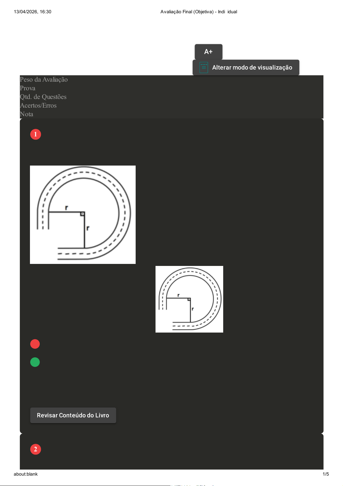 Prova Impressa GABARITO | Avaliação Final (Objetiva) - Individual (Cod.:1588269) Peso da Avaliação 4,00 Prova 117458662 Qtd. de Questões 10 Acertos/Erros 5/5 Nota 5,00 As curvas das estradas devem obedecer a critérios de angulação para que, no momento em que um veículo comece a fazer uma curva, o motorista não necessite fazer correções do decorrer do percurso, mantendo assim o volante em uma posição estável. A ilustração anexa representa uma curva com um raio de 100 m em uma certa rodovia. Assinale a alternativa CORRETA que apresenta o menor comprimento total desta curva: (dado pi = 3,14) A 314 m. B 471 m. C 157 m. D 253 m. Na prática, para se obter o conjugado de um número complexo, trocamos o sinal do coeficiente da parte imaginária. Então é correto dizer que, dois números complexos conjugados têm partes reais iguais. VOLTAR A+Aumentar, Fonte Alterar modo de visualização 1 Revisar Conteúdo do Livro 2 13/04/2026, 16:30 Avaliação Final (Objetiva) - Individual about:blank 1/5 Acerca de suas partes imaginárias como as mesmas podem ser denominadas? Assinale a alternativa CORRETA: A Nulas. B Reais. C Inversas. D Simétricas. Uma das primeiras utilizações do cálculo de área na antiguidade foi para repartir certas regiões (ou terrenos) em áreas de plantio. Se a área de um terreno quadrado foi medida e é igual a 128 m². Assinale a alternativa CORRETA que apresenta o comprimento da diagonal que divide este quadrado em dois triângulos iguais: A Mede 15 m. B Mede 13 m. C Mede 14 m. D Mede 16 m. Formulário - Trigonometria e Números Complexos (Paulo)Clique para baixar o anexo da questão Os quadrantes são usados para localizar pontos e a caracterização de ângulos trigonométricos. Por convenção, os pontos situados sobre os eixos não pertencem a qualquer um dos quadrantes. As extremidades dos ângulos de 20° e de 1430° pertencem, respectivamente:Acerca do resultado, assinale a alternativa CORRETA: A Aos quadrantes I e IV. B Aos quadrantes IV e III. C Aos quadrantes III e I. D Aos quadrantes I e II. Uma equação trigonométrica é uma equação contendo uma ou mais funções trigonométricas da variável trigonométrica. Resolver o valor de x significa encontrar os valores dos arcos trigonométricos cujas funções trigonométricas tornam a equação verdadeira. Sobre a Segunda Equação Fundamental, classifique Revisar Conteúdo do Livro 3 4 5 13/04/2026, 16:30 Avaliação Final (Objetiva) - Individual about:blank 2/5 V para as sentenças verdadeiras e F para as falsas: Assinale a alternativa que apresenta a sequência CORRETA: A V - V - V. B V - V - F. C F - F - V. D F - F - F. Nas funções periódicas, as funções seno e cosseno possuem o que chamamos de amplitude relacionada à imagem da função. Observando a representação gráfica da função a seguir, marcamos três pontos, dois pontos fixos A e B que estão sobre a abscissa e um ponto C móvel. Supondo que os três pontos formem um triângulo, qual a maior área possível? Assinale a alternativa CORRETA: A 4. B 8. C 6. D 2. 6 13/04/2026, 16:30 Avaliação Final (Objetiva) - Individual about:blank 3/5 Determine o valor de b para que o número complexo seja um número real.Acerca do resultado, assinale a alternativa CORRETA: A 0 B -2 C -1 D 2 Determine o oposto e o conjugado, respectivamente, do seguinte número complexo: z = - 2 + 5i Acerca do resultado, assinale a alternativa CORRETA: A - 2 - 5i e 2 - 5i B 2 - 5i e - 2 + 5i C 2 + 5i e - 2 + 5i D 2 - 5i e - 2 - 5i Para estudar as funções trigonométricas, deve-se estar bem preparado com os conhecimentos da circunferência trigonométrica, arcos e a definição das razões trigonométricas. Normalmente, o método para resolver problemas com equações trigonométricas é conseguir isolar a função trigonométrica por meio de artifícios algébricos e relações trigonométricas, para posteriormente compará-la a um certo valor. Quanto aos conjuntos que representam soluções para a equação a seguir, classifique V para as sentenças verdadeiras e F para as falsas: A V - V - F - F. 7 Revisar Conteúdo do Livro 8 9 13/04/2026, 16:30 Avaliação Final (Objetiva) - Individual about:blank 4/5 B F - F - V - V. C F - V - F - V. D V - F - F - V. Considerando os números complexos z = 12 - 3i e w = 15 + 2i, determine a diferença z - w.Acerca do resultado, assinale a alternativa CORRETA: A -5i B -3 + i C -3 - i D -3 - 5i Revisar Conteúdo do Livro 10 Revisar Conteúdo do Livro Imprimir 13/04/2026, 16:30 Avaliação Final (Objetiva) - Individual about:blank 5/5