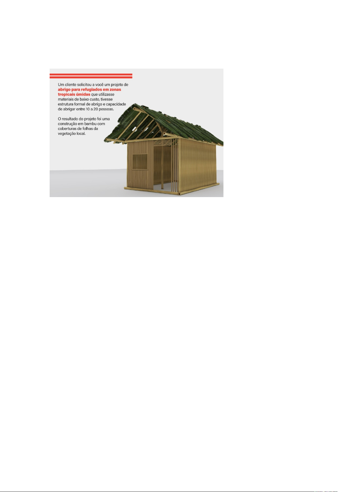 Desafio -Noções de abrigo Um abrigo deve ter estrutura formal simples, versátil e adaptável a diferentes topografias. Com base na solicitação do cliente e na escolha do projeto, descreva as características da estrutura formal de um abrigo. Minha resposta: O abrigo deve ter forma simples e clara, geralmente retangular ou modular, para facilitar a construção e adaptação em diferentes terrenos. Sua versatilidade permite ajustes conforme a topografia, podendo ser elevado sobre estacas em áreas úmidas. A cobertura precisa ser inclinada, feita com materiais locais como folhas, garantindo proteção contra chuvas intensas e favorecendo a ventilação cruzada. A estrutura em bambu assegura leveza, resistência e baixo custo, além de ser sustentável e de fácil montagem comunitária. Internamente, o espaço é coletivo e flexível, capaz de abrigar entre 10 e 20 pessoas, com possibilidade de subdivisões simples para maior privacidade. Em síntese, trata-se de uma construção funcional, adaptável, econômica e sustentável, projetada para oferecer proteção e dignidade em zonas tropicais úmidas. Padrão de resposta esperado Características da estrutura formal de um abrigo: Cobertura: protege do mau tempo. Estrutura: fácil de montar e de desmontar. Espaço: adaptável a diferentes necessidades. Materiais de baixo custo. Nesse caso, a construção, localizada em zonas tropicais úmidas, a deveria ser mais alta para que a altura isolasse o abrigo da umidade do solo. image1.jpeg