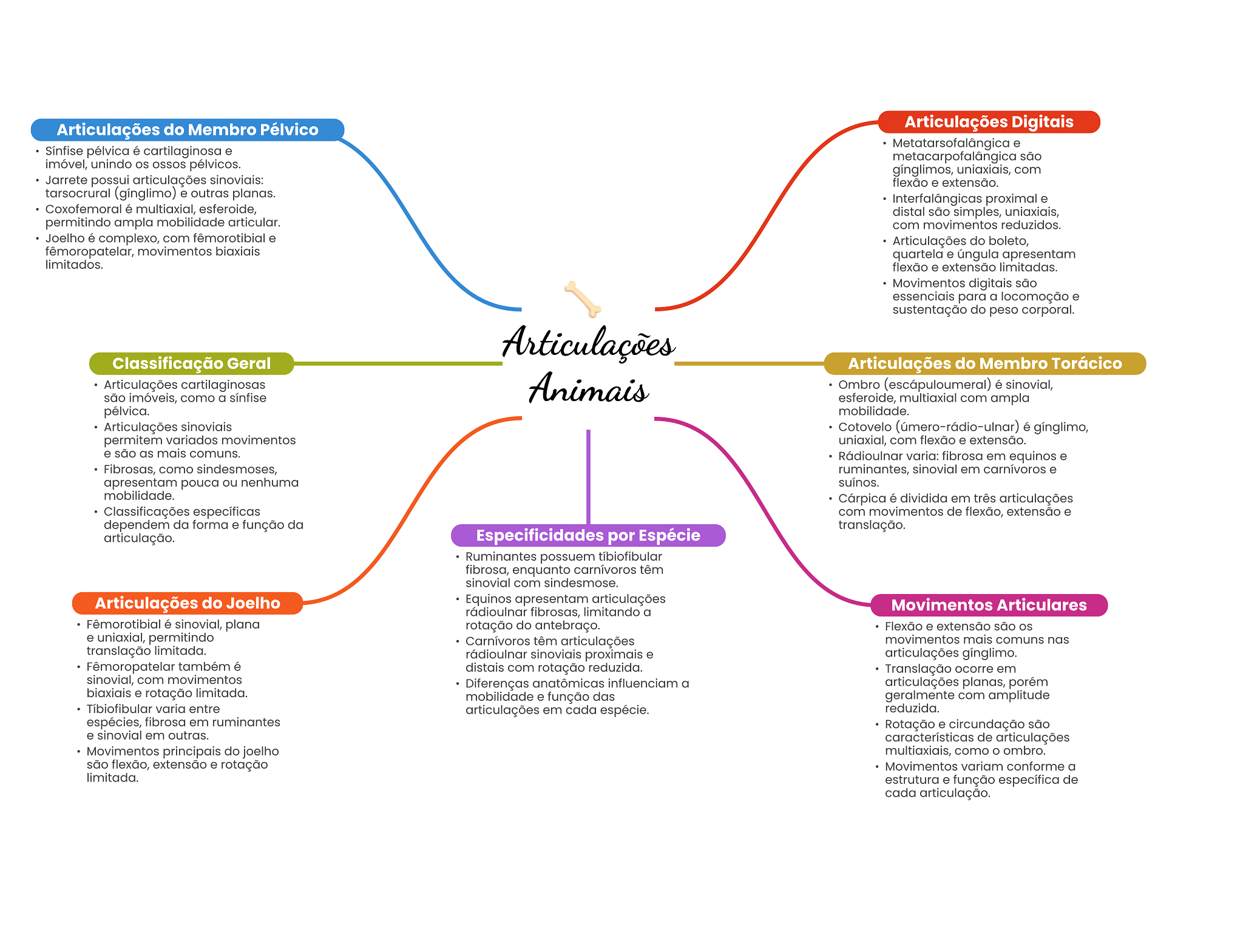 Articulações do Membro Pélvico Articulações Digitais Metatarsofalângica e Sínfise pélvica é cartilaginosa e metacarpofalângica são imóvel, unindo OSSOS pélvicos. gínglimos, uniaxiais, com Jarrete possui articulações sinoviais: flexão e extensão. tarsocrural (gínglimo) e outras planas. Interfalângicas proximal e Coxofemoral é multiaxial, esferoide, distal são simples, uniaxiais, permitindo ampla mobilidade articular. com movimentos reduzidos. Joelho é complexo, com fêmorotibial e Articulações do boleto, fêmoropatelar, movimentos biaxiais quartela e úngula apresentam limitados. flexão e extensão limitadas. Movimentos digitais são essenciais para a locomoção e sustentação do peso corporal. Articulações Classificação Geral Articulações do Membro Torácico Articulações cartilaginosas Animais Ombro (escápuloumeral) é sinovial, são imóveis, como a sínfise esferoide, multiaxial com ampla pélvica. mobilidade. Articulações sinoviais Cotovelo (úmero-rádio-ulnar) é gínglimo, permitem variados movimentos uniaxial, com flexão e extensão. e são as mais comuns. Rádioulnar varia: fibrosa em equinos e Fibrosas, como sindesmoses, ruminantes, sinovial em carnívoros e apresentam pouca ou nenhuma suínos. mobilidade. Cárpica é dividida em três articulações Classificações específicas com movimentos de flexão, extensão e dependem da forma e função da translação. articulação. Especificidades por Espécie Ruminantes possuem tíbiofibular fibrosa, enquanto carnívoros têm sinovial com sindesmose. Articulações do Joelho Equinos apresentam articulações Movimentos Articulares rádioulnar fibrosas, limitando a Fêmorotibial é sinovial, plana rotação do antebraço. Flexão e extensão são os e uniaxial, permitindo Carnívoros têm articulações movimentos mais comuns nas translação limitada. rádioulnar sinoviais proximais e articulações gínglimo. Fêmoropatelar também é distais com rotação reduzida. Translação ocorre em sinovial, com movimentos Diferenças anatômicas influenciam a articulações planas, porém biaxiais e rotação limitada. mobilidade e função das geralmente com amplitude Tíbiofibular varia entre articulações em cada espécie. reduzida. espécies, fibrosa em ruminantes Rotação e circundação são e sinovial em outras. características de articulações Movimentos principais do joelho multiaxiais, como ombro. são flexão, extensão e rotação Movimentos variam conforme a limitada. estrutura e função específica de cada articulação.