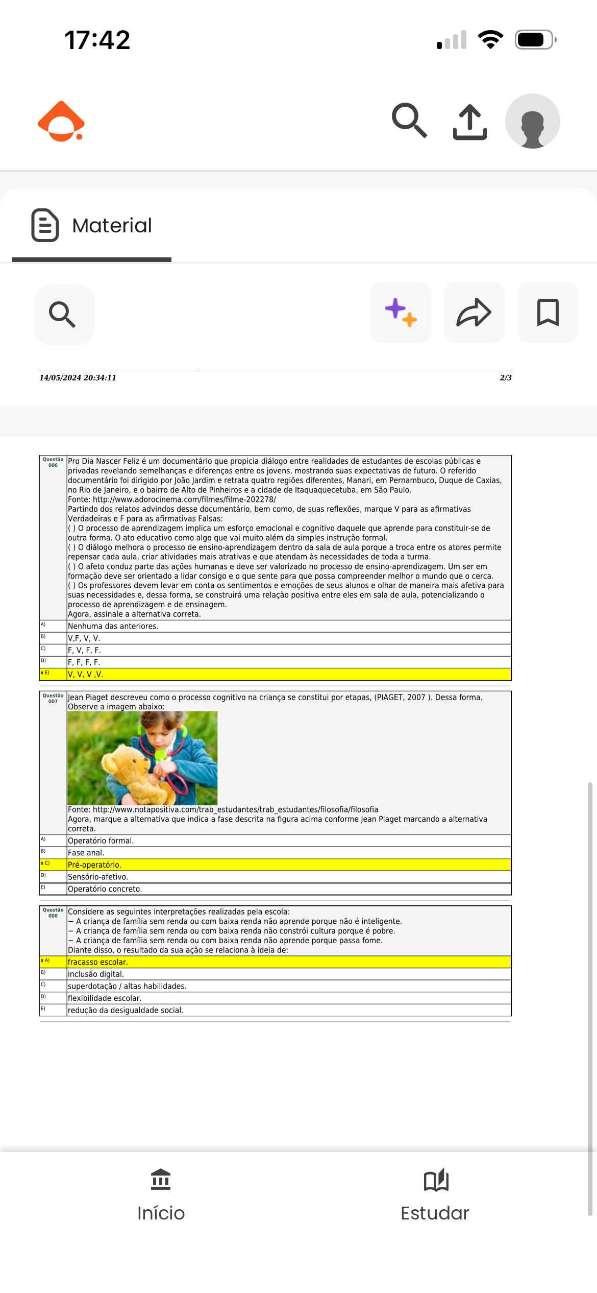 17:42 Material 14/05/2024 20:34:11 2/3 Questão Pro Dia Nascer Feliz é um documentário que propicia diálogo entre realidades de estudantes de escolas públicas e 006 privadas revelando semelhanças e diferenças entre jovens, mostrando suas expectativas de futuro. referido documentário foi dirigido por João Jardim e retrata quatro regiões diferentes, Manari, em Pernambuco, Duque de Caxias, no Rio de Janeiro, e bairro de Alto de Pinheiros e a cidade de em São Paulo. Fonte: Partindo dos relatos advindos desse documentário, bem como, de suas reflexões, marque V para as afirmativas Verdadeiras e F para as afirmativas Falsas: processo de aprendizagem implica um esforço emocional e cognitivo daquele que aprende para constituir-se de outra forma. ato educativo como algo que vai muito além da simples instrução formal. diálogo melhora processo de ensino-aprendizagem dentro da sala de aula porque a troca entre os atores permite repensar cada aula, criar atividades mais atrativas e que atendam às necessidades de toda a turma. afeto conduz parte das ações humanas e deve ser valorizado no processo de ensino-aprendizagem. Um ser em formação deve ser orientado a lidar consigo e que sente para que possa compreender melhor mundo que cerca. Os professores devem levar em conta sentimentos e emoções de seus alunos e olhar de maneira mais afetiva para suas necessidades e, dessa forma, se construirá uma relação positiva entre eles em sala de aula, potencializando processo de aprendizagem e de ensinagem. Agora, assinale a alternativa correta. A) Nenhuma das anteriores. B) C) D) Questão 007 Jean Piaget descreveu como processo cognitivo na criança se constitui por etapas, (PIAGET, 2007 ). Dessa forma. Observe a imagem abaixo: Fonte: Agora, marque a alternativa que indica a fase descrita na figura acima conforme Jean Piaget marcando a alternativa correta. A) Operatório formal. B) Fase anal. Pré-operatório D) Sensório-afetivo. E) Operatório concreto. Questão 008 Considere as seguintes interpretações realizadas pela escola: A criança de família sem renda ou com baixa renda não aprende porque não é inteligente. A criança de família sem renda ou com baixa renda não constrói cultura porque é pobre. A criança de família sem renda ou com baixa renda não aprende porque passa fome. Diante disso, resultado da sua ação se relaciona à ideia de: fracasso escolar B) inclusão digital. C) superdotação / altas habilidades. D) flexibilidade escolar. E) redução da desigualdade social. Início Estudar
