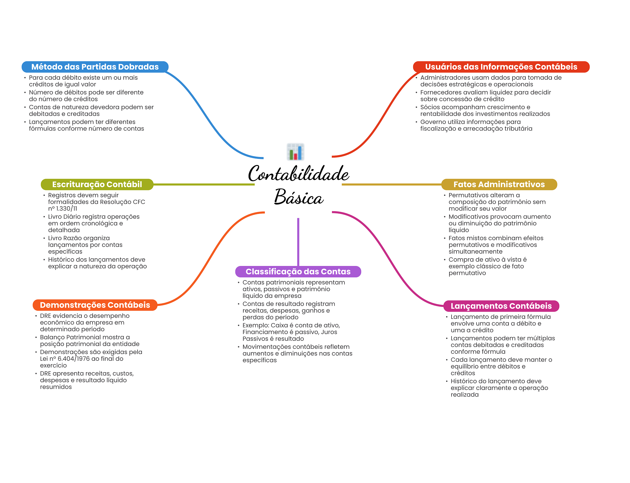 Método das Partidas Dobradas Usuários das Informações Contábeis Para cada débito existe um ou mais Administradores usam dados para tomada de créditos de igual valor decisões estratégicas e operacionais Número de débitos pode ser diferente Fornecedores avaliam liquidez para decidir do número de créditos sobre concessão de crédito Contas de natureza devedora podem ser Sócios acompanham crescimento e debitadas e creditadas rentabilidade dos investimentos realizados Lançamentos podem ter diferentes Governo utiliza informações para fórmulas conforme número de contas fiscalização e arrecadação tributária Contabilidade Escrituração Contábil Fatos Administrativos Registros devem seguir Básica Permutativos alteram a formalidades da Resolução CFC composição do patrimônio sem n° 1.330/11 modificar seu valor Livro Diário registra operações Modificativos provocam aumento em ordem cronológica e ou diminuição do patrimônio detalhada líquido Livro Razão organiza Fatos mistos combinam efeitos lançamentos por contas permutativos e modificativos específicas simultaneamente Histórico dos lançamentos deve Compra de ativo à vista é explicar a natureza da operação exemplo clássico de fato Classificação das Contas permutativo Contas patrimoniais representam ativos, passivos e patrimônio líquido da empresa Demonstrações Contábeis Contas de resultado registram Lançamentos Contábeis receitas, despesas, ganhos e DRE evidencia desempenho perdas do período Lançamento de primeira fórmula econômico da empresa em Exemplo: Caixa é conta de ativo, envolve uma conta a débito e determinado período Financiamento é passivo, Juros uma a crédito Balanço Patrimonial mostra a Passivos é resultado Lançamentos podem ter múltiplas posição patrimonial da entidade Movimentações contábeis refletem contas debitadas e creditadas Demonstrações são exigidas pela aumentos e diminuições nas contas conforme fórmula Lei n° 6.404/1976 ao final do específicas Cada lançamento deve manter exercício equilíbrio entre débitos e DRE apresenta receitas, custos, créditos despesas e resultado líquido Histórico do lançamento deve resumidos explicar claramente a operação realizada