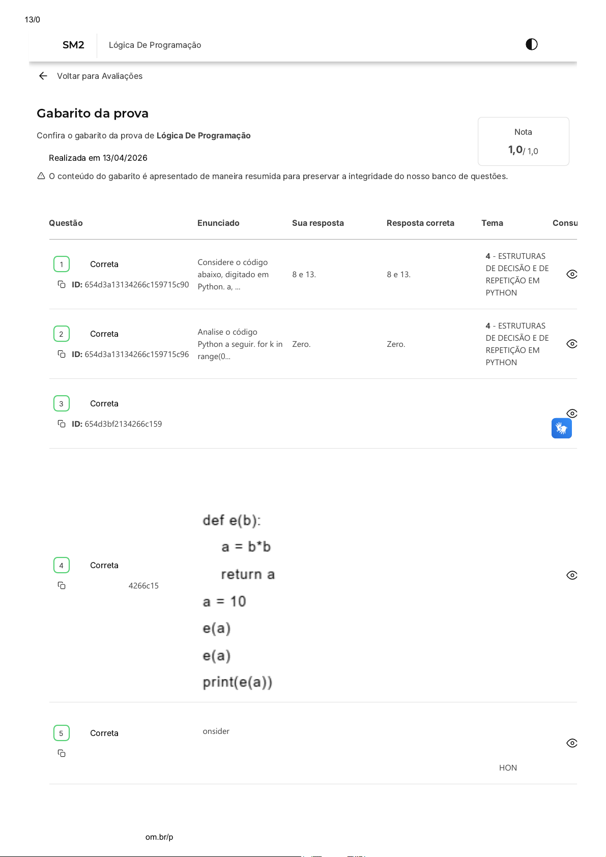 Voltar para Avaliações Gabarito da prova Confira o gabarito da prova de Lógica De Programação Realizada em 13/04/2026 Nota 1,0/ 1,0 O conteúdo do gabarito é apresentado de maneira resumida para preservar a integridade do nosso banco de questões. Questão Enunciado Sua resposta Resposta correta Tema Consu Correta ID: 654d3a13134266c159715c90 Considere o código abaixo, digitado em Python. a, ... 8 e 13. 8 e 13. 4 - ESTRUTURAS DE DECISÃO E DE REPETIÇÃO EM PYTHON Correta ID: 654d3a13134266c159715c96 Analise o código Python a seguir. for k in range(0... Zero. Zero. 4 - ESTRUTURAS DE DECISÃO E DE REPETIÇÃO EM PYTHON Correta ID: 654d3bf2134266c15973341b Observe o código abaixo em Python. a, b = 0, 1 w... 1 1 2 3 5 8. 1 1 2 3 5 8. 4 - ESTRUTURAS DE DECISÃO E DE REPETIÇÃO EM PYTHON Correta ID: 654d3a17134266c159715e61 Python é uma linguagem de programação de alto níve... 100 100 5 - MODULARIZAÇÃO E USO DE BIBLIOTECAS DE PYTHON Correta ID: 654d3a17134266c159715e73 Considere as afirmações relacionadas à reutilizaçã... Apenas I, III e IV estão corretas Apenas I, III e IV estão corretas 5 - MODULARIZAÇÃO E USO DE BIBLIOTECAS DE PYTHON 1 2 3 4 5 SM2 Lógica De Programação 13/04/2026, 18:22 estacio.saladeavaliacoes.com.br/prova/69dd5a71f7a010199997b840/gabarito/reduzido/ https://estacio.saladeavaliacoes.com.br/prova/69dd5a71f7a010199997b840/gabarito/reduzido/ 1/2 https://estacio.saladeavaliacoes.com.br/avaliacoes/ Correta ID: 654d3a13134266c159715c72 Verifique o código a seguir e responda: >>> conj... 10 10 6 - ESTRUTURAS DE DADOS BÁSICAS DO PYTHON Correta ID: 654d3a13134266c159715c48 Qual estrutura de dados utiliza a lógica LIFO (Las... Pilha Pilha 6 - ESTRUTURAS DE DADOS BÁSICAS DO PYTHON Correta ID: 654d3a13134266c159715c60 Dado a sequência de código Python3 abaixo, assinal... A variável j é uma tupla e a vari&aa... A variável j é uma tupla e a vari&aa... 6 - ESTRUTURAS DE DADOS BÁSICAS DO PYTHON Correta ID: 67fd776cd9585b4b23d8c9dc Na linguagem Python, os comandos L = range(0,12)... 0 1 2 3 4 5 6 7... 0 1 2 3 4 5 6 7... 4 - ESTRUTURAS DE DECISÃO E DE REPETIÇÃO EM PYTHON Correta ID: 679190a4c6113e941bee96d0 Observe a função print do cód... 24 24 5 - MODULARIZAÇÃO E USO DE BIBLIOTECAS DE PYTHON 6 7 8 9 10 Encontrou algum problema? Você pode copiar o ID da questão e abrir um requerimento. Na tela inicial do Campus Virtual (SIA), acesse "Atendimento > Requerimento > Novo > Currículo/Aula/horário > Analisar ambiente de avaliação/exercícios" 13/04/2026, 18:22 estacio.saladeavaliacoes.com.br/prova/69dd5a71f7a010199997b840/gabarito/reduzido/ https://estacio.saladeavaliacoes.com.br/prova/69dd5a71f7a010199997b840/gabarito/reduzido/ 2/2