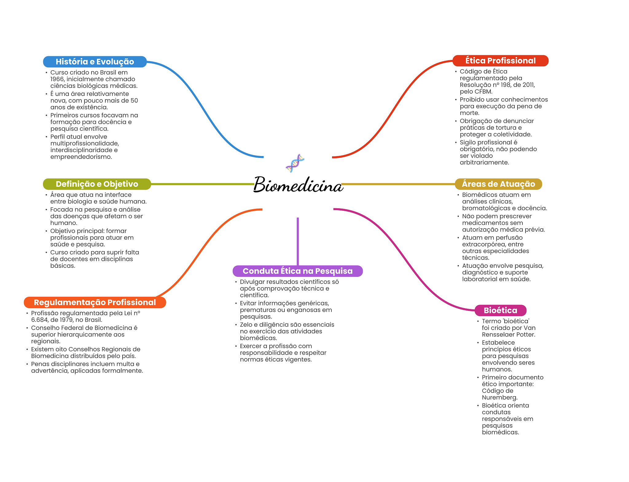 História e Evolução Ética Profissional Curso criado no Brasil em Código de Ética 1966, inicialmente chamado regulamentado pela ciências biológicas médicas. Resolução n° 198, de 2011, É uma área relativamente pelo CFBM. nova, com pouco mais de 50 Proibido usar conhecimentos anos de existência. para execução da pena de Primeiros cursos focavam na morte. formação para docência e Obrigação de denunciar pesquisa científica. práticas de tortura e Perfil atual envolve proteger a coletividade. multiprofissionalidade, Sigilo profissional é e obrigatório, não podendo empreendedorismo. ser violado arbitrariamente. Definição e Objetivo Biomedicina Áreas de Atuação Área que atua na interface Biomédicos atuam em entre biologia e saúde humana. análises clínicas, Focada na pesquisa e análise bromatológicas e docência. das doenças que afetam ser Não podem prescrever humano. medicamentos sem Objetivo principal: formar autorização médica prévia. profissionais para atuar em Atuam em perfusão saúde e pesquisa. extracorpórea, entre Curso criado para suprir falta outras especialidades de docentes em disciplinas técnicas. básicas. Atuação envolve pesquisa, Conduta Ética na Pesquisa diagnóstico e suporte Divulgar resultados científicos só laboratorial em saúde. após comprovação técnica e científica. Regulamentação Profissional Evitar informações genéricas, Profissão regulamentada pela Lei n° prematuras ou enganosas em Bioética 6.684, de 1979, no Brasil. pesquisas. Termo 'bioética' Conselho Federal de Biomedicina é Zelo e diligência são essenciais no exercício das atividades foi criado por Van superior hierarquicamente aos Rensselaer Potter. biomédicas. regionais. Estabelece Existem oito Conselhos Regionais de Exercer a profissão com Biomedicina distribuídos pelo país. responsabilidade e respeitar princípios éticos normas éticas vigentes. para pesquisas Penas disciplinares incluem multa e envolvendo seres advertência, aplicadas formalmente. humanos. Primeiro documento ético importante: Código de Nuremberg. Bioética orienta condutas responsáveis em pesquisas biomédicas.
