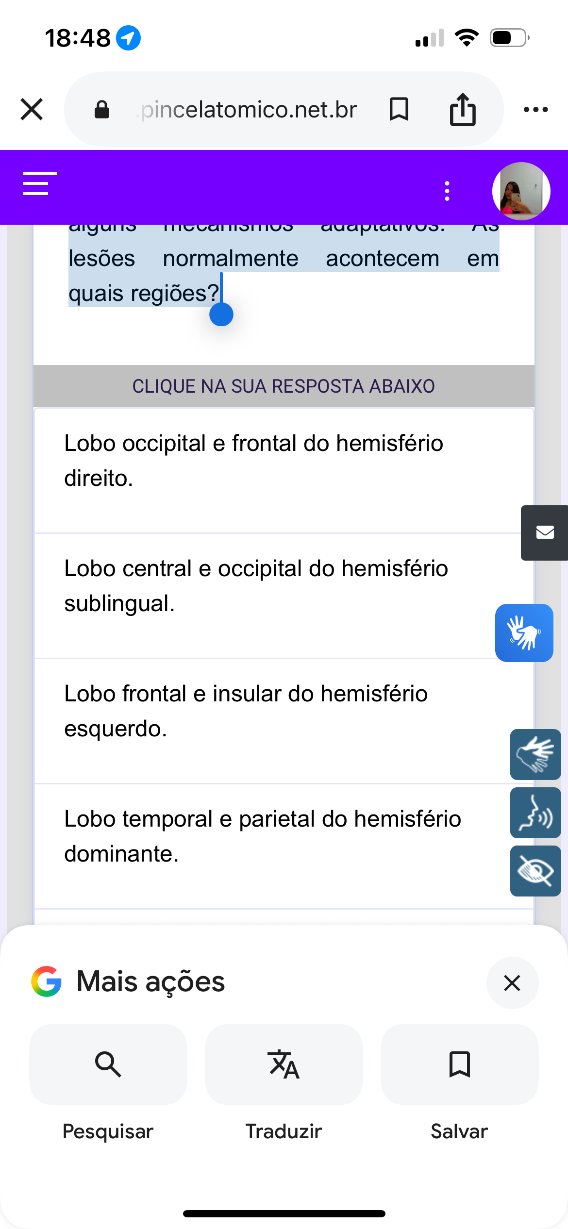 18:48 X pincelatomico.net.br ... mecanismos AS lesões normalmente acontecem em quais regiões? CLIQUE NA SUA RESPOSTA ABAIXO Lobo occipital e frontal do hemisfério direito. Lobo central e occipital do hemisfério sublingual. Lobo frontal e insular do hemisfério esquerdo. Lobo temporal e parietal do hemisfério dominante. Mais ações X XA Pesquisar Traduzir Salvar