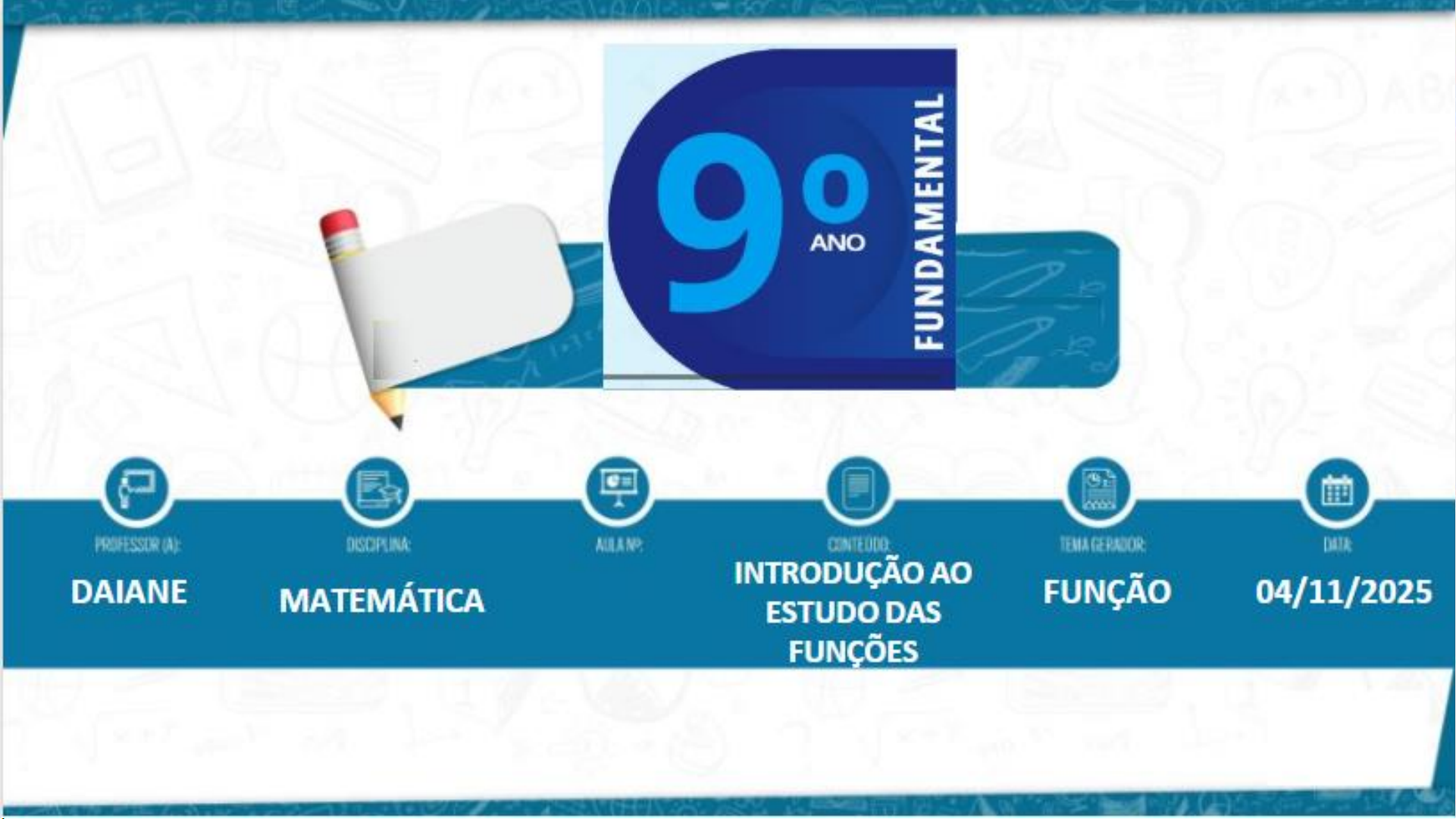 MATEMÁTICADAIANE INTRODUÇÃO AO ESTUDO DAS FUNÇÕES FUNÇÃO 04/11/2025 Afinal, o que é função de que? 2 A distância percorrida por uma bicicleta pode ser escrita em função do número de pedaladas executadas pelo ciclista. A expressão “em função” indica que os valores das grandezas mencionadas estão de algum modo relacionados. Vamos pensar um pouco! A ideia da função no cotidiano Vamos imaginar a seguinte situação: Situação Preço do litro da gasolina R$ 5,00 NÚMERO DE LITROS VALOR PAGO R$ 2 5 8 ➔ Temos aqui uma relação entre duas grandezas NÚMERO DE LITROS X VALOR PAGO 3 Preço do litro da gasolina R$ 5,00 NÚMERO DE LITROS VALOR PAGO R$ 2 10 5 25 8 40 Também podemos representar essa relação por meio de diagramas 2 5 5 8 10 25 40 A B Número de litros Valor pago 2 5 8 10 25 40 A B Número de litros Valor pago x y = f(x) A B f : A→ B A definição matemática de função Considerando dois conjuntos, A e B, não-vazios, dizemos que f é uma função de A em B (ou que y é uma função de x) se, e somente se, para cada elemento x de A, existe em correspondência um único elemento y de B. Notação: 5 Considerando dois conjuntos, A e B, não-vazios, dizemos que f é uma função de A em B (ou que y é uma função de x) se, e somente se, para cada elemento x de A, existe em correspondência um único elemento y de B. A definição matemática de função 2 5 6 8 10 25 40 A B Slide 1 Slide 2: Afinal, o que é função de que? Slide 3: A ideia da função no cotidiano Slide 4: Preço do litro da gasolina R$ 5,00 Slide 5 Slide 6: A definição matemática de função Slide 7 Slide 8