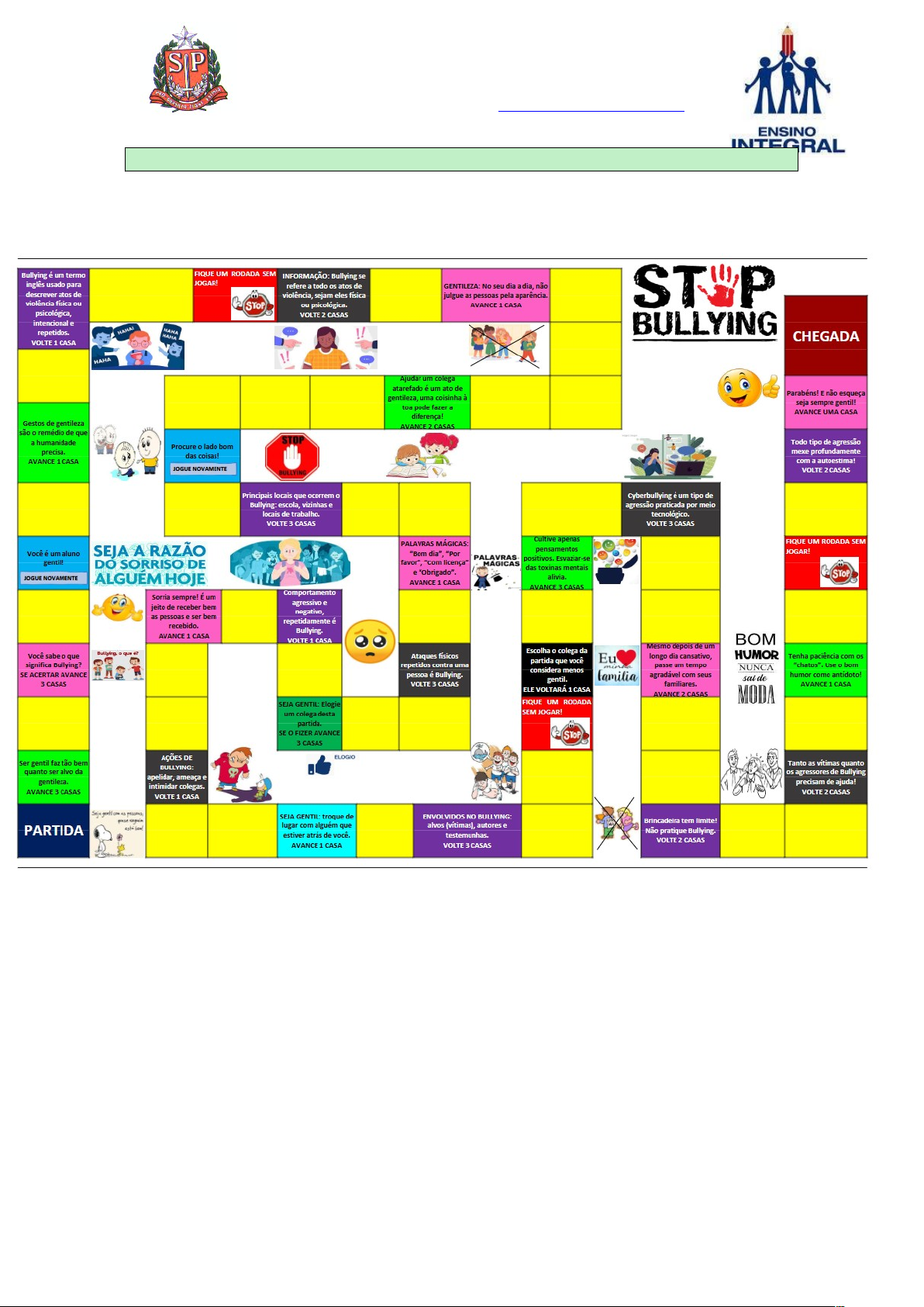 GOVERNO DO ESTADO DE SÃO PAULO SECRETARIA DE ESTADO DA EDUCAÇÃO UNIDADE REGIONAL DE ENSINO DE GUARATINGUETÁ EE Dr. Casemiro da Rocha Praça do Rosário, 205 – Centro | CEP 12530-000 Telefone (12) 3111-1313 | E-mail: e012798p@educacao.sp.gov.br TUTORIA COLETIVA Objetivo Desenvolver através de um jogo a noção do que é Bullying, e o que podemos fazer para evitar. image1.png image2.png image3.jpeg