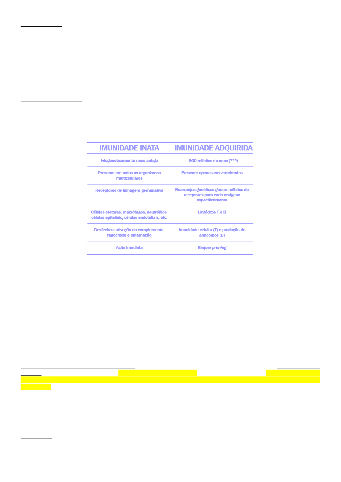 ED IMUNLOGIA 1) Compare imunidade inata e adaptativa quanto a sua especificidade, diversidade e padrão de expressão dos seus receptores. Imunidade inata: reações iniciais com mecanismos que já existiam antes do estabelecimento da situação a ser combatida. É uma resposta pronta para agir, não tem memória e não é específica (responde essencialmente da mesma maneira para qualquer caso); mas é necessária para a adquirida ser ativada. Natureza dos receptores: há as células (fagocitárias e “Natural Killer”), proteínas do sangue (ex. complemento), citocinas e as barreiras celulares e químicas (pele, epitélio das mucosas, substâncias antimicrobianas). Imunidade adaptativa: respostas tardias que se constitui de um mecanismo que demora para agir, mas tem memória e é específico. O desenvolvimento da memória irá garantir à imunidade adquirida o aumento na magnitude e capacidade defensiva em exposições posteriores ao mesmo antígeno. Natureza dos receptores: células (linfócitos) e anticorpos. Todas essas células são oriundas dos leucócitos, sendo geradas na medula óssea. A ativação do sistema imunológico ocorre por padrões moleculares não próprios, padrões moleculares próprios alterados e sinais de perigo (presença de certas moléculas e certos espaços que indicam o dano tecidual, por exemplo ATP em espaço extracelular). O sistema imunológico é nômade: suas células estão em constante circulação, pois seu papel é de vigilância. Ele é regulado pelo tipo e pela potência da resposta. A geração da resposta imune causa danos, destacando a importância da regulação. 2) Explique a importância dos PRRs na ativação da resposta imune? O sistema imunológico natural reconhece apenas um número limitado de estruturas, sendo estimulado por substâncias oriundas de microrganismos chamadas de PAMPs (padrões moleculares associados a patógenos), as quais estão presentes apenas nos patógenos. Os PAMPs são estruturas comuns a muitos microrganismos e que estão ausentes nas células do hospedeiro. Os receptores que se ligam a essas estruturas são denominados receptores de reconhecimento de padrões (PRRs), dividindo-se principalmente em receptores toll-like, RLRs e nod-like. Esses receptores também reconhecem sinais de perido (“moléculas próprias”) e estão presentes em todos os tipos celulares, permitindo que virtualmente todas as células do organismo possam iniciar o processo inflamatório. Os PRRs não são receptores antigênicos, isto é, não se ligam especificamente a um único antígeno. 3) Descreva os principais mecanismos microbicidas de macrófagos e neutrófilos. Macrófagos: especializados em fagocitose; produzem citosinas, podem apresentar antígenos, fagocitam e fazem “faxina” dos restos celulares. As funções efetoras dessas células ativadas são: morte de micróbios, inflamação, aumento da imunidade adaptativa, remodelamento tecidual, aumento da apresentação de antígenos. Neutrófilos: normalmente são as primeiras células a chegar no local da inflamação, atraídas por IL-8 e C5a (fator do complemento), são os leucócitos mais abundantes. São excelentes fagócitos. Possuem diversos grânulos específicos (acúmulo de enzimas com atividade antimicrobiana, de degradação de patógenos, remodelamento tecidual e envolvidas na produção de microbicidas). A degranulação dos neutrófilos (exocitose) é importante para a eliminação de patógenos, mas produz grande dano tecidual no sítio de inflamação. 4) Explique os principais eventos da inflamação aguda e da resolução da inflamação. Gama de alterações fisiológicas e metabólicas que se iniciam imediatamente após uma injúria tecidual (infecção, reação alérgica ou imunológica, trauma mecânico ou térmico, neoplasia, isquemia ou procedimento cirúrgico). Entre as inúmeras manifestações sistêmicas desta reação de fase aguda está a alteração nas concentrações de várias proteínas plasmáticas, que são denominadas de "proteínas de fase aguda". Ex.: pentraxinas. A produção destas proteínas está sob a regulação de um grande número de citocinas (ex. IL-6, IL-1, TNFα), as quais são produzidas pelas células injuriadas, mas atingem a circulação sistêmica, tendo ação em alguns órgãos. Mais localmente, as citosinas vão atuar nas CD estimulando sua maturação → apresentação de antígeno → iniciação da resposta imune adaptativa. Os neutrófilos e monócitos são recrutados do sangue para o local da inflamação por ligação a moléculas de adesão nas células endoteliais e por quimioatraentes produzidos em resposta à injuria tecidual. Após a ativação do endotélio leva a uma expressão diferencial de moléculas de adesão em sua superfície. É importante destacar que o processo de recrutamento de leucócitos só é possível porque o tecido inflamado expressa moléculas de superfície que o tecido não inflamado não expressa. Rolamento: em resposta aos micróbios e a citocinas produzidas pelas células do tecido inflamado, as células endoteliais tem sua expressão de selectinas na superfície aumentadas (selectinas P e E) assim como os leucócitos também tem sua expressão de selectina L e de ligantes para as selectinas (“Sulfated syalil-Lewis” – glicoproteínas sulfatadas nas membranas de leucócitos) das células endoteliais alterada. As interações selectina-ligante são de baixa afinidade. Assim, os leucócitos repetitivamente se destacam e se ligam novamente, rolando sobre o endotélio. O rolamento permite um maior contato entre leucócitos e endotélio. Adesão: ligação forte e estável dos leucócitos ao endotélio mediada por moléculas de adesão. Os leucócitos expressam as integrinas, as quais tem sua afinidade pelos seus ligantes aumentadas em situações de ativação dos leucócitos (ação de quimiocinas, ex. IL-8). A expressão endotelial de ligantes das integrinas (principalmen