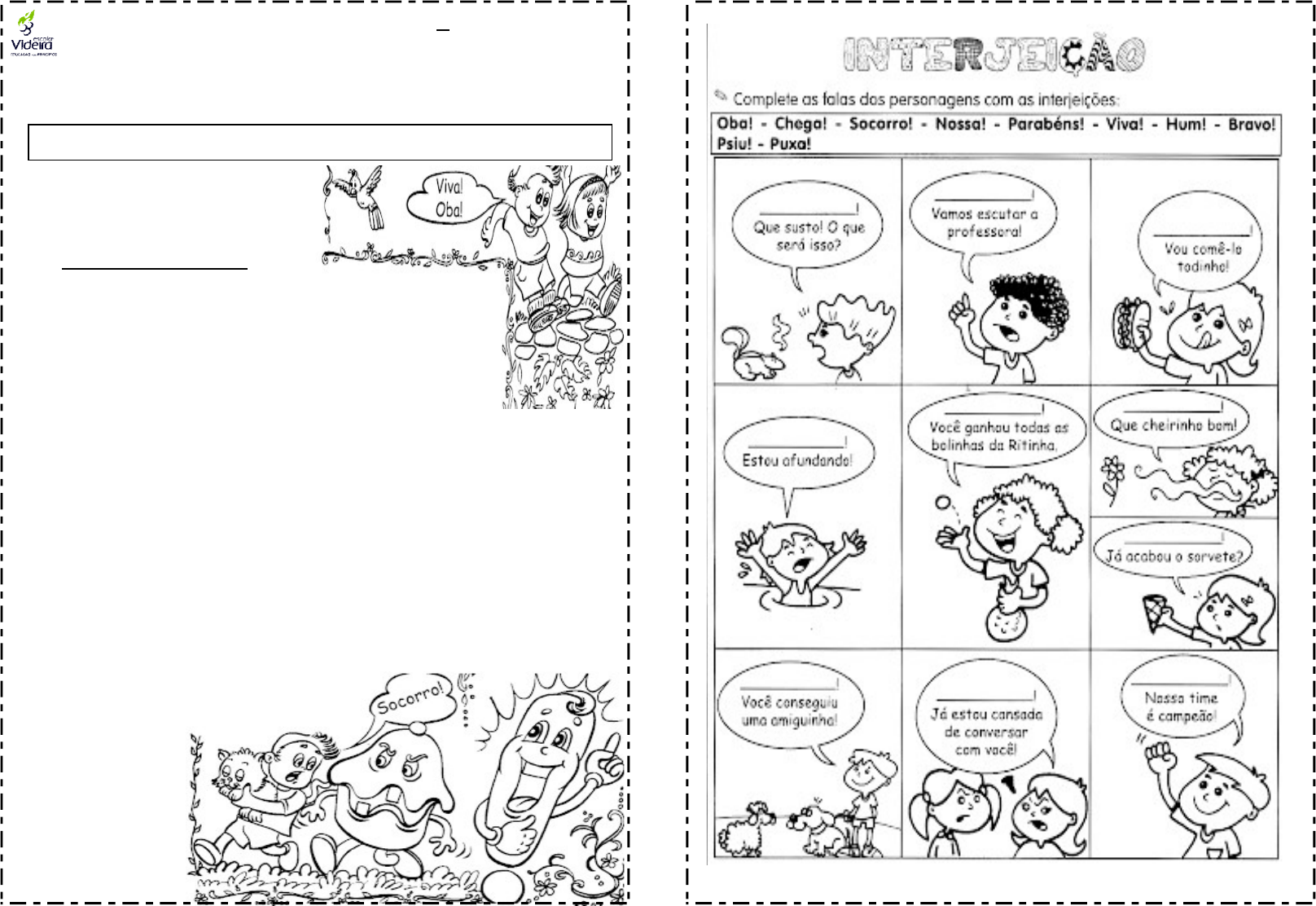 Língua Portuguesa (4o ano) “O Senhor será a tua luz perpétua”. (Isaías 60:20) INTERJEIÇÕES Algumas interjeições: Aclamação: Viva! Advertência: Atenção! Cuidado! Devagar! Calma! Agradecimento: Obrigado! Alegria: Oba! Ó! Aleluia! Alívio: Ah! Ufa! Aplauso: Parabéns! Ótimo! Bravo! Viva! Concordância: Claro! Ótimo! Sim! Desapontamento: Ah! Ué! Dor: Ai! Ui! Espanto: Quê? Puxa! Pedido: Ei! Psiu! Socorro! Alô! Saudação: Olá! Silêncio: Psiu! Psit! Silêncio! Interjeição é a palavra que expressa um sentimento ou emoção. ATIVIDADE 1. Identifique as interjeições e as locuções interjetivas das frases. a) ____! Meu dinheiro acabou... b) _____________, rapazes! c) _______________! Você pode se machucar! d) ___________, crianças! e) _______! É meu pé que está embaixo! f) ____________! Que miséria! g) ____________, se não fizer a lição! 2. Elabore cinco frases utilizando interjeições ou locuções interjetivas. ________________________________________________________ ________________________________________________________ ________________________________________________________ ________________________________________________________ 3. Identifique as interjeições e classifique-as conforme os sentimentos ou emoções que exprimem. a) Obrigada, é muita gentileza de sua parte. ________________________________________________________ ________________________________________________________ b) Ufa! Até que enfim terminamos o trabalho! ________________________________________________________ c) Ah! Você aqui a esta hora! ________________________________________________________ d) Puxa! Pensei que não viesse mais. ________________________________________________________ e) Calma, que tudo acabará bem. ________________________________________________________ f) Ora! Não foi assim que eu expliquei a questão. ________________________________________________________ g) Ih, que bagunça está aqui! ________________________________________________________ 4. Sublinhe a interjeição, relacionando-a às emoções do quadro abaixo: Alegria – aborrecimento – saudação – desejo – advertência – admiração. a) Caramba! Como ela samba! ________________________________________________________ b) Cuidado! Trecho sem acostamento! ________________________________________________________ c) Oxalá os pais saibam compreendê-lo ________________________________________________________ d) Olá! Como passou a noite? ________________________________________________________ e) Oba, as férias estão aí. f) Xi! Esse cara aqui de novo. ________________________________________________________
