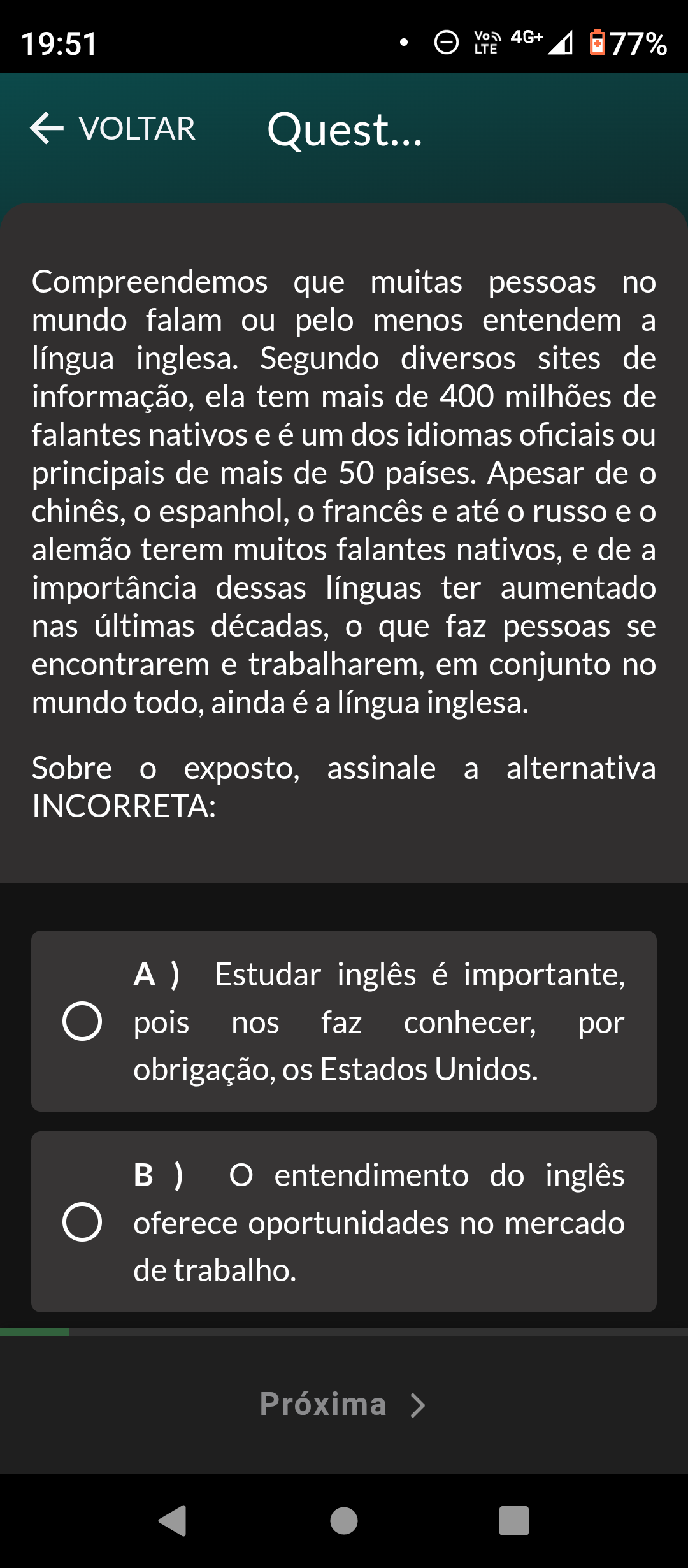 19:51 4G+ LTE 77% VOLTAR Quest... Compreendemos que muitas pessoas no mundo falam ou pelo menos entendem língua inglesa. Segundo diversos sites de informação, ela tem mais de 400 milhões de falantes nativos e é um dos idiomas oficiais ou principais de mais de 50 países. Apesar de chinês, espanhol, francês e até russo e alemão terem muitos falantes nativos, e de a importância dessas línguas ter aumentado nas últimas décadas, que faz pessoas se encontrarem e trabalharem, em conjunto no mundo todo, ainda é a língua inglesa. Sobre exposto, assinale a alternativa INCORRETA: Estudar inglês é importante, pois nos faz conhecer, por obrigação, os Estados Unidos. entendimento do inglês oferece oportunidades no mercado de trabalho. Próxima >