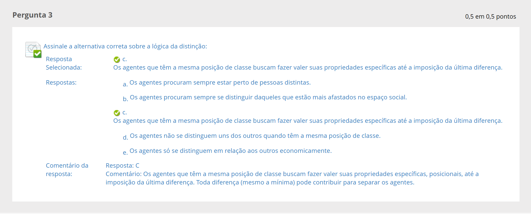 Pergunta 3 0,5 em 0,5 pontos Assinale a alternativa correta sobre a lógica da distinção: Resposta C. Selecionada: Os agentes que têm a mesma posição de classe buscam fazer valer suas propriedades específicas até a imposição da última diferença. Respostas: a. Os agentes procuram sempre estar perto de pessoas distintas. b. Os agentes procuram sempre se distinguir daqueles que estão mais afastados no espaço social. C. Os agentes que têm a mesma posição de classe buscam fazer valer suas propriedades específicas até a imposição da última diferença. d. Os agentes não se distinguem uns dos outros quando têm a mesma posição de classe. e. Os agentes só se distinguem em relação aos outros Comentário da Resposta: resposta: Comentário: Os agentes que têm a mesma posição de classe buscam fazer valer suas propriedades específicas, posicionais, até a imposição da última diferença. Toda diferença (mesmo a mínima) pode contribuir para separar os agentes.